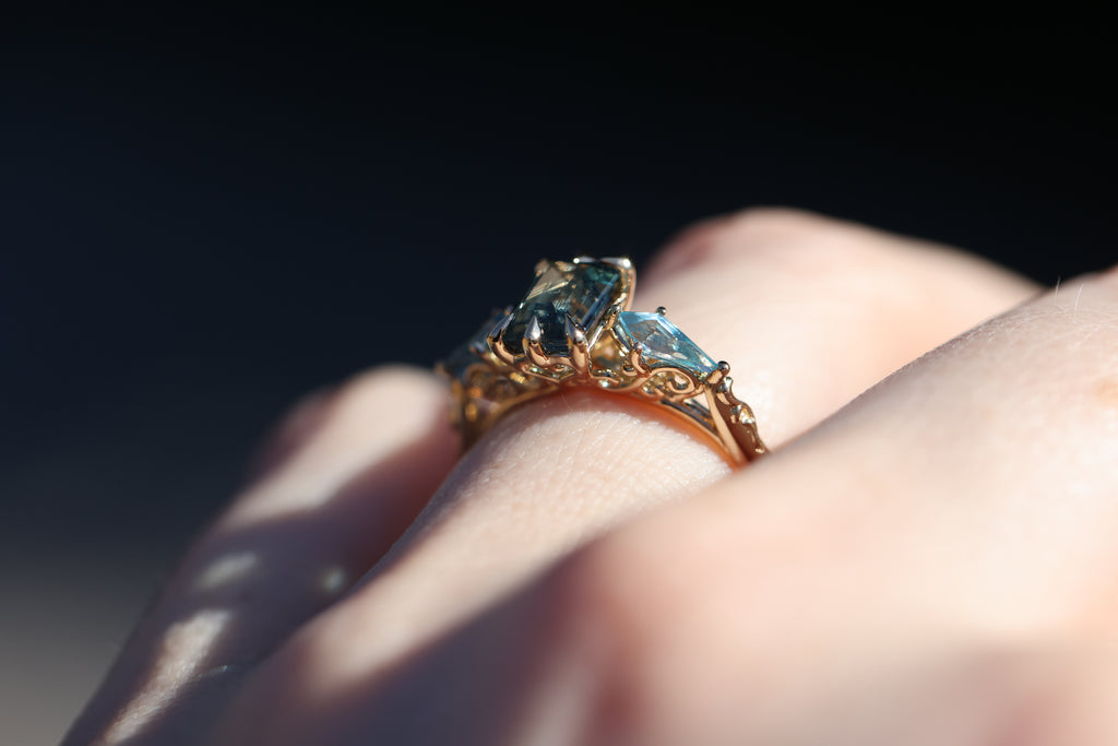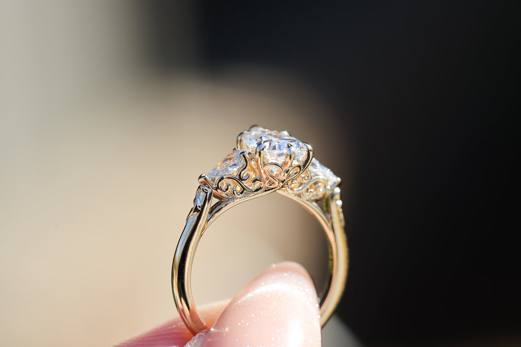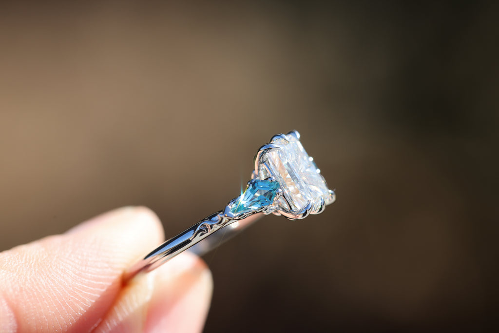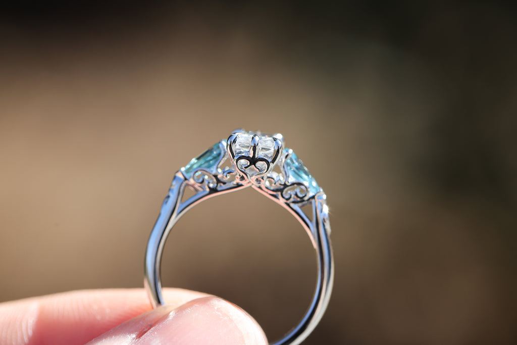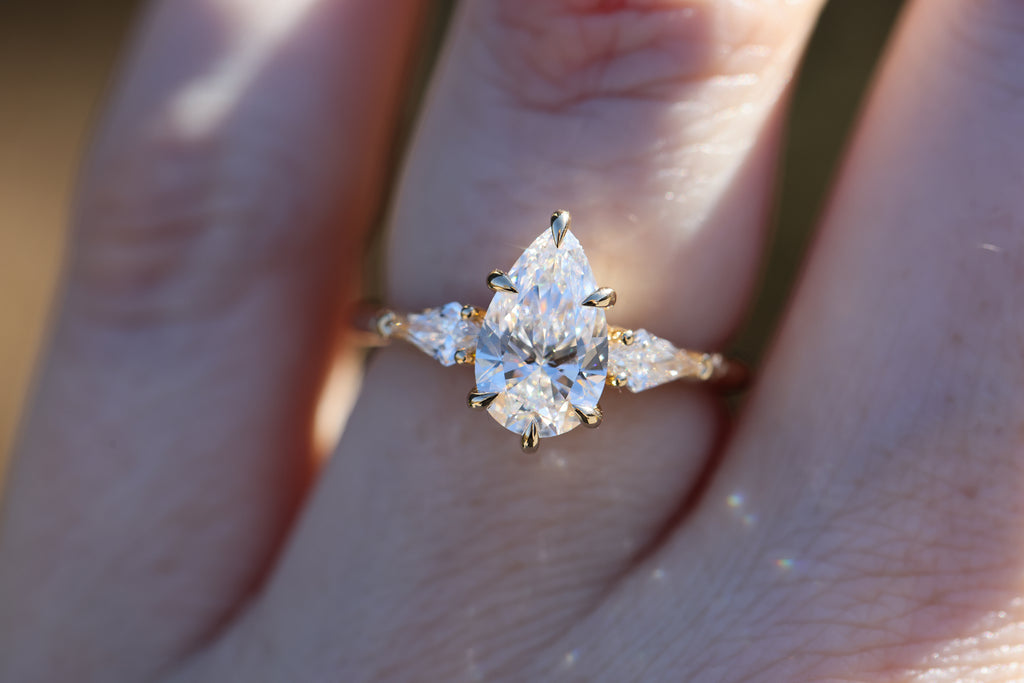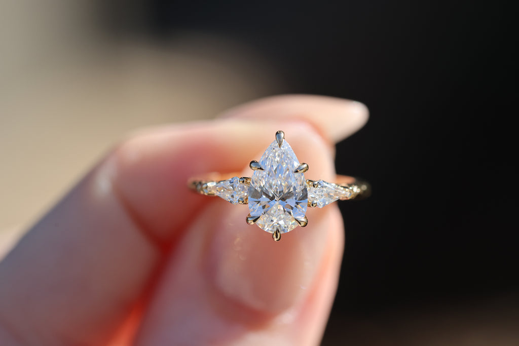 - Two, 5x2.5mm kite cut side stones. For some stone sizes I will select 6x3mm for your stone. (Can be done with pear or marquise side stones, please email!)