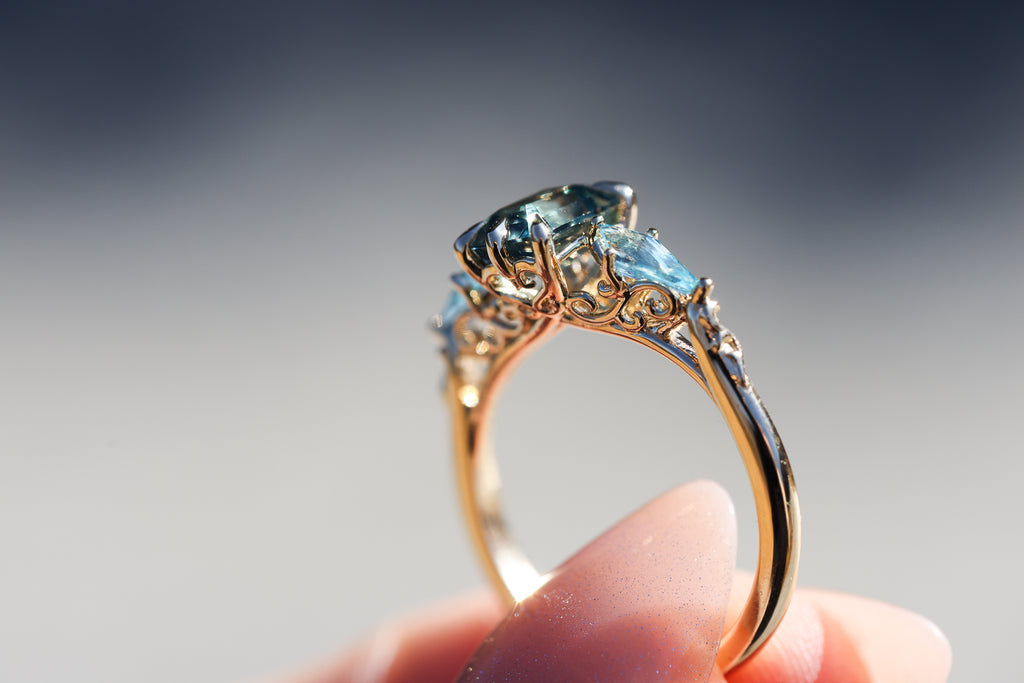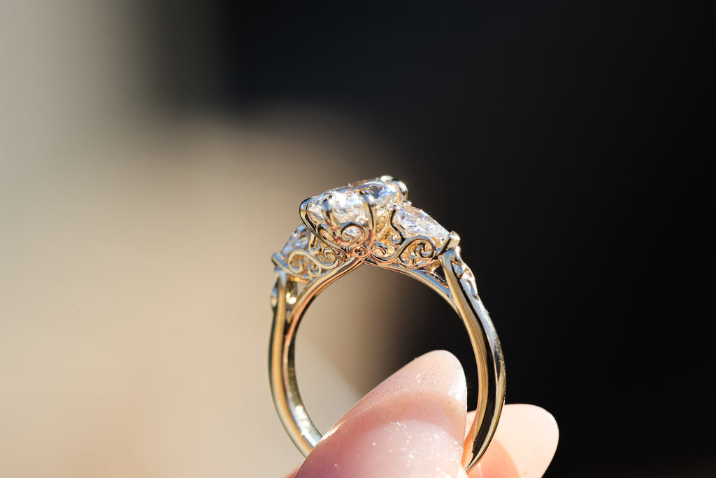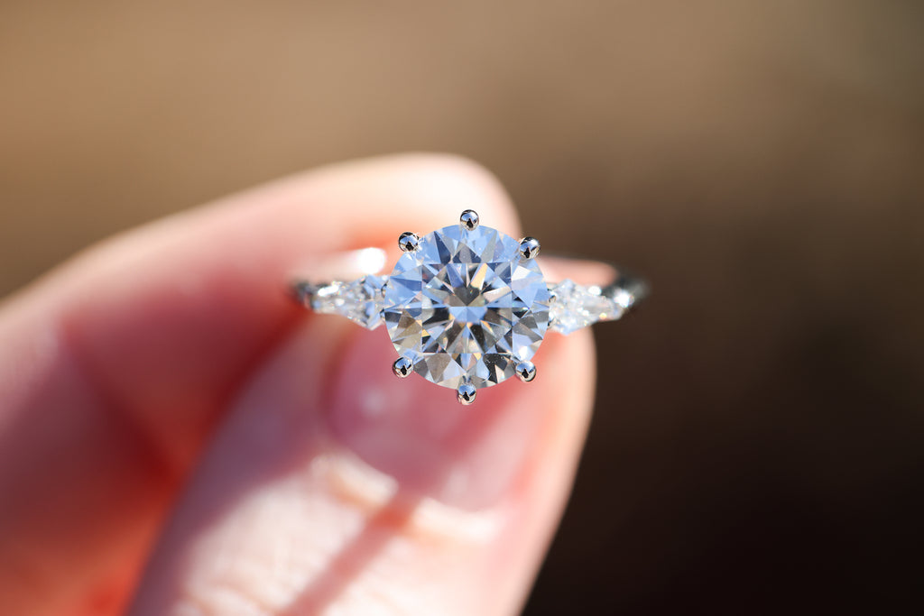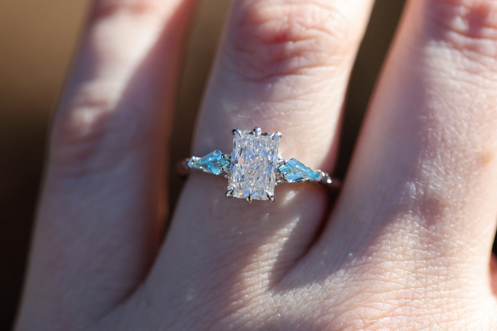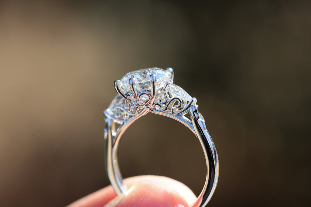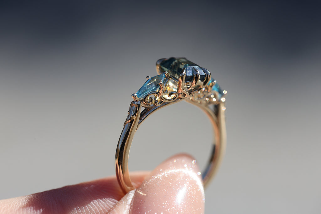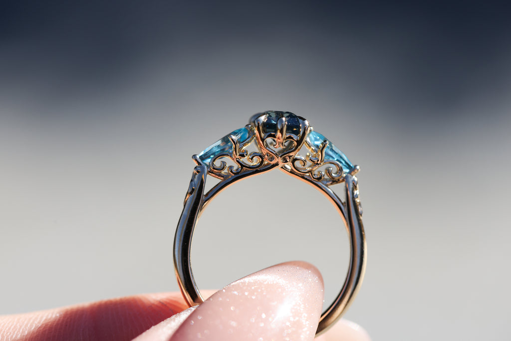 - Two, 5x2.5mm kite cut side stones. For some stone sizes I will select 6x3mm for your stone. (Can be done with pear or marquise side stones, please email!)