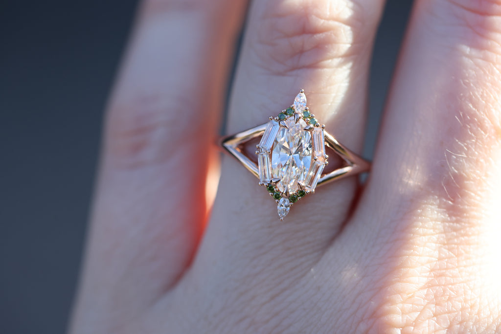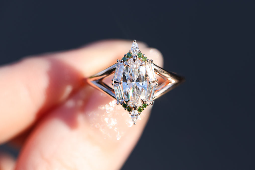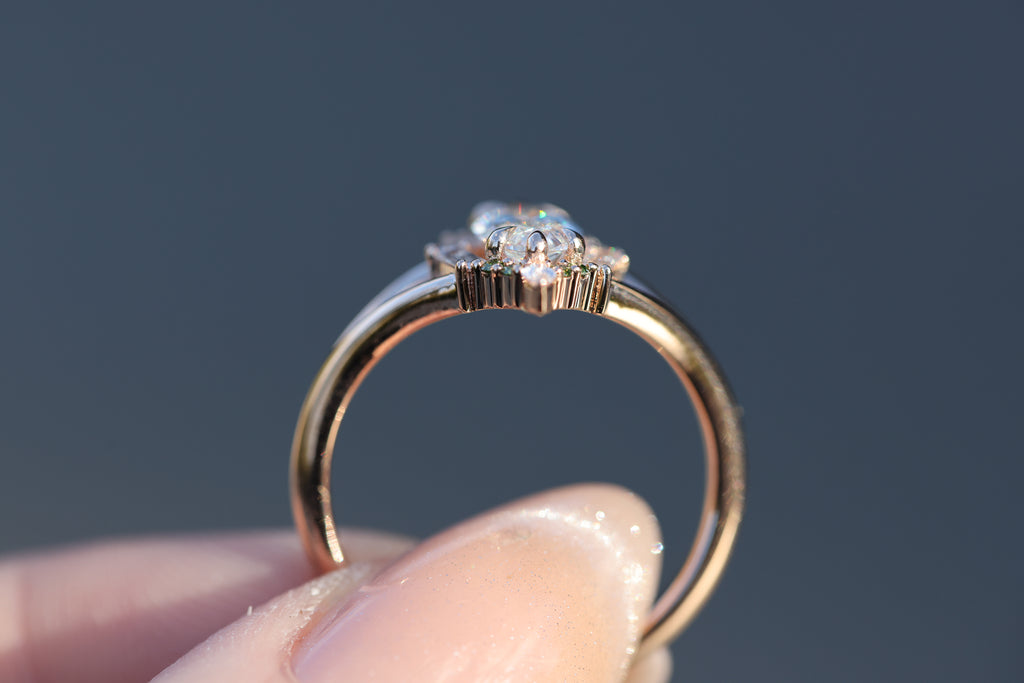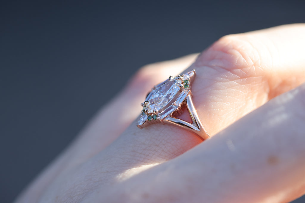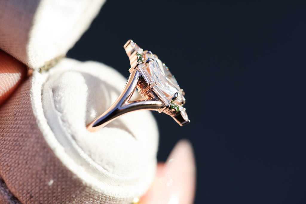 - Four baguette side stones: While I generally default to 4x2mm, depending on the size of your center stone they may be smaller or larger to keep the same ratio look. With larger center stones, please be aware that the baguettes might be more straight up and down, particularly with stones that have a flat side (emerald cut, radiant etc.). If you prefer them being angled out like in the pictures, please let me know in a note at check out and I will do my best to accommodate that!