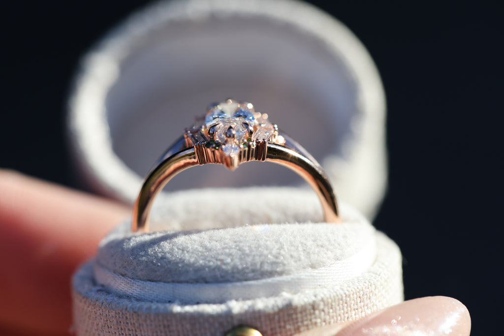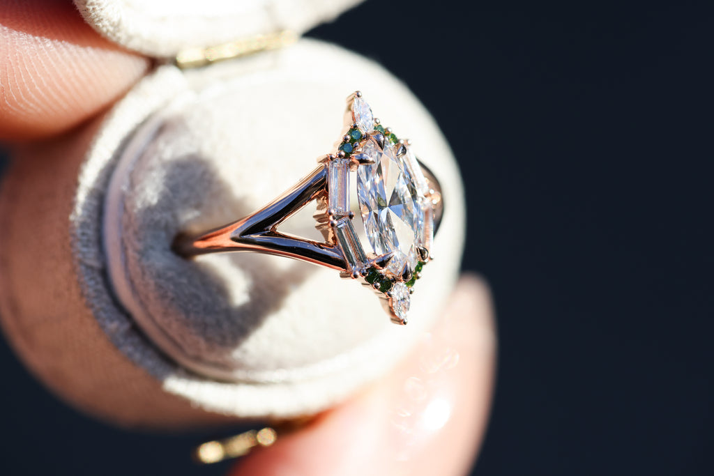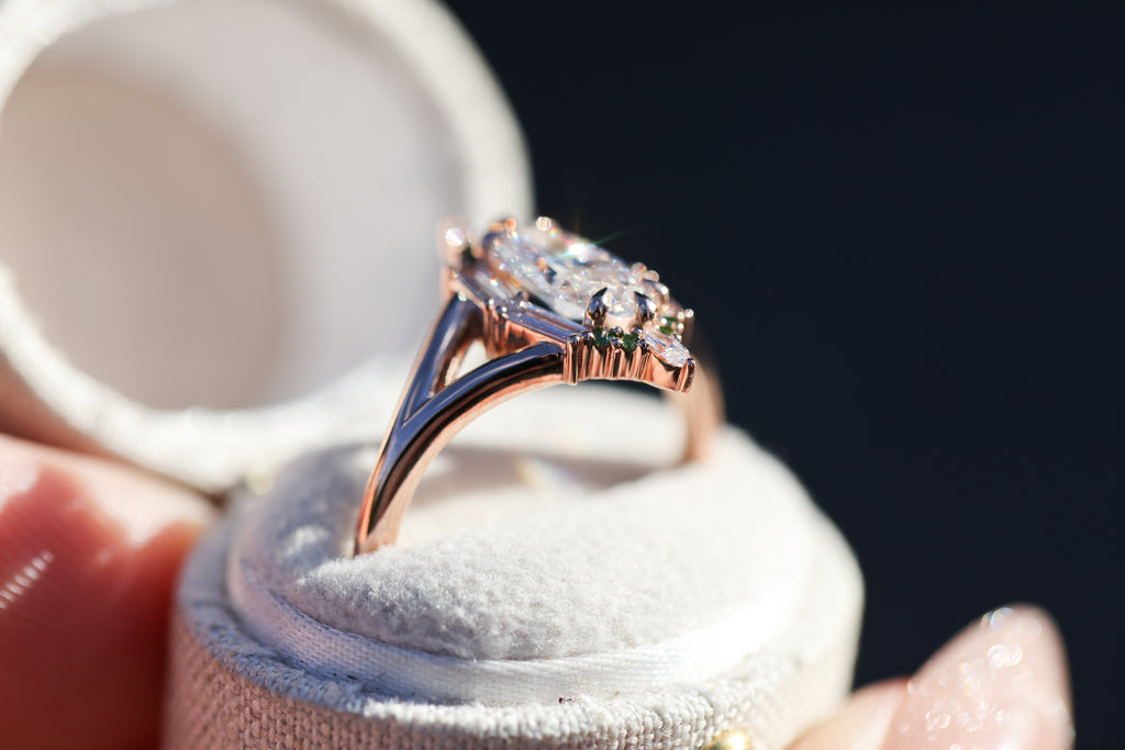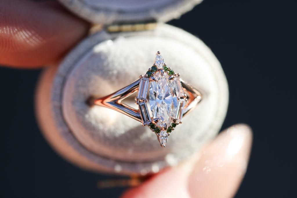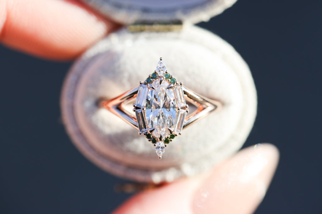 - Four baguette side stones: While I generally default to 4x2mm, depending on the size of your center stone they may be smaller or larger to keep the same ratio look. With larger center stones, please be aware that the baguettes might be more straight up and down, particularly with stones that have a flat side (emerald cut, radiant etc.). If you prefer them being angled out like in the pictures, please let me know in a note at check out and I will do my best to accommodate that!