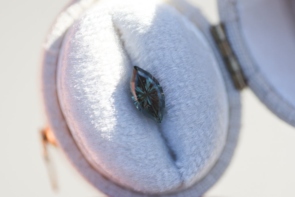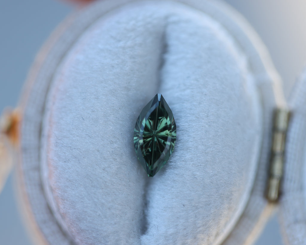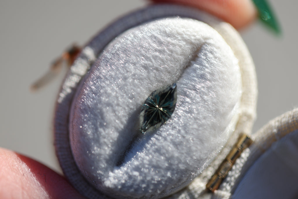 This absolute stunner is a marquise sappire that color changes from grey to grey green and has a little warmth inside in incandescent lighting! It is just the most special stone with award winning gem cutter John Dyer's custom Starbrite cut! Absolute magic!