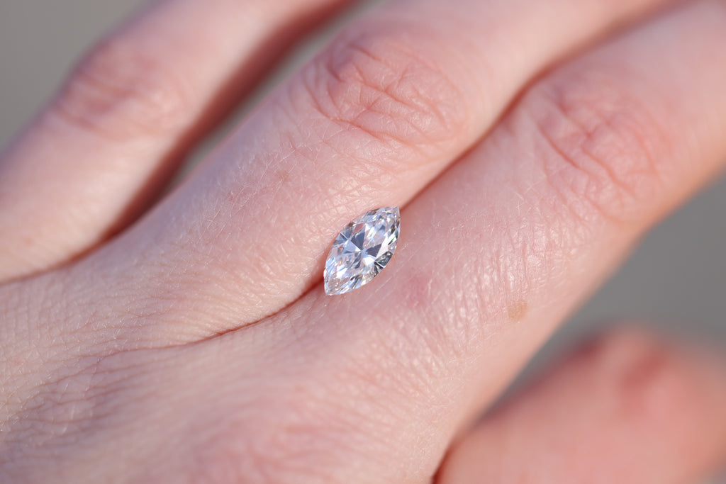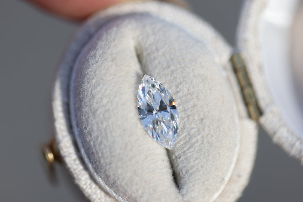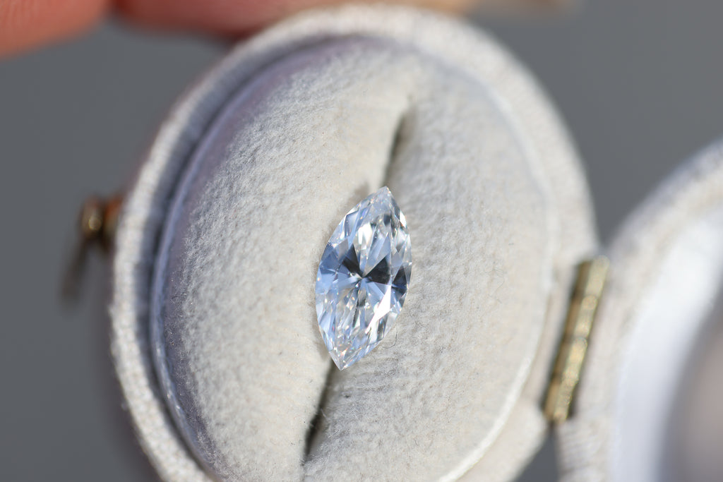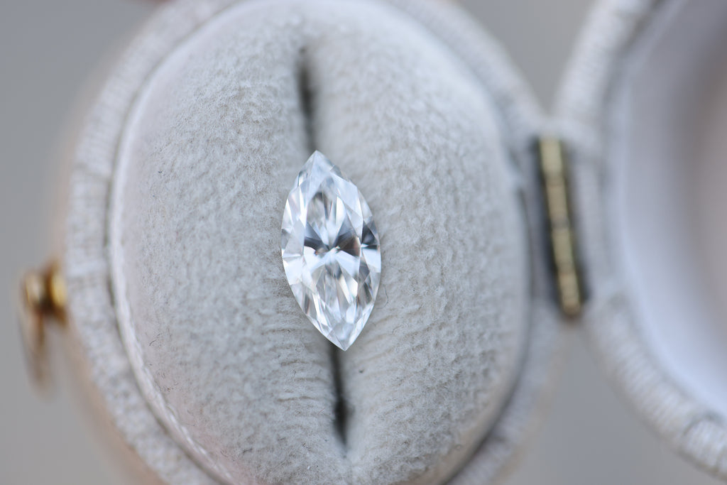 This beauty is a marquise lab diamond with bright white D coloring and gorgeous sparkle!