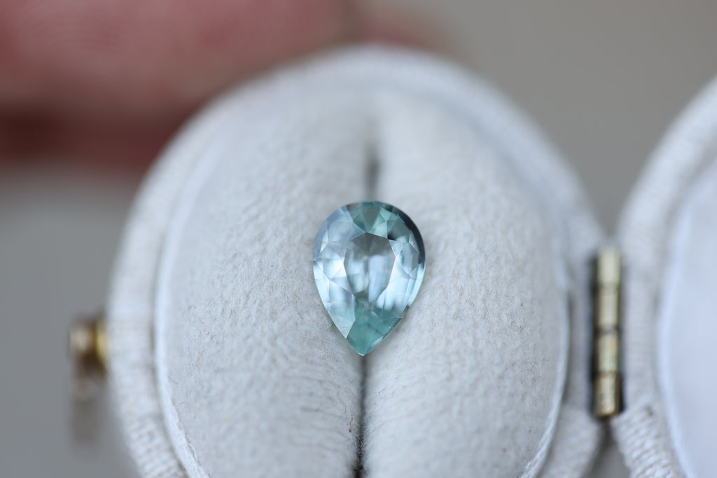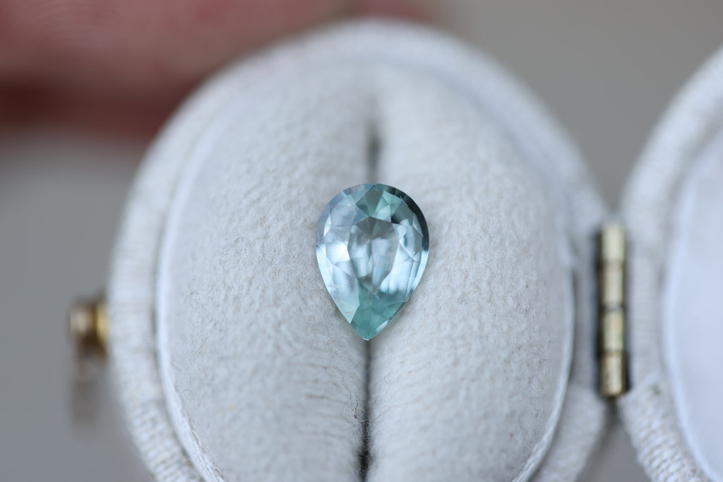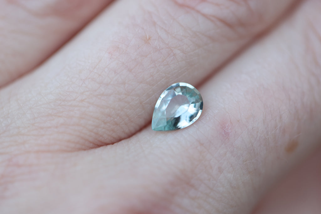 This absolute beauty has the prettiest mint coloring! Just the loveliest pear sapphire!