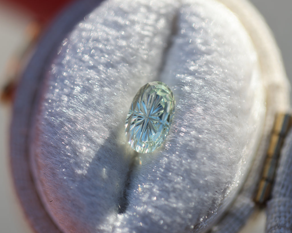 This gorgeous oval sapphire is the loveliest light yellow green color with such incredible custom Starbrite faceting by award winning gem cutter John Dyer! It is just an absolute beauty!
