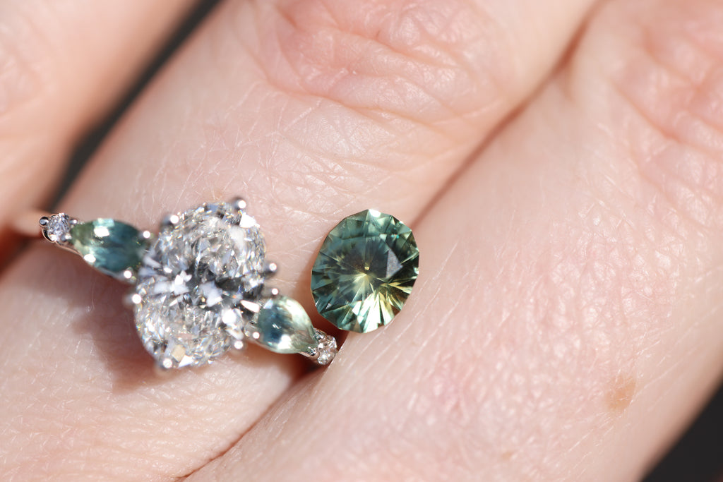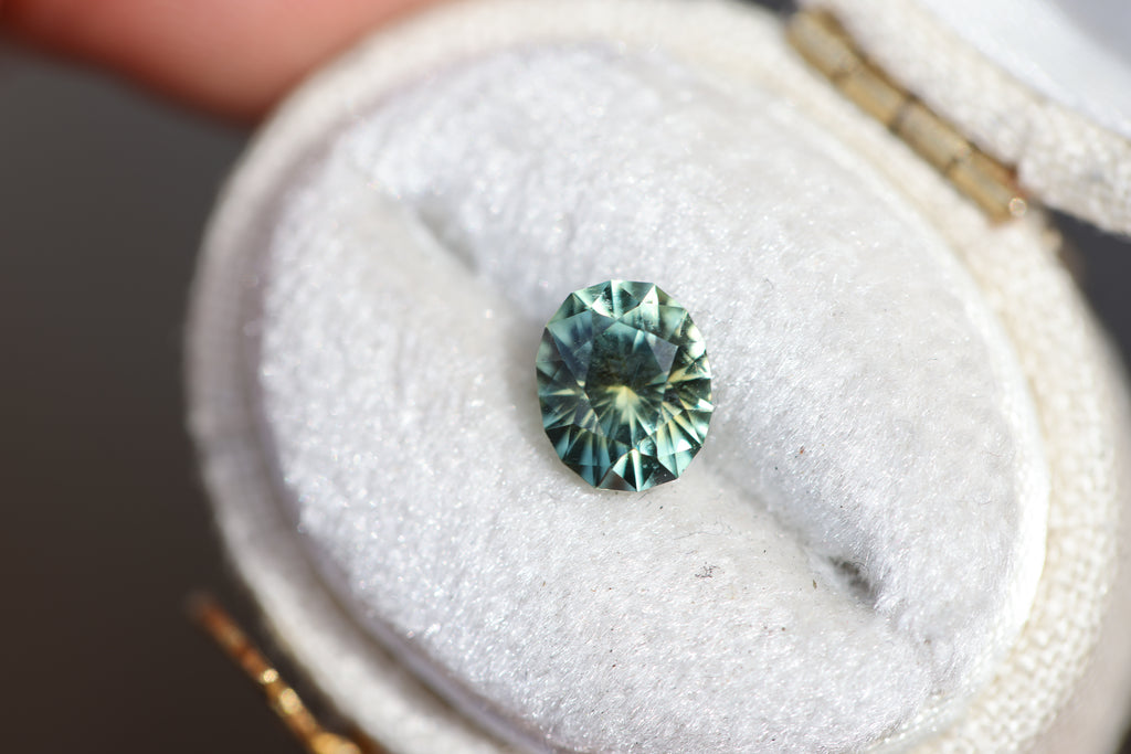 This absolutely stunning oval green sapphire has the most incredible faceting that gives its gorgeous green coloring such dimension!