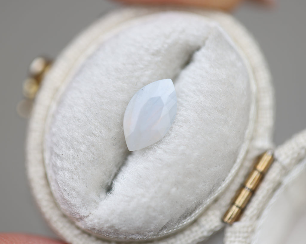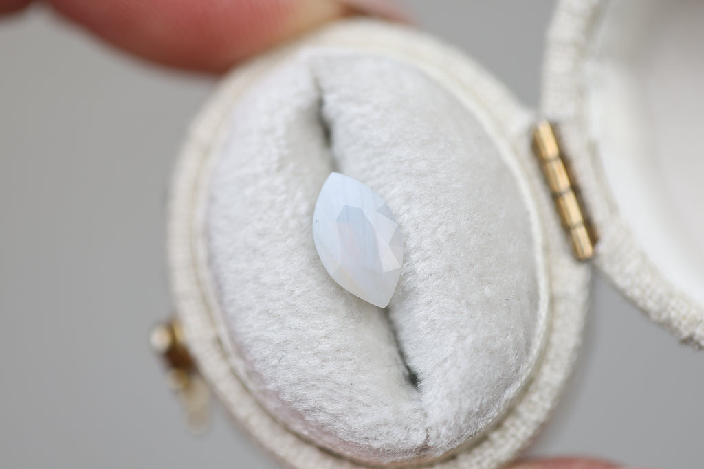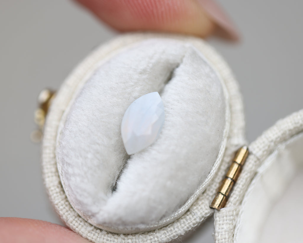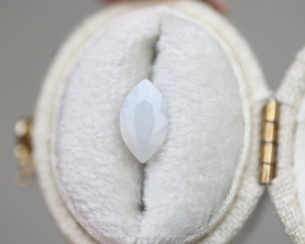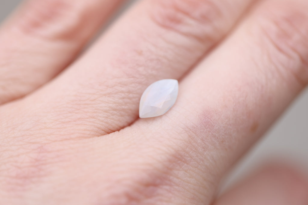 This absolutely incredible white marquise sapphire has the most magical opalescence! It is just such a gorgeous dreamy stone!