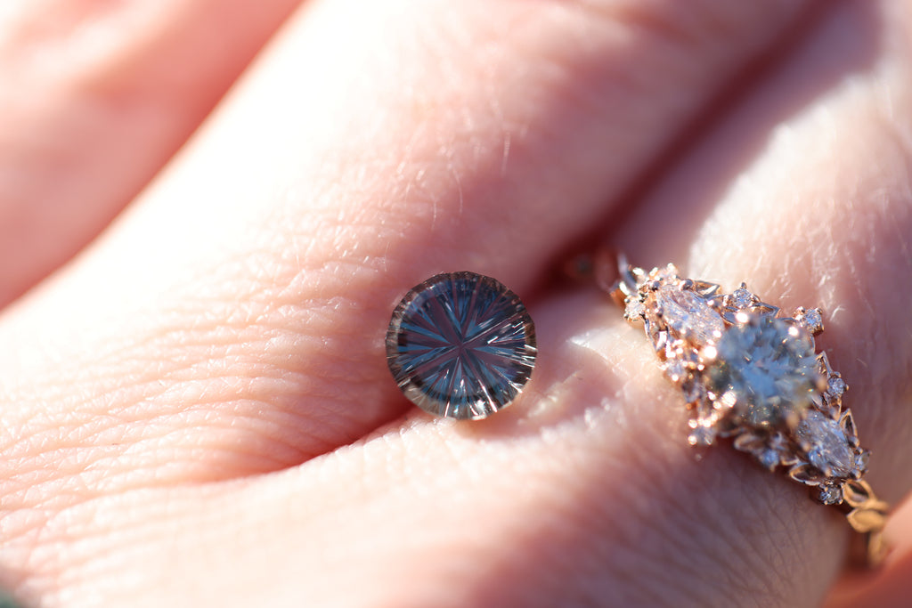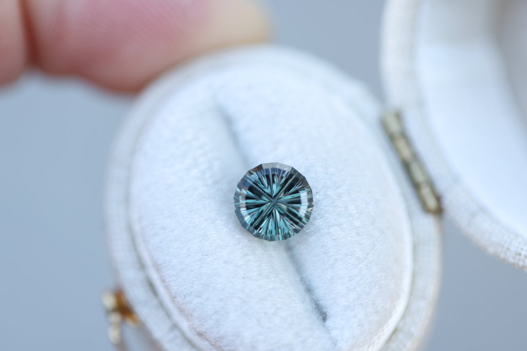 This absolutely magical round color changing sapphire goes from grey to teal to an almost dark purple grey when indoors! It is so, so unique and special and has award winning gem cutter John Dyer's custom Starbrite cut! Just stunning!