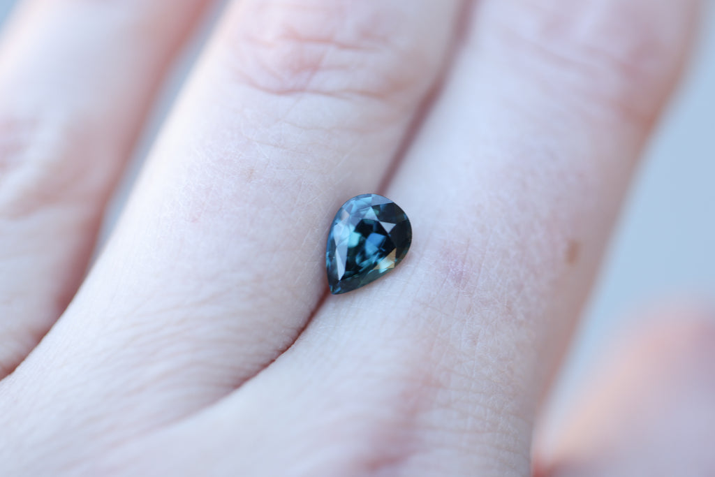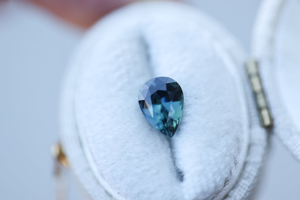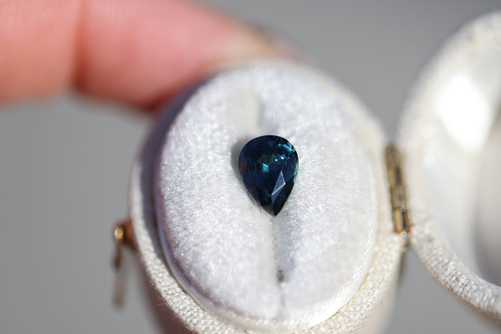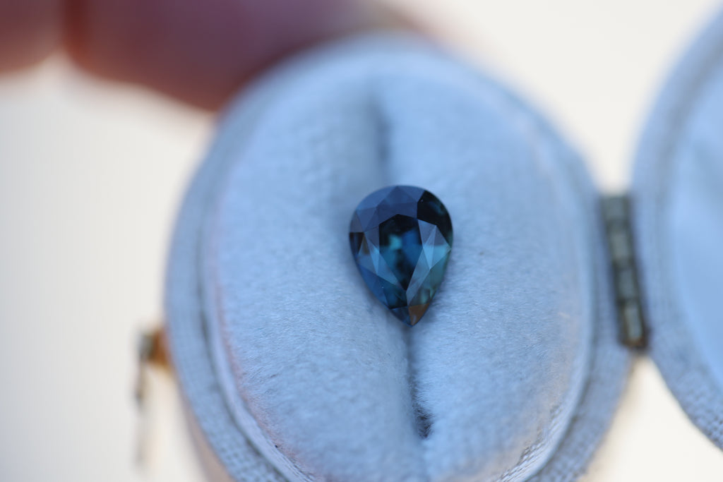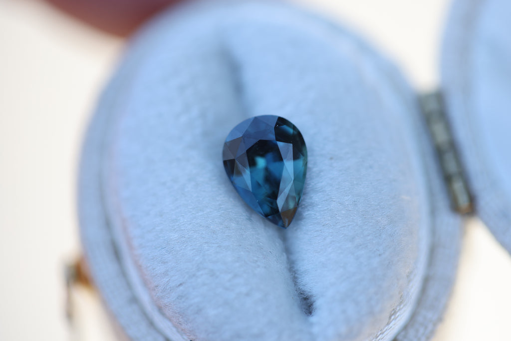 This stunning pear sapphire is a deep blue teal that feels a little bit mysterious and a whole lot magical!