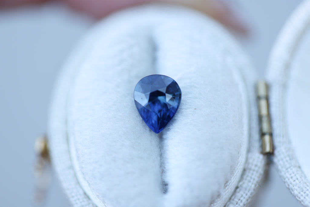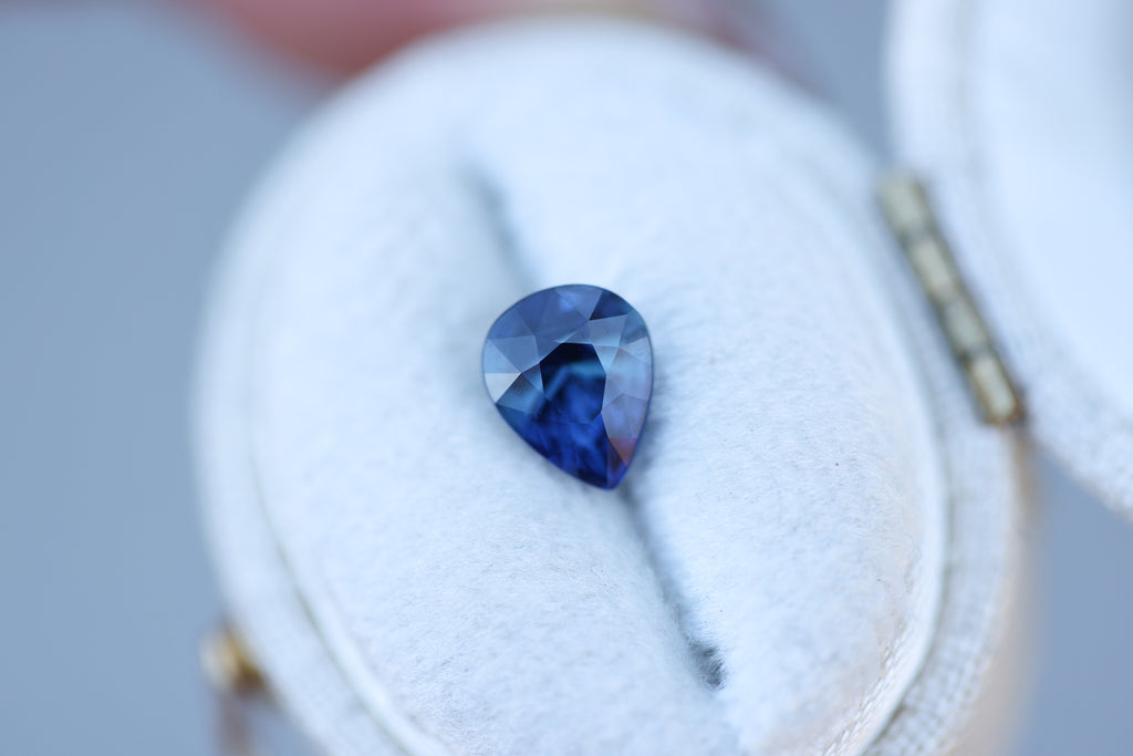 This absolutely gorgeous deep blue pear sapphire has such incredibly rich coloring!