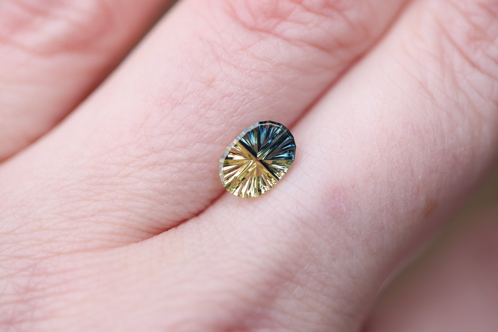 This incredible parti blue/yellow sapphire is almost a perfect divide of colors! It has award winning gem cutter John Dyer's custom Starbrite cut and is just such a special stone! Because it isn't cut super deep you're going to get a bit more "finger coverage" or surface area of the stone which makes it appear larger!