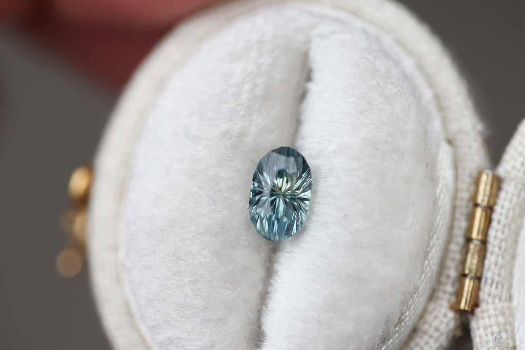 This incredible oval light blue sapphire has the prettiest pop of lightness in the center! It comes from award winning gem cutter John Dyer and has his custom Starbrite cut which gives the stone it's special faceting! Just a gorgeous stone!