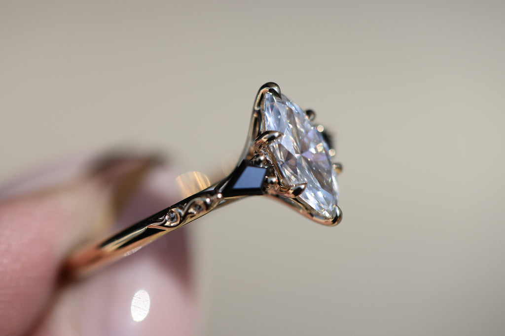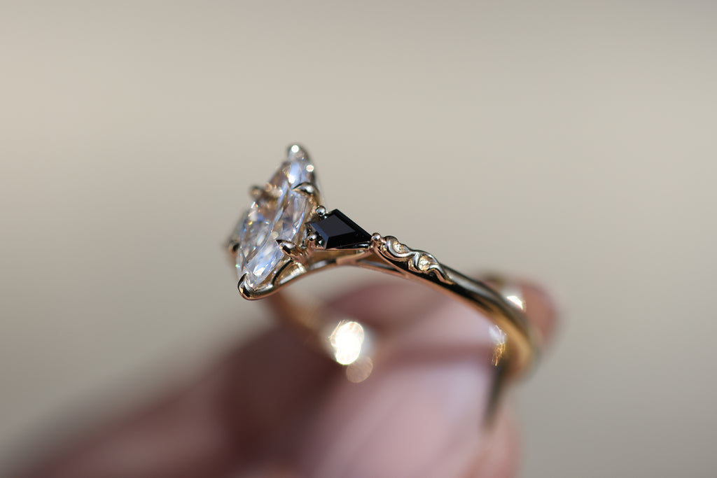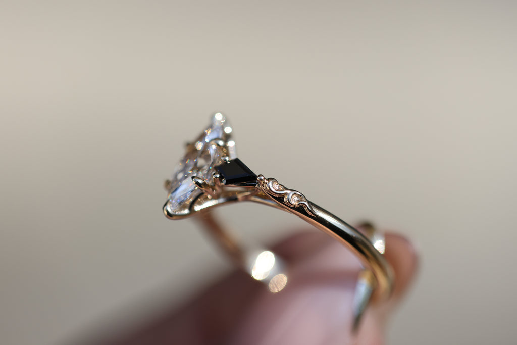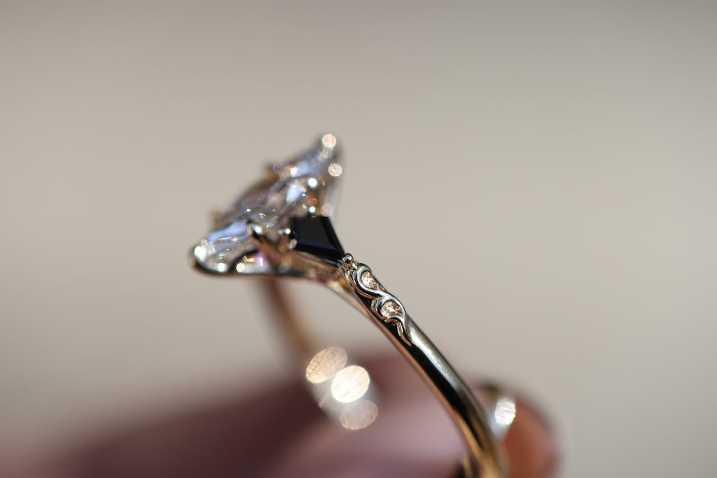 - Two, 5x2.5mm kite cut side stones. These will have a small v-tip prong at the outermost point of the kite
