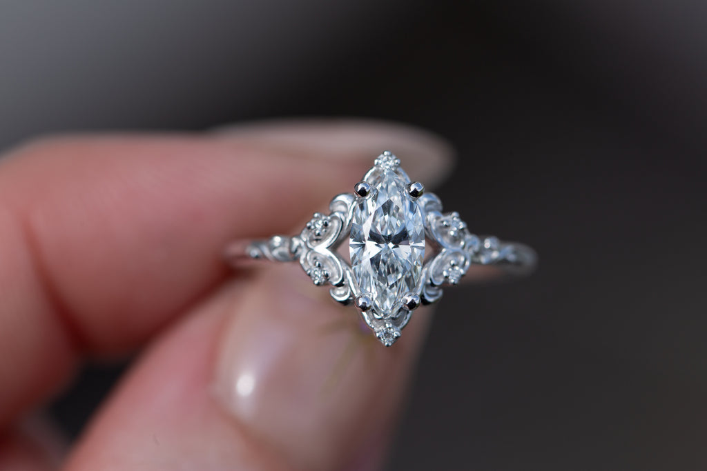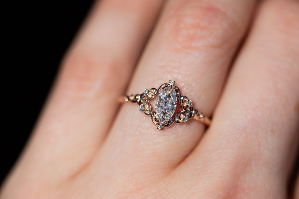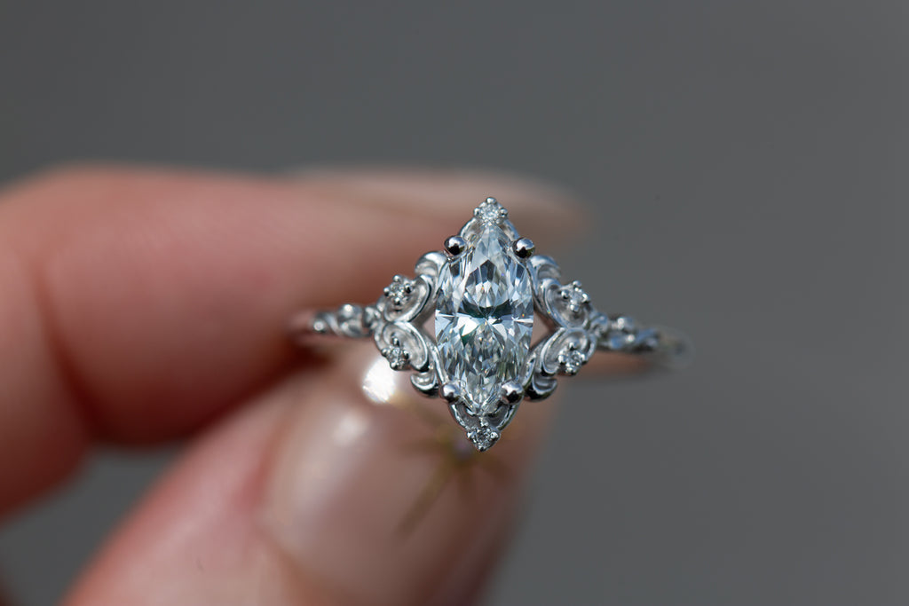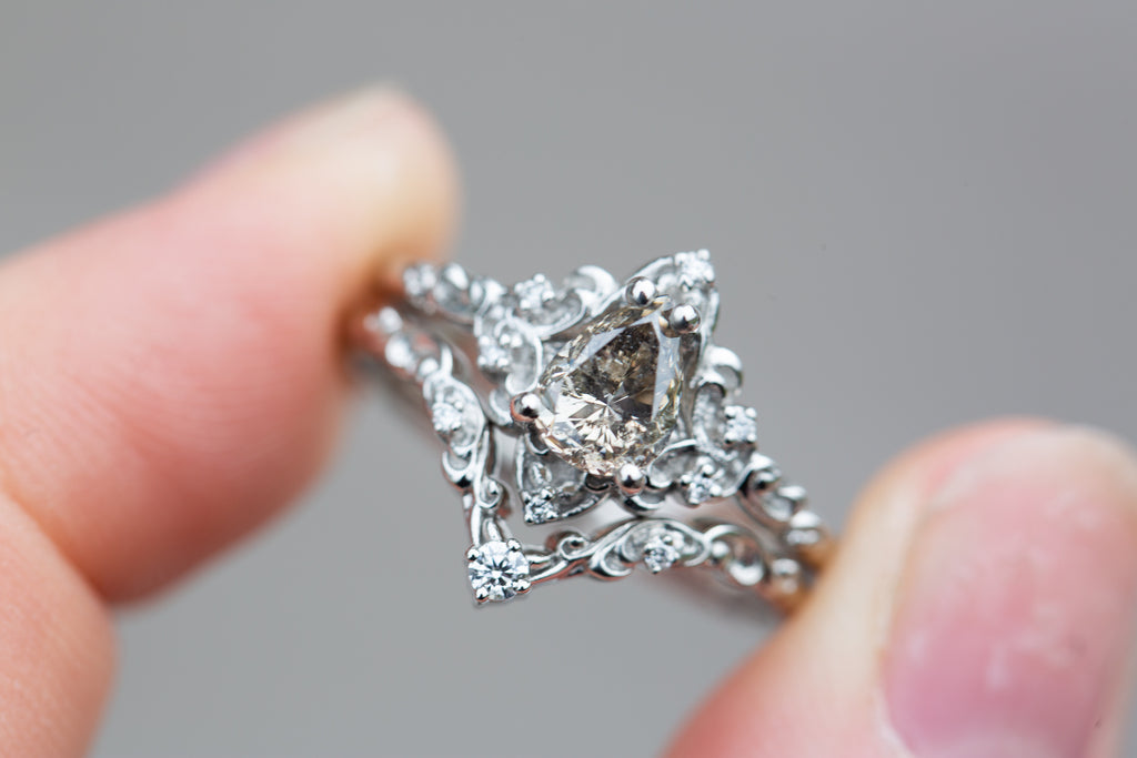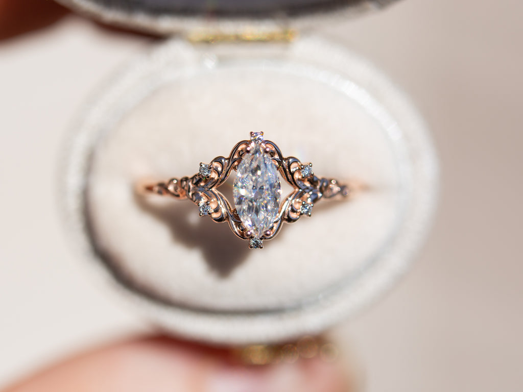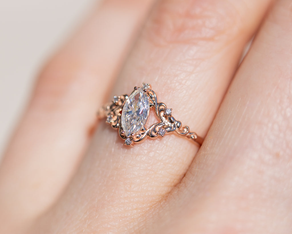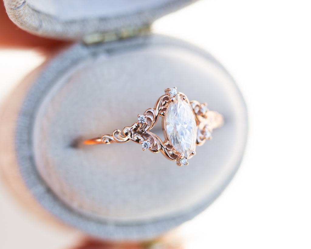 - The filigree swirls might change a little bit depending on the size/shape of the center stone. A longer stone (oval, marquise, pear) will have a larger dip while a round stone won't have as large as one!