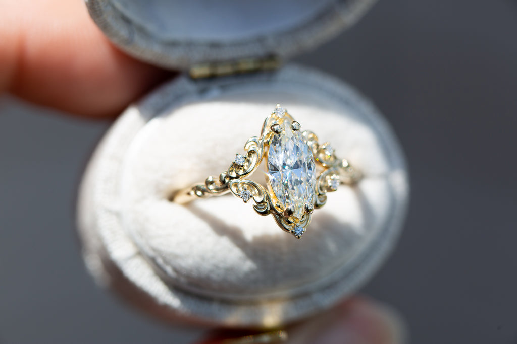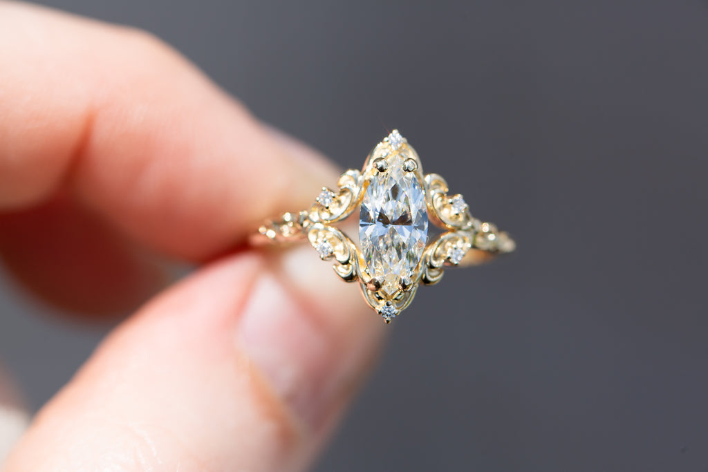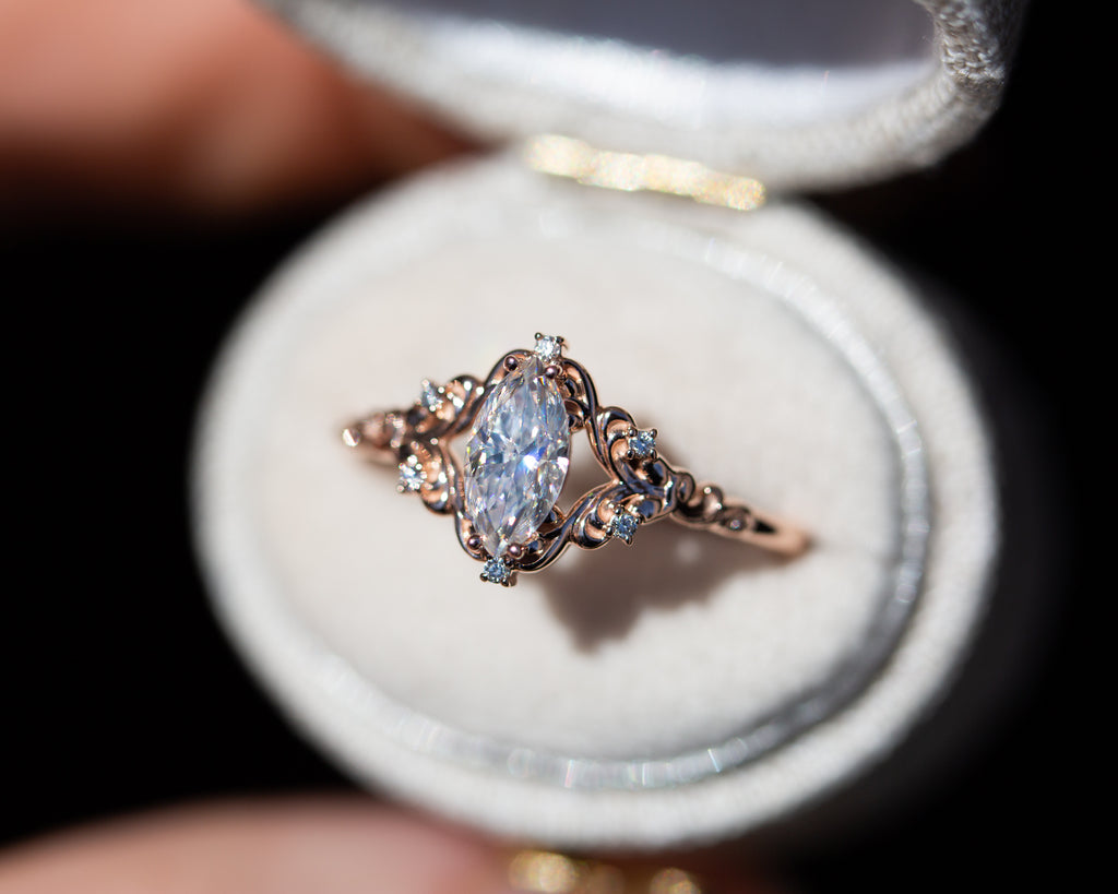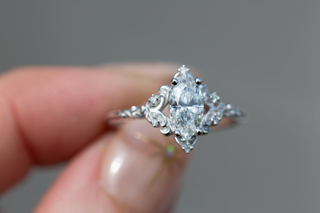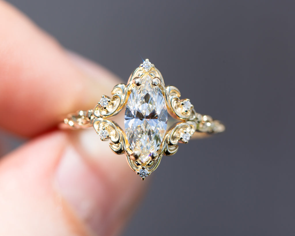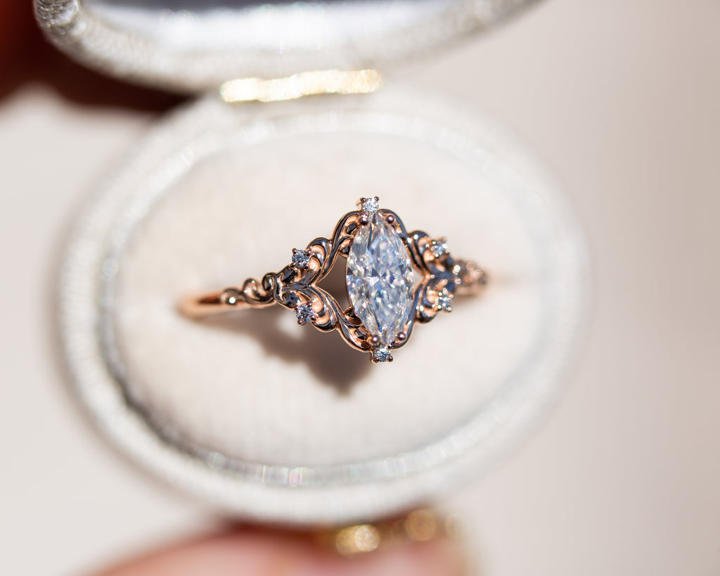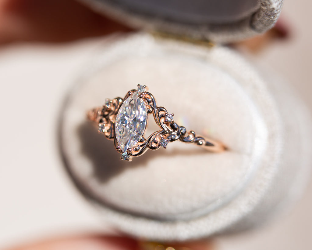 - The filigree swirls might change a little bit depending on the size/shape of the center stone. A longer stone (oval, marquise, pear) will have a larger dip while a round stone won't have as large as one!