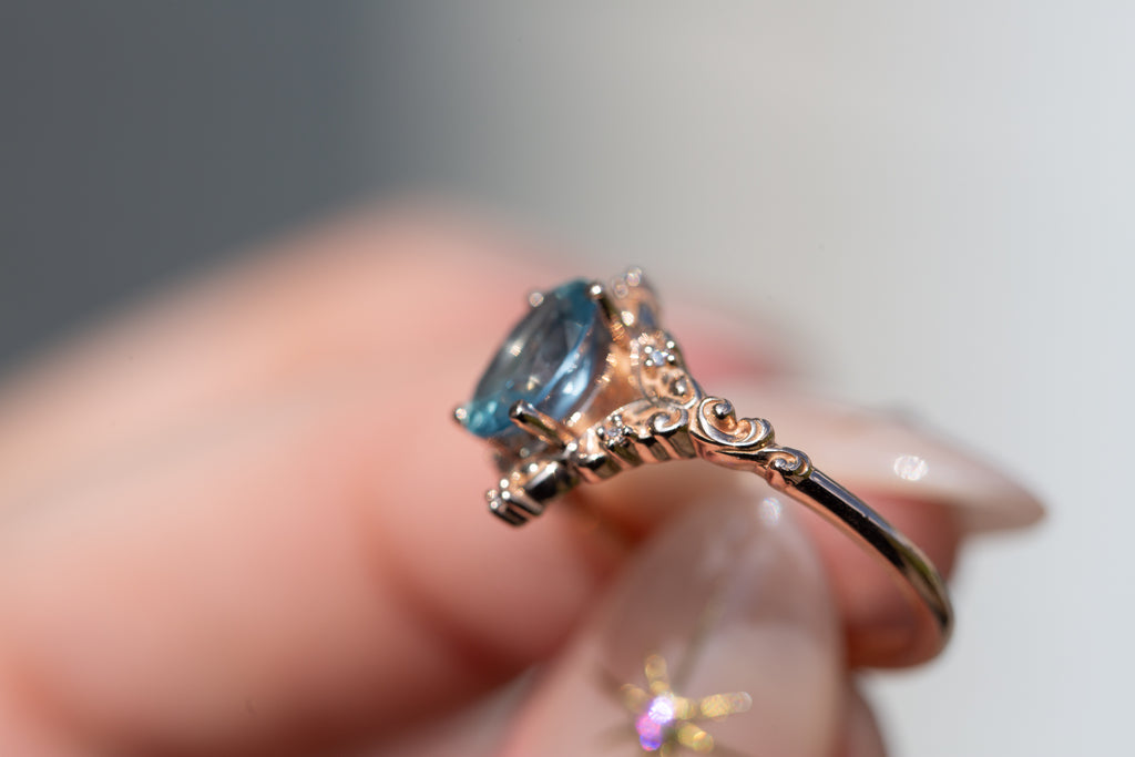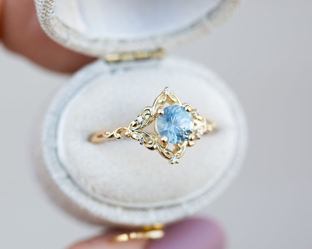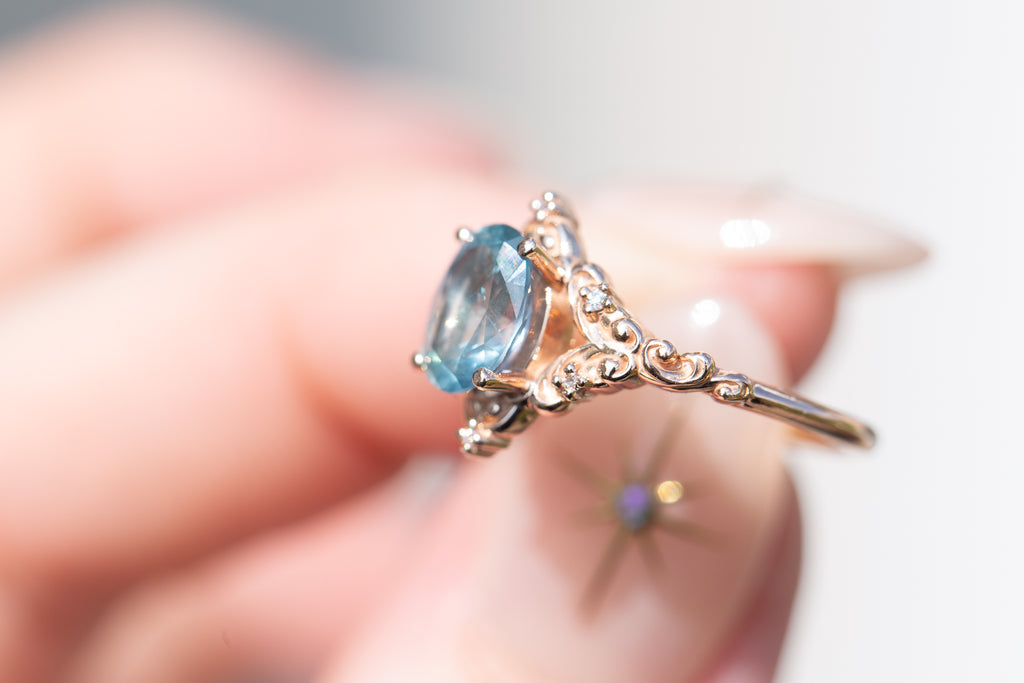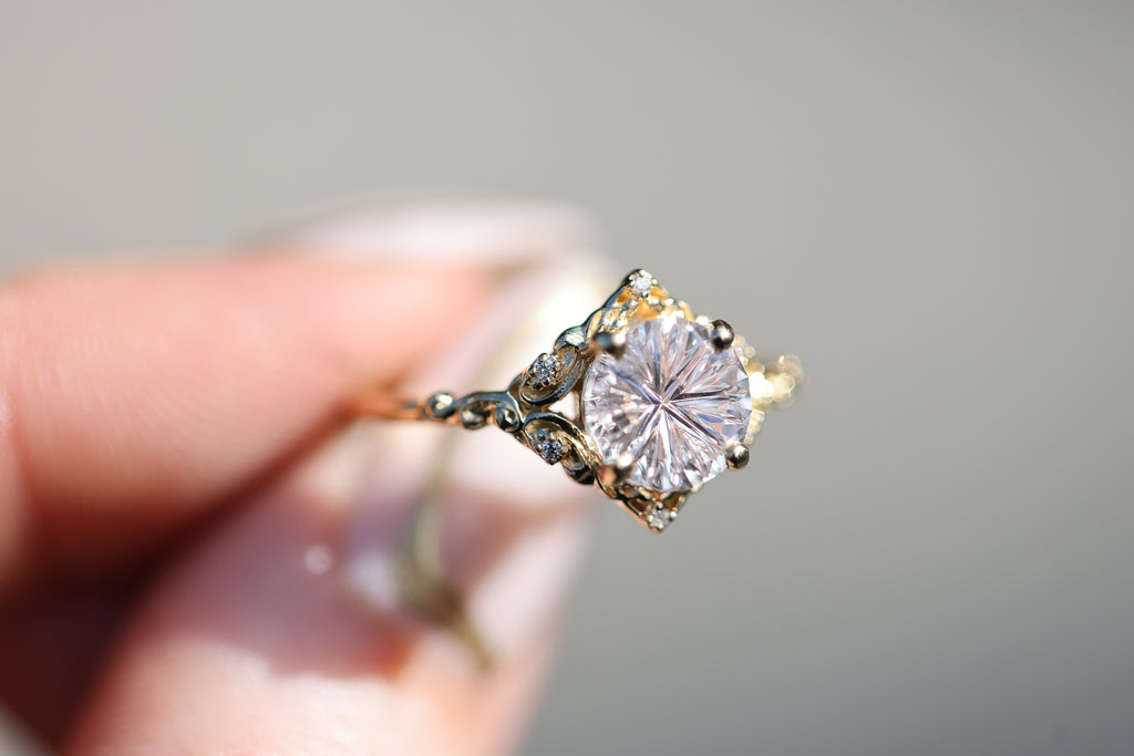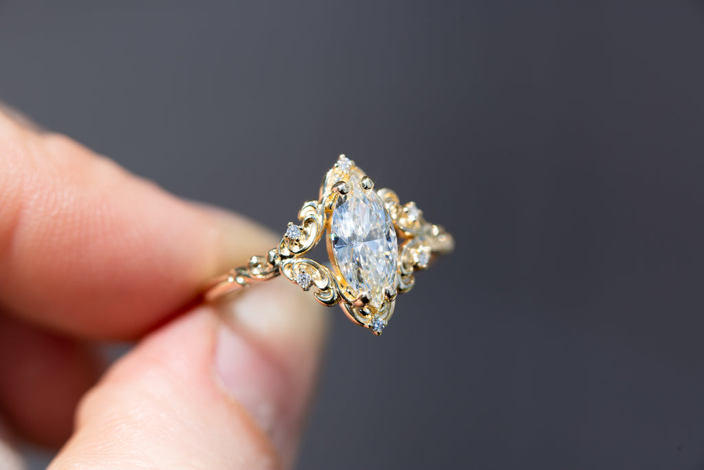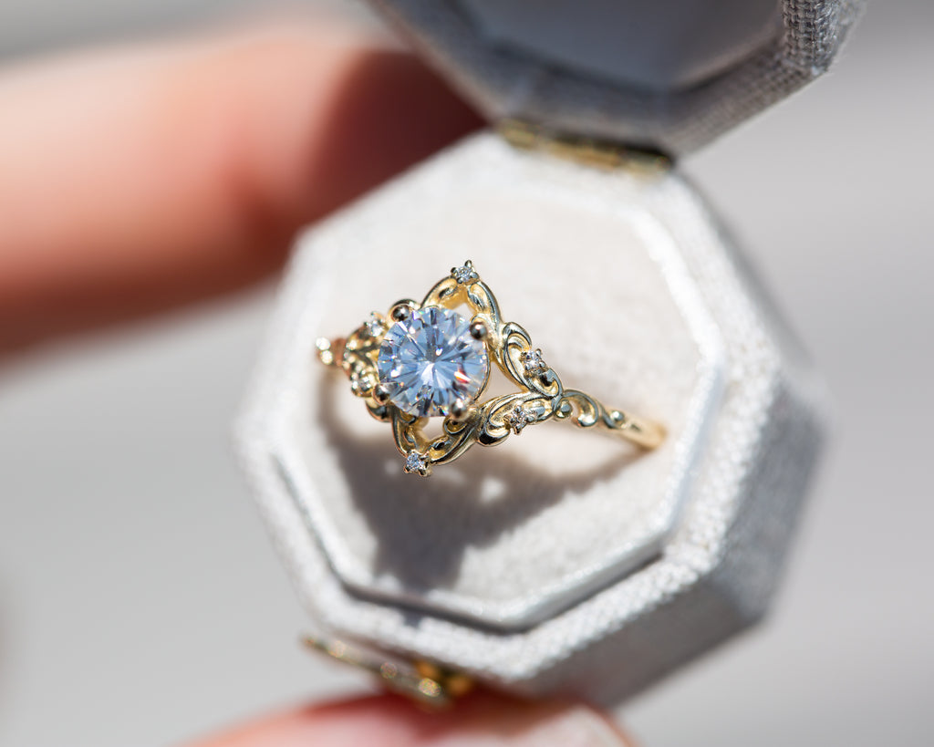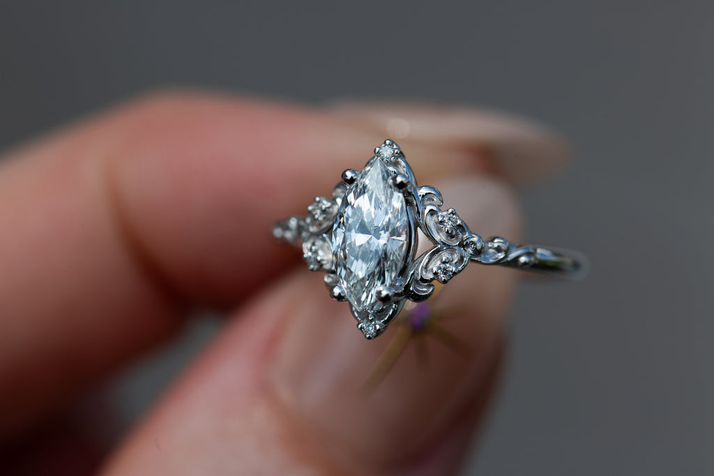 - The filigree swirls might change a little bit depending on the size/shape of the center stone. A longer stone (oval, marquise, pear) will have a larger dip while a round stone won't have as large as one!