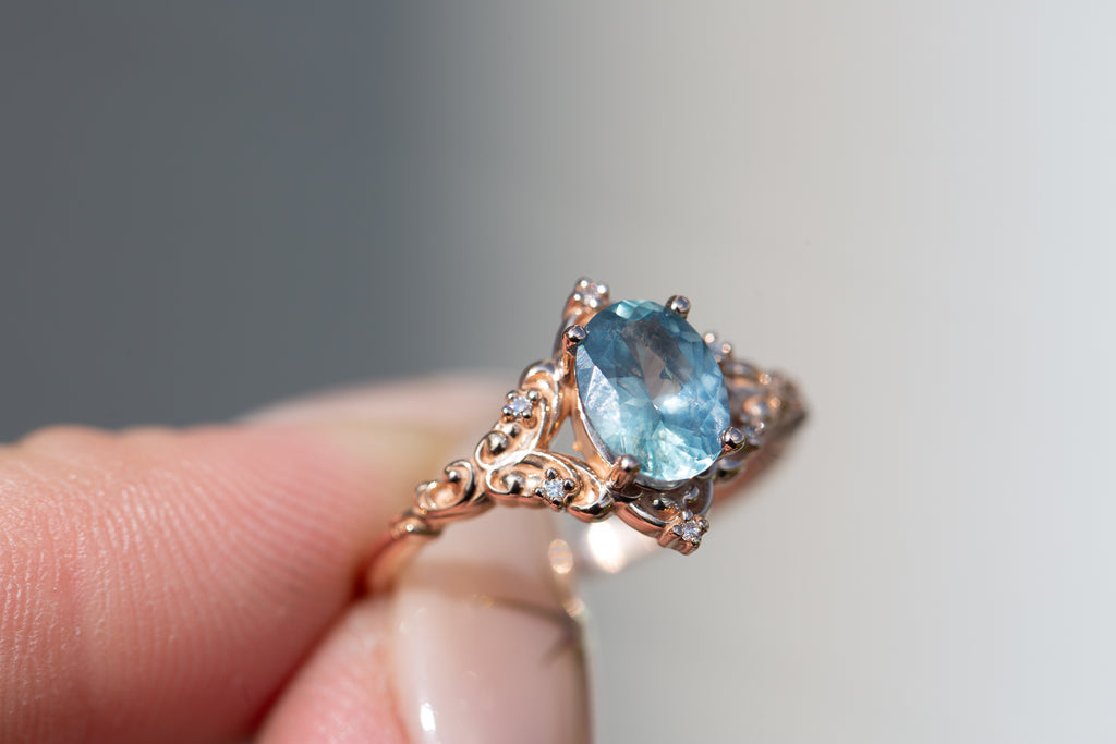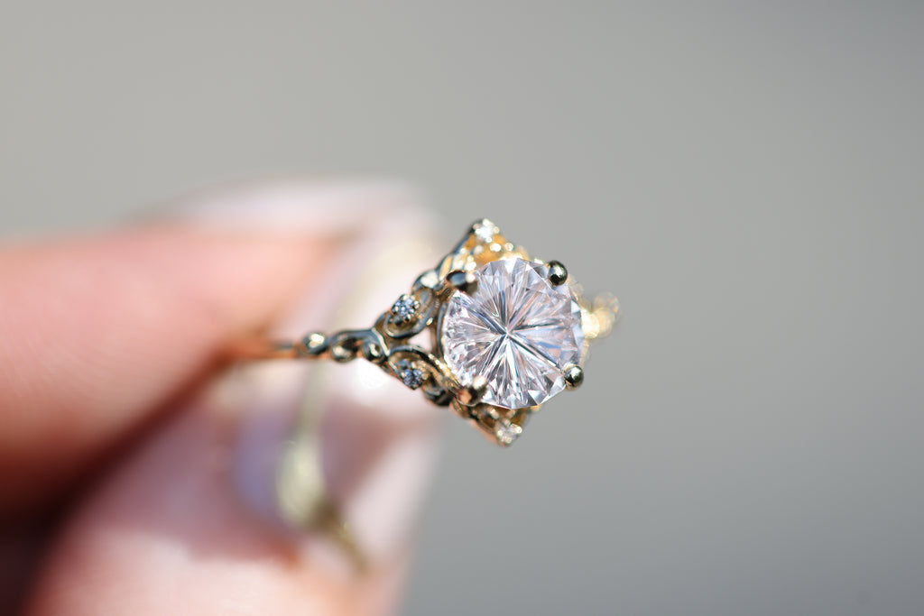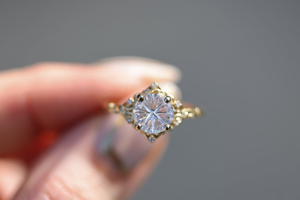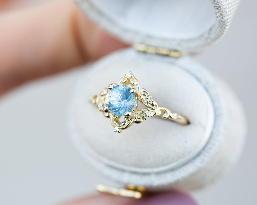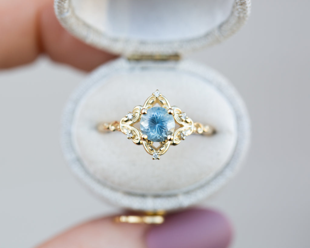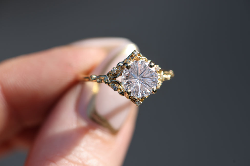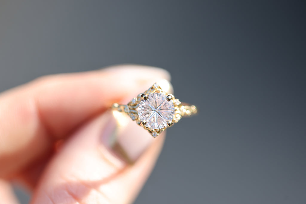 - The filigree swirls might change a little bit depending on the size/shape of the center stone. A longer stone (oval, marquise, pear) will have a larger dip while a round stone won't have as large as one!
