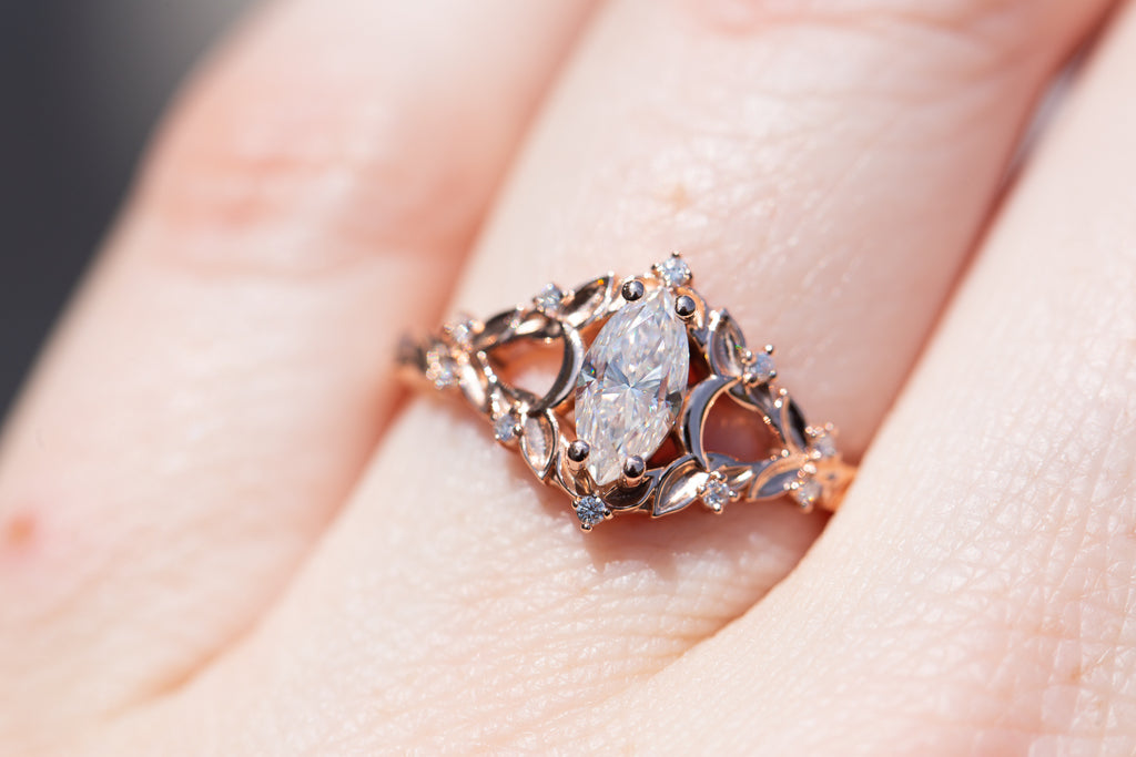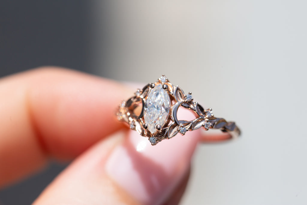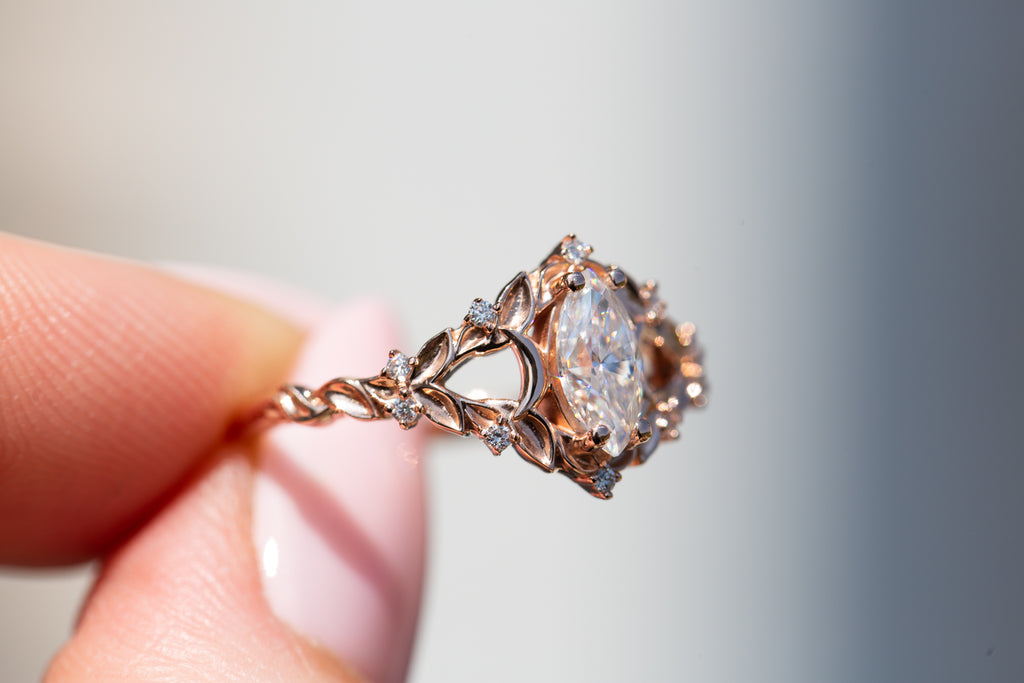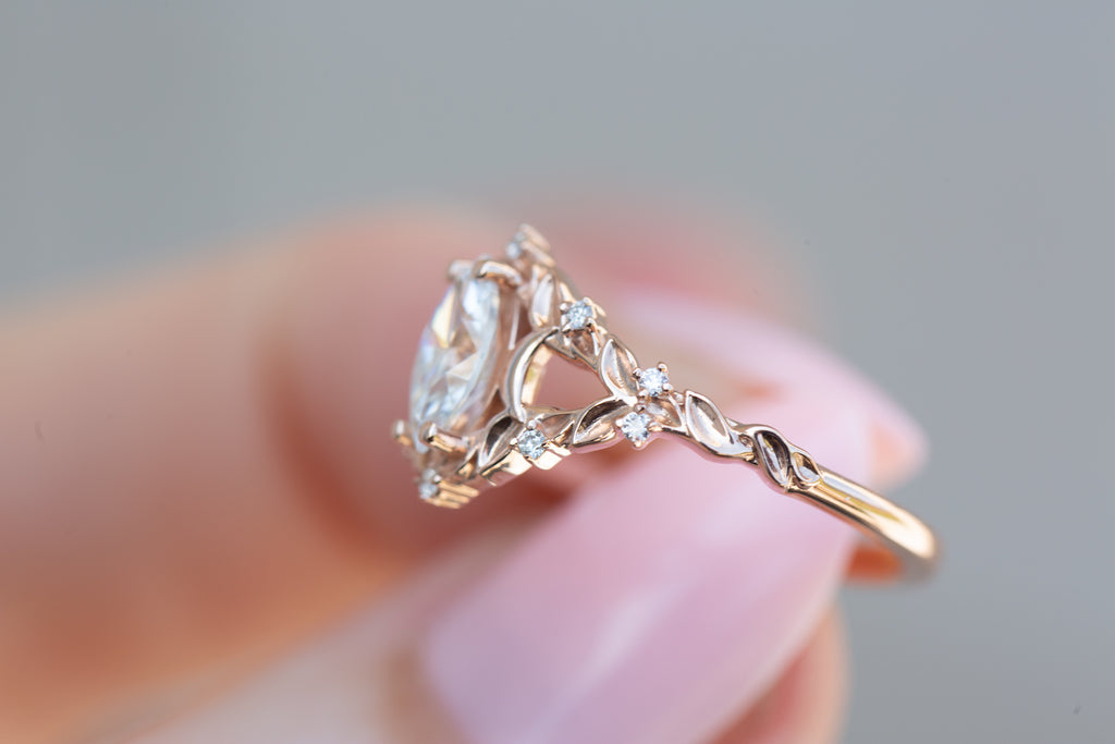 - Ten, 1mm white diamond accent stones placed along the leaves