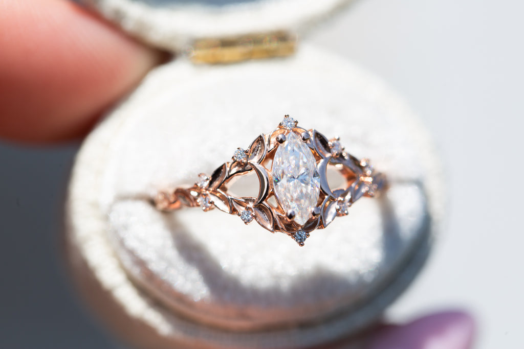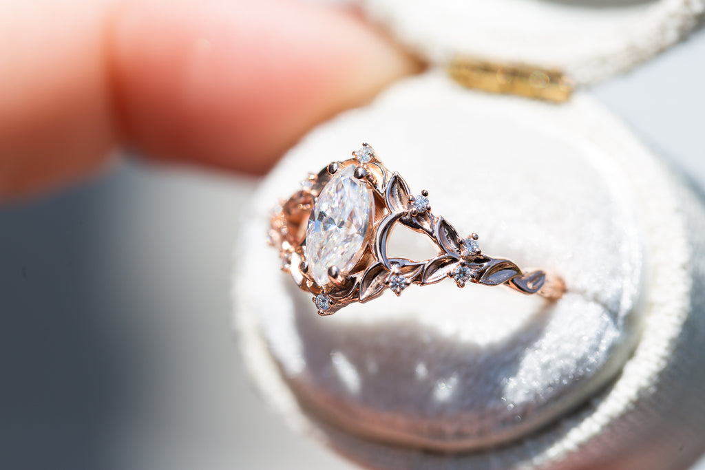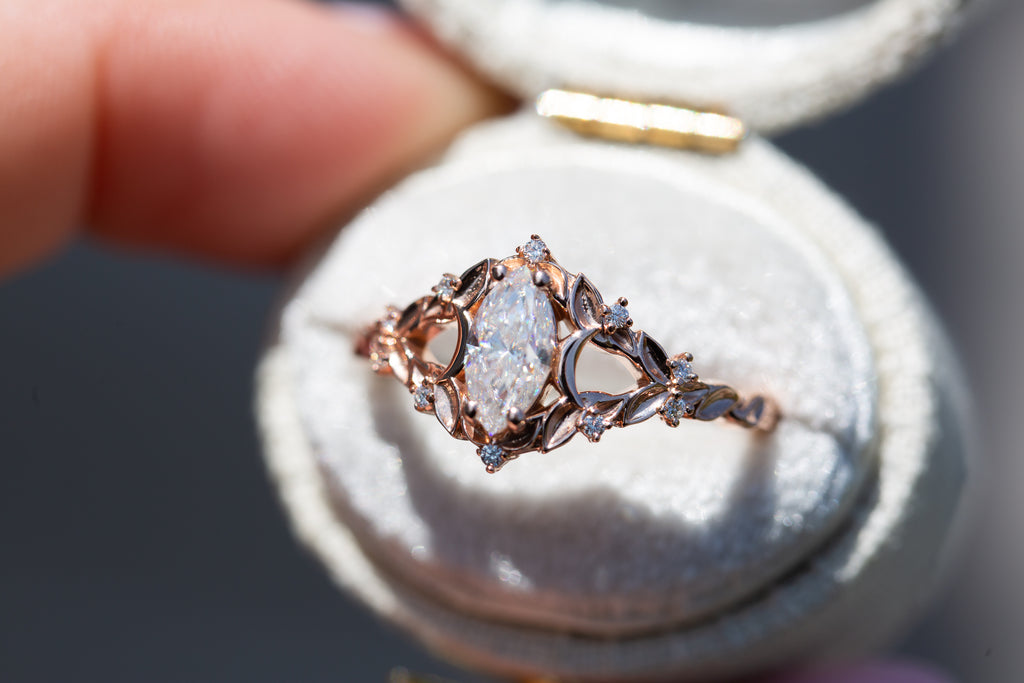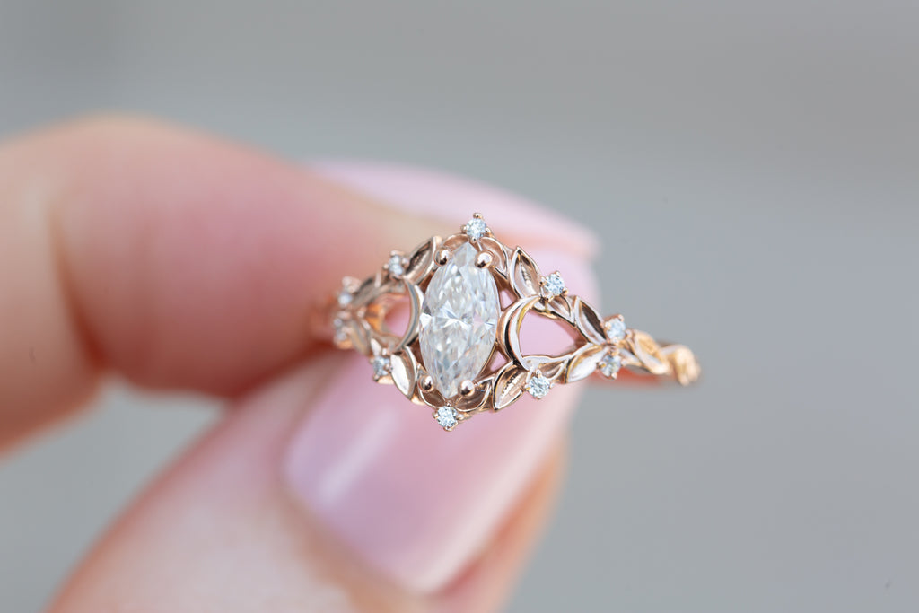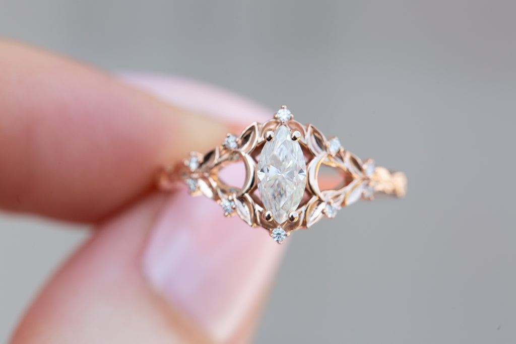 - Ten, 1mm white diamond accent stones placed along the leaves
