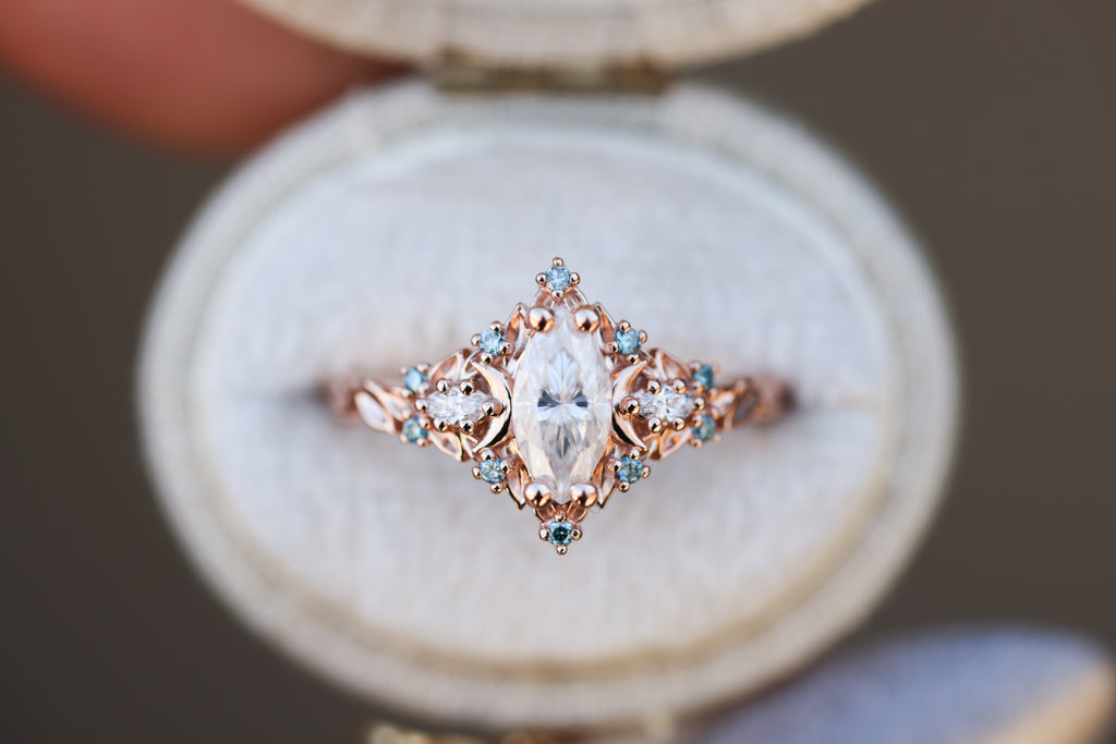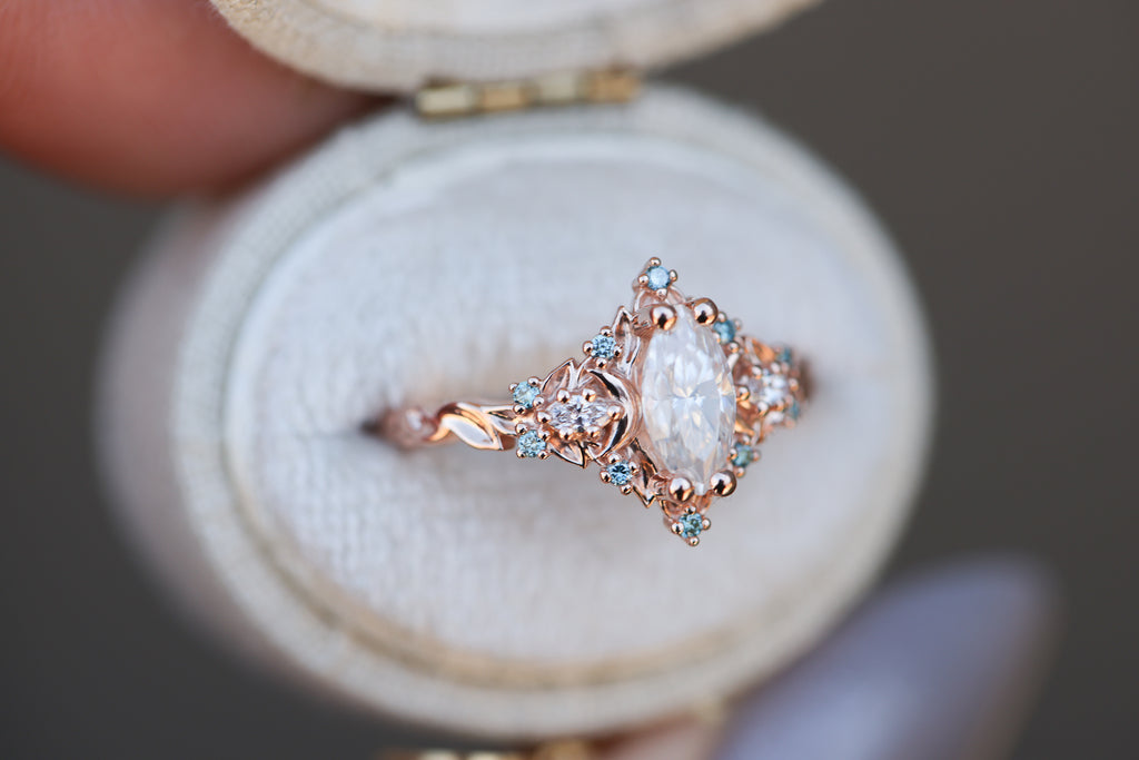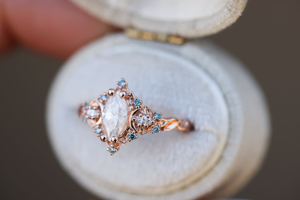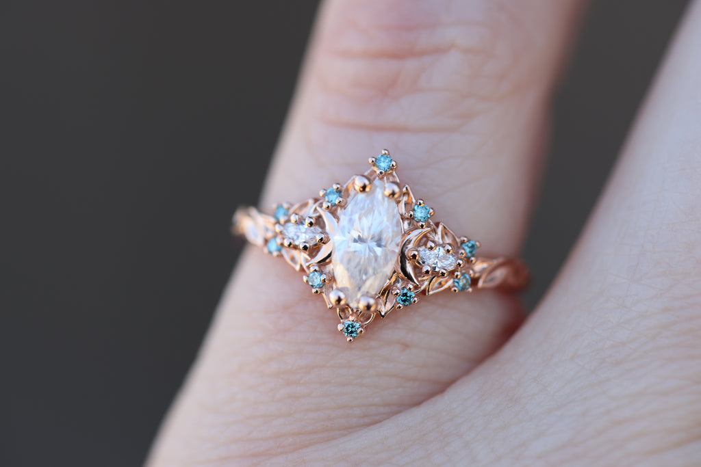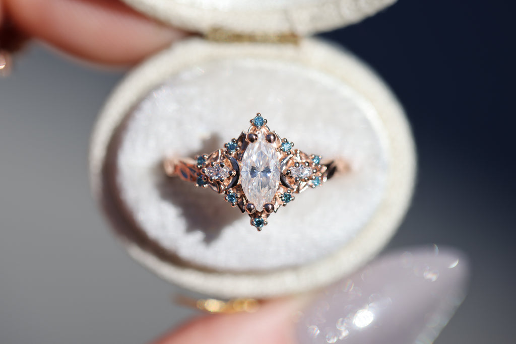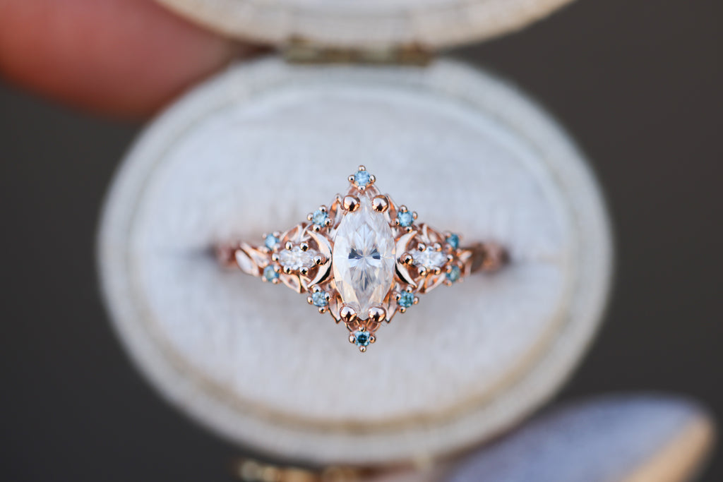 Briar Moon with marquise moissanite center and aqua diamond accents