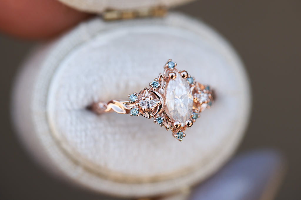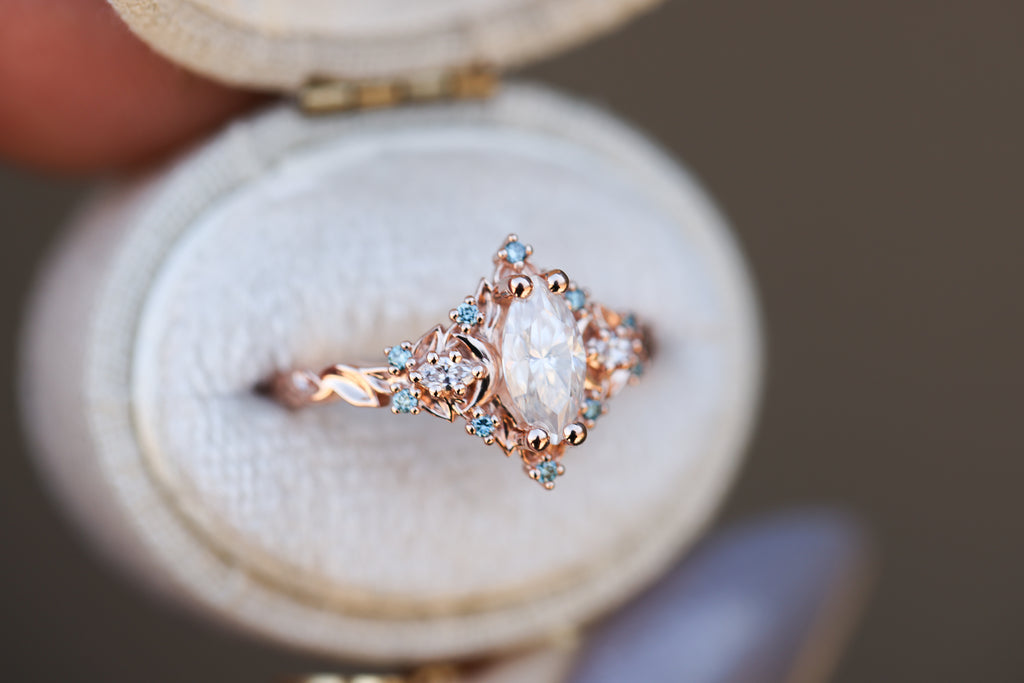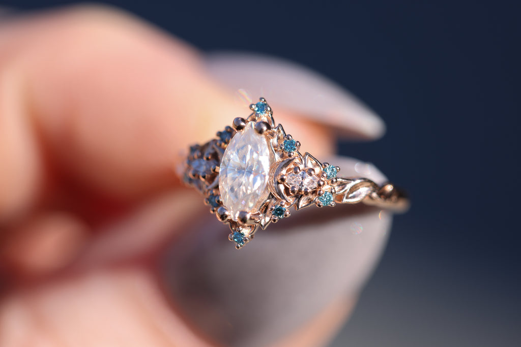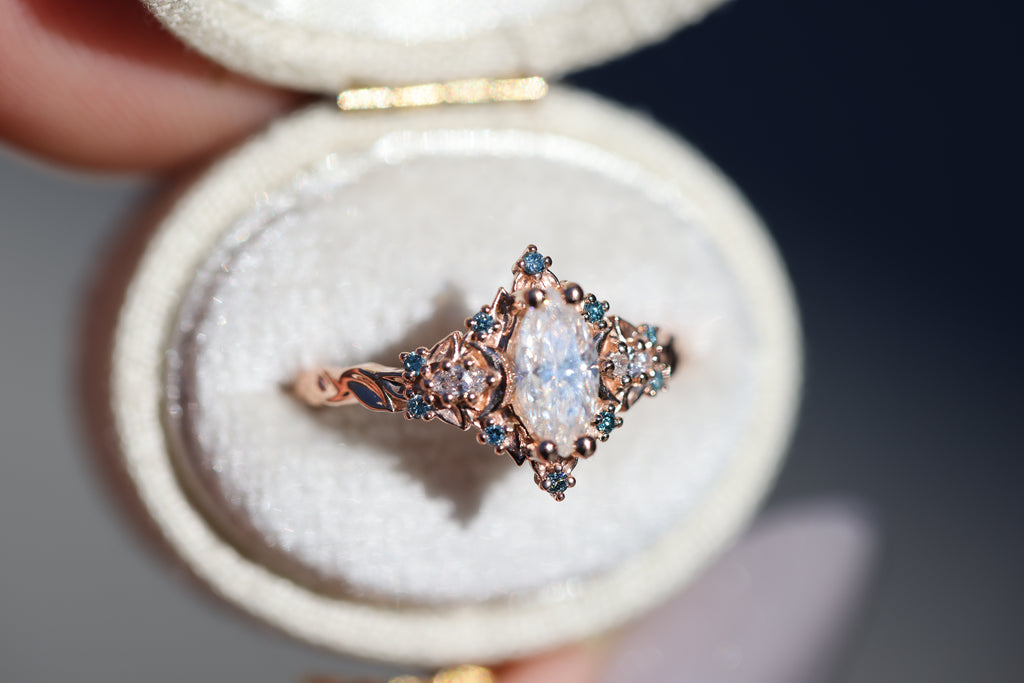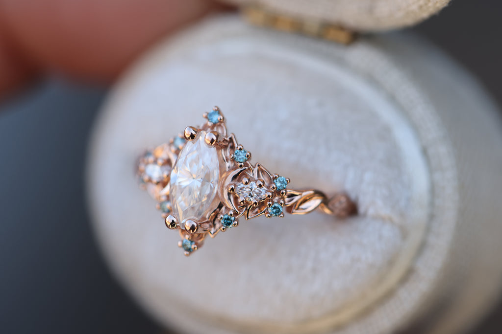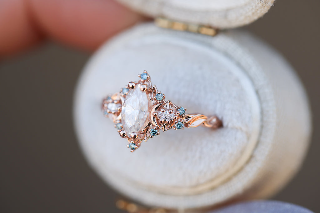 Briar Moon with marquise moissanite center and aqua diamond accents