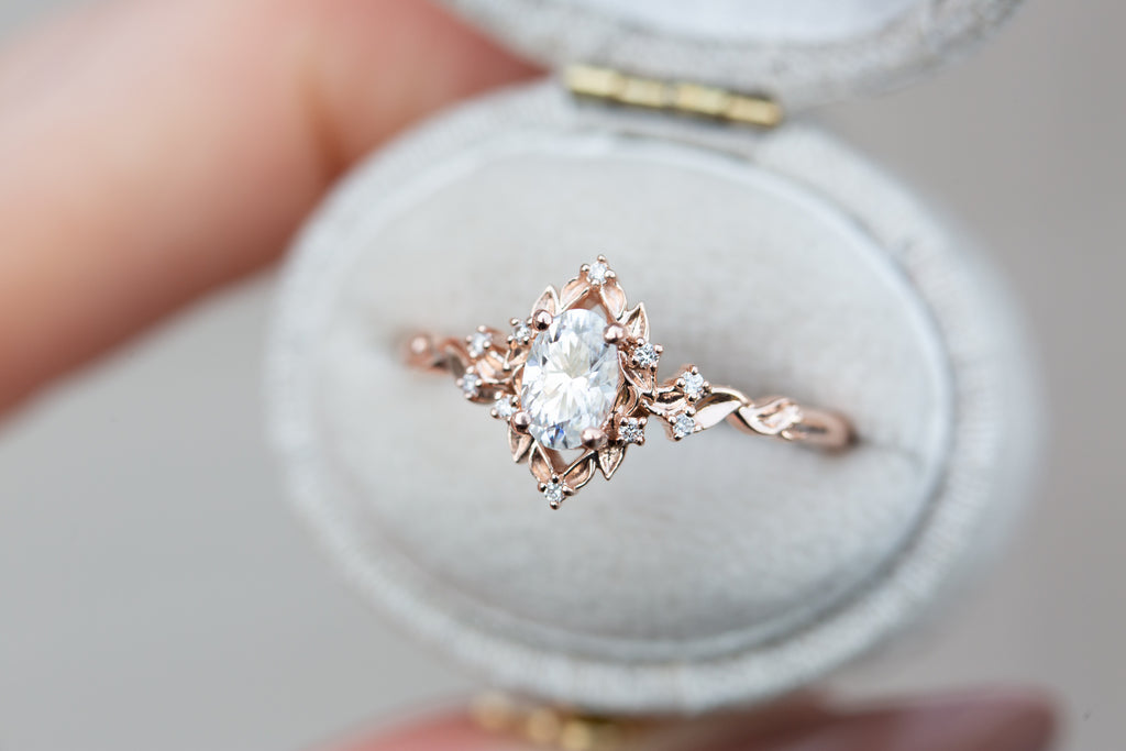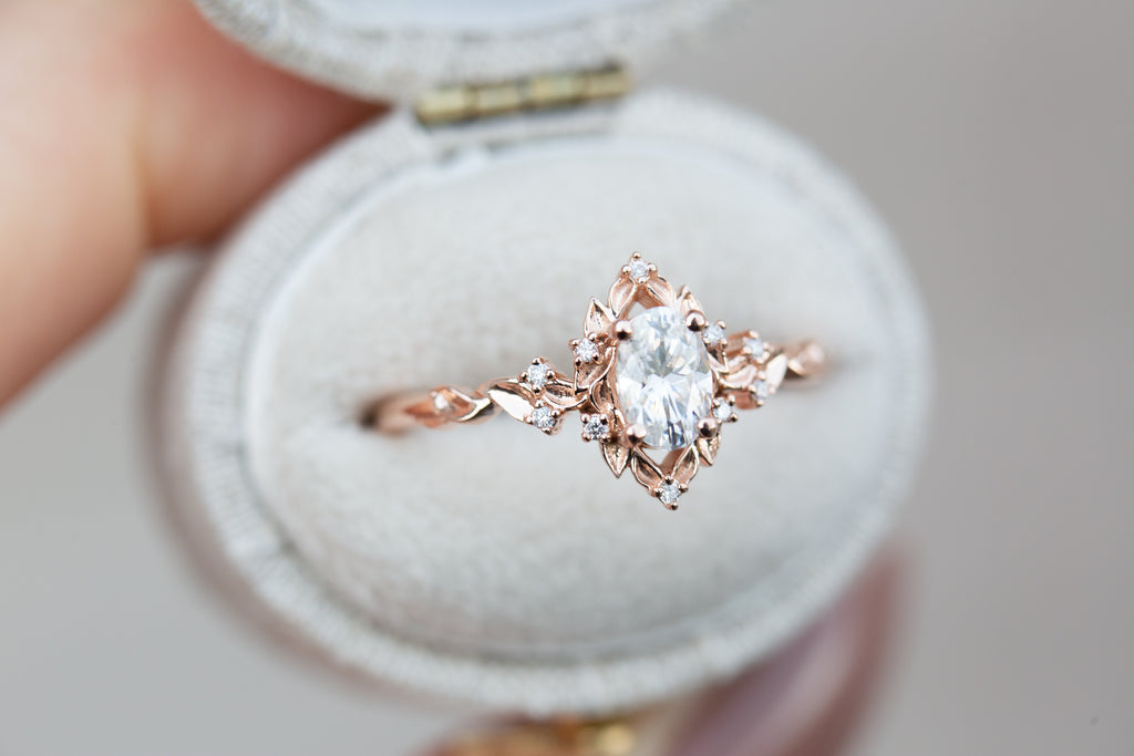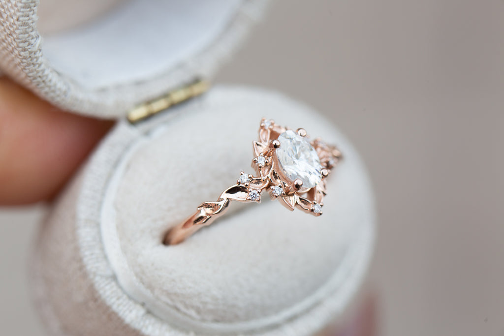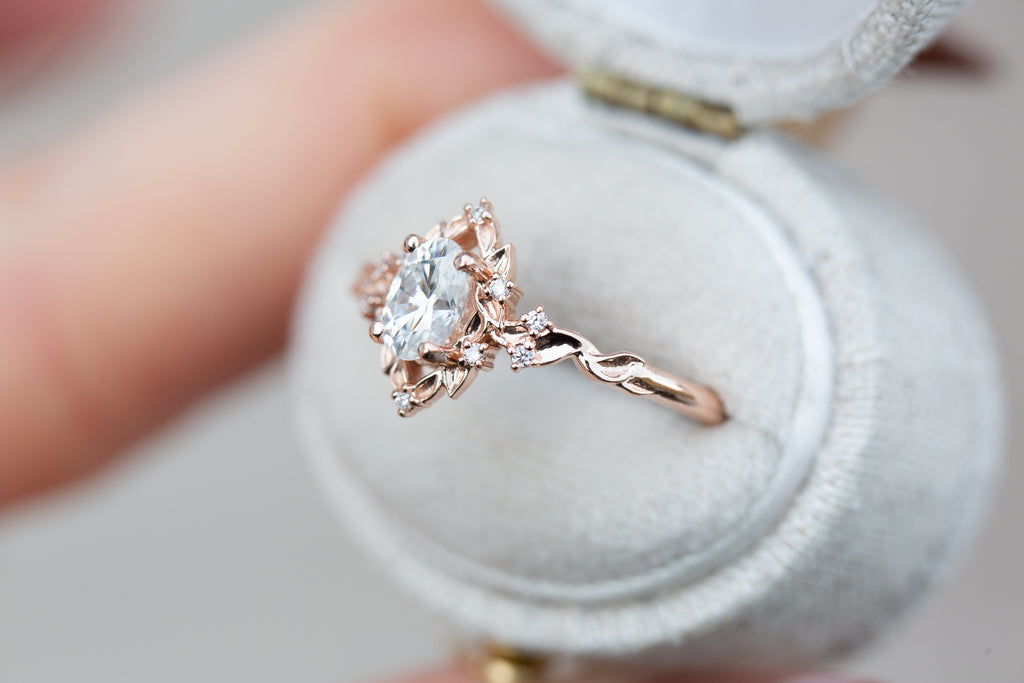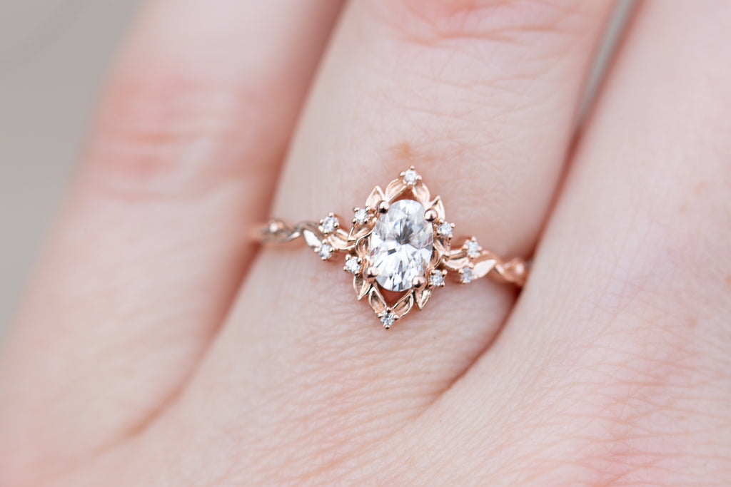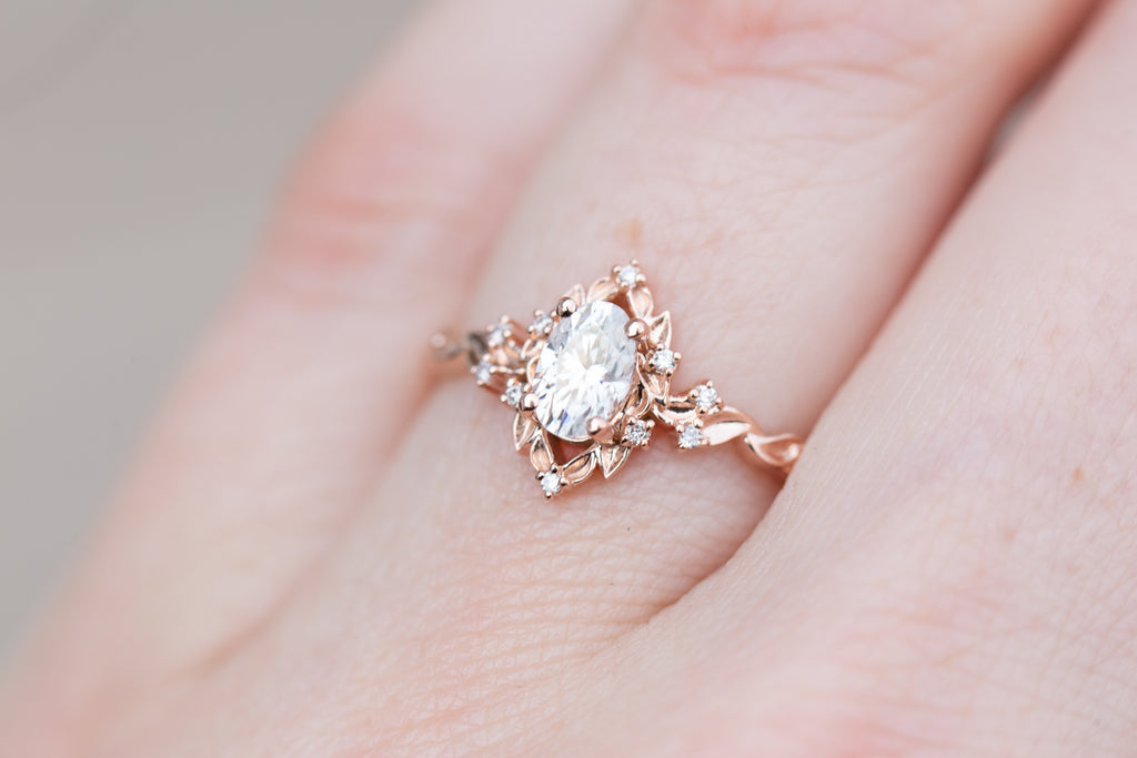 - Woven leaves creating a halo around the center stone, smooth band after last leaves