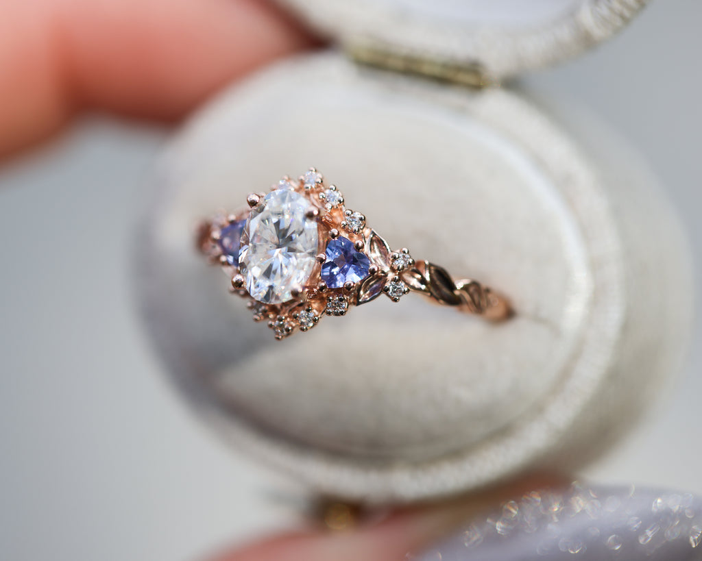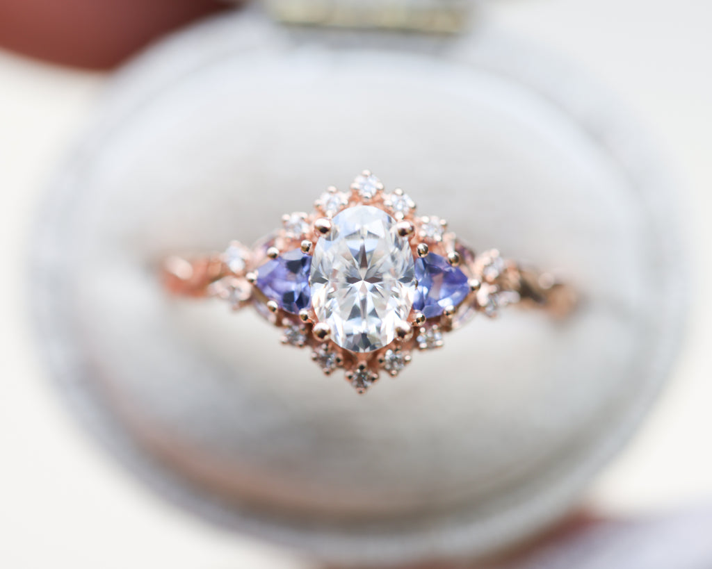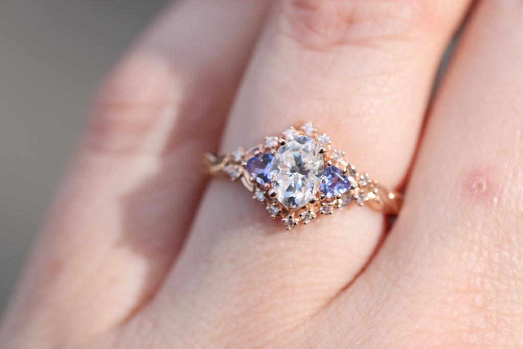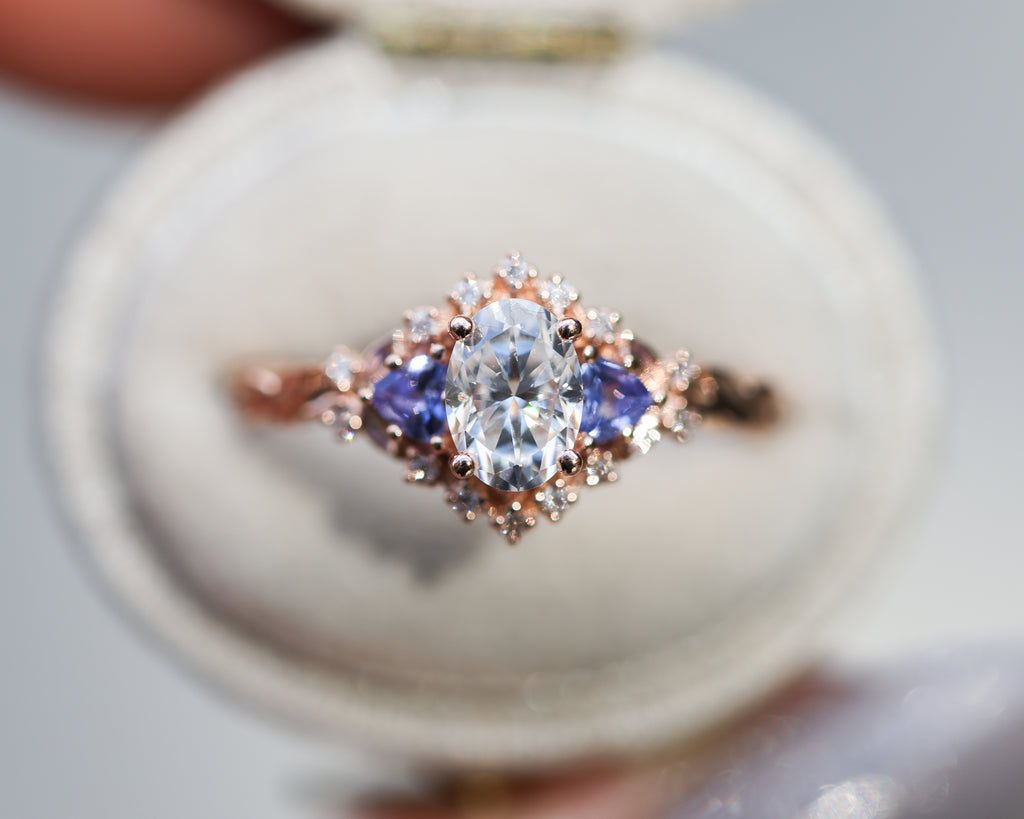 Briar Rose Three Stone Half Halo with moissanite and tanzanite