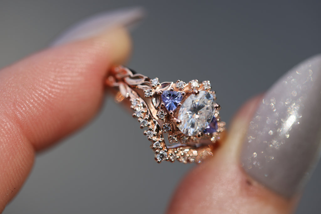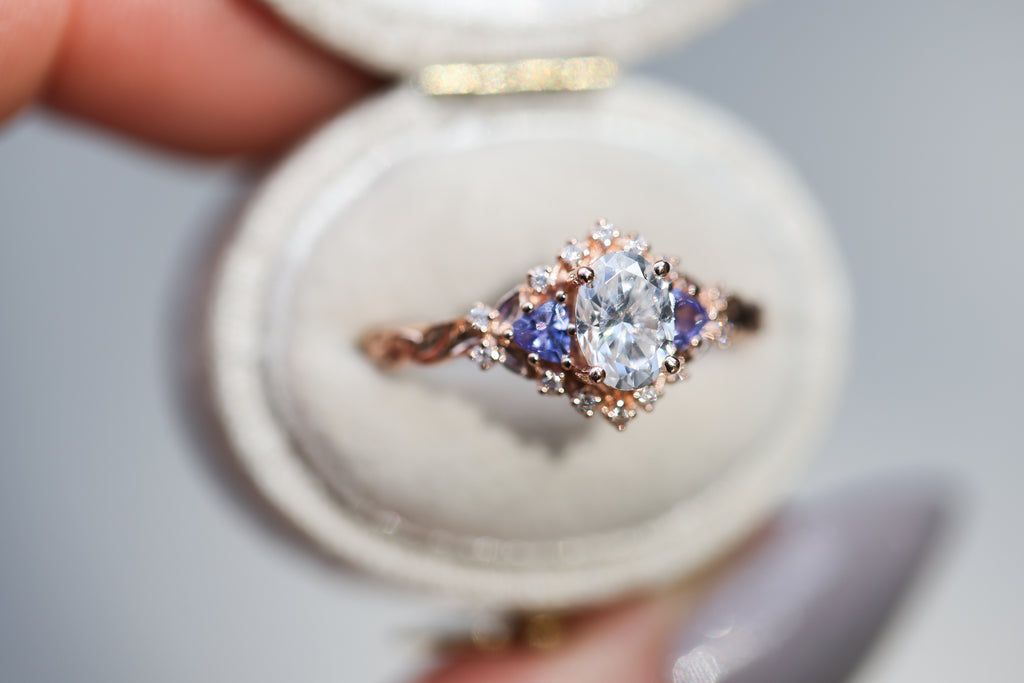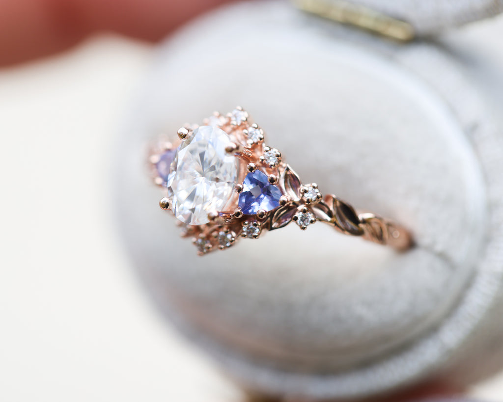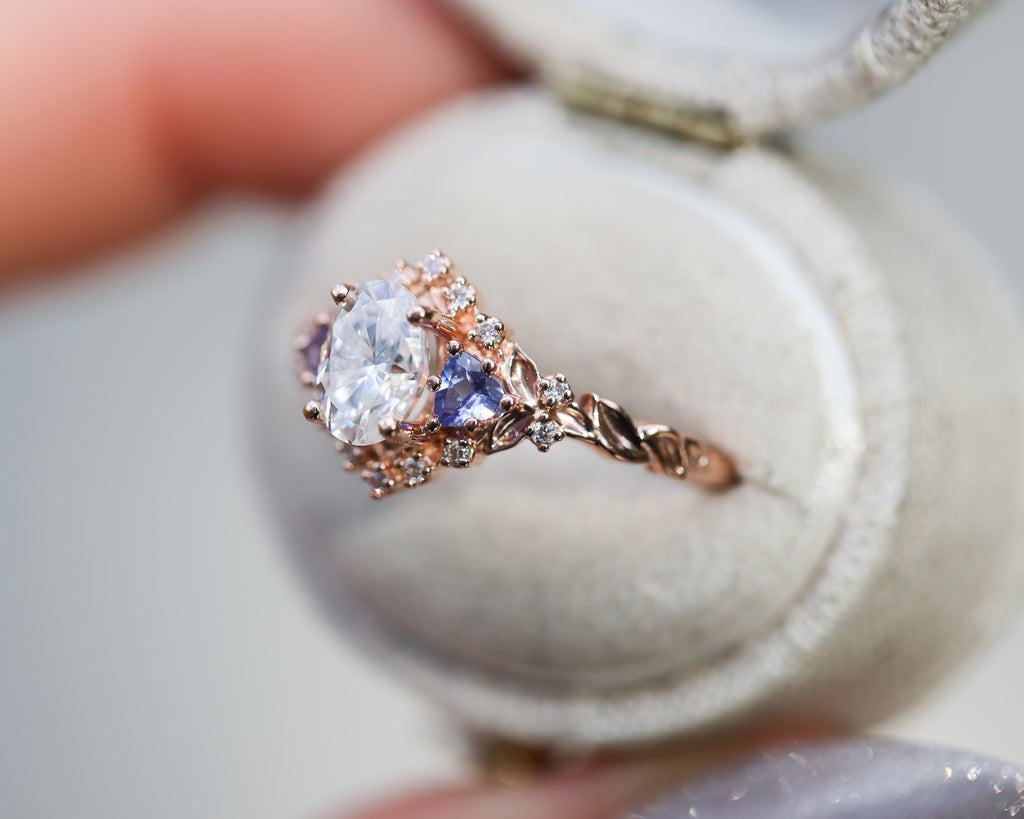 Briar Rose Three Stone Half Halo with moissanite and tanzanite