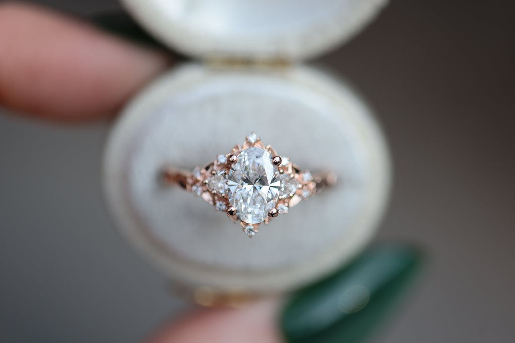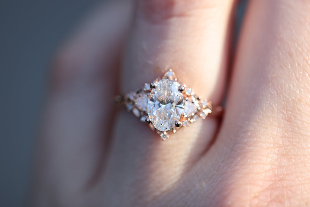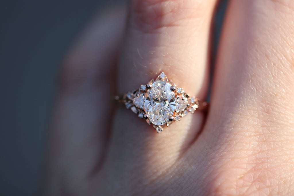 - Approximately 1.2ct oval lab diamond (D-F color, VS2 or better) center. Stone will be hand selected by Uma.