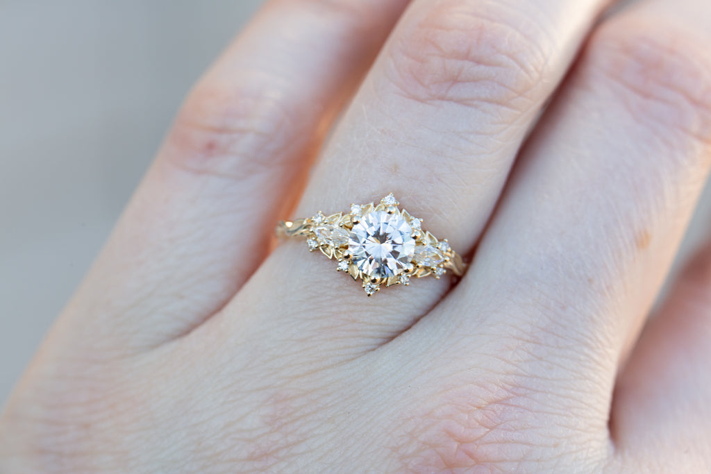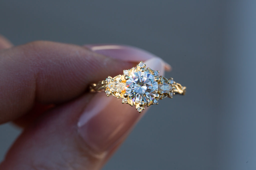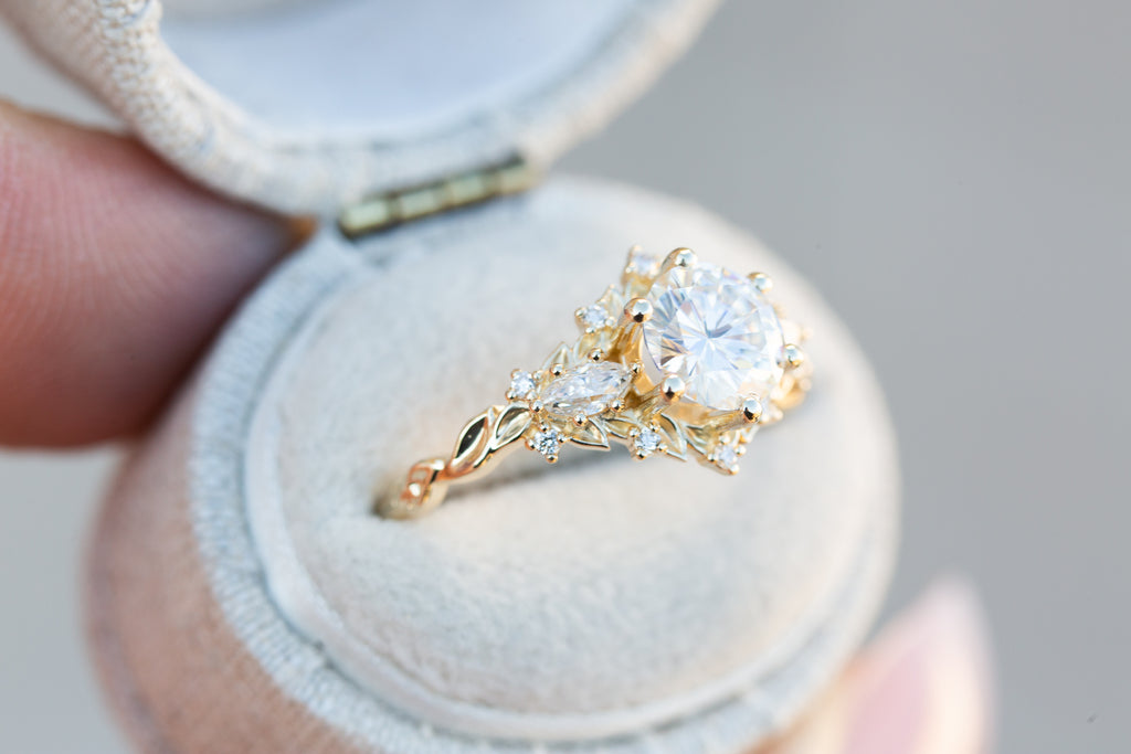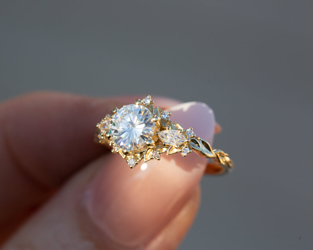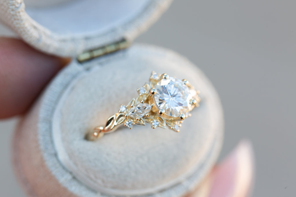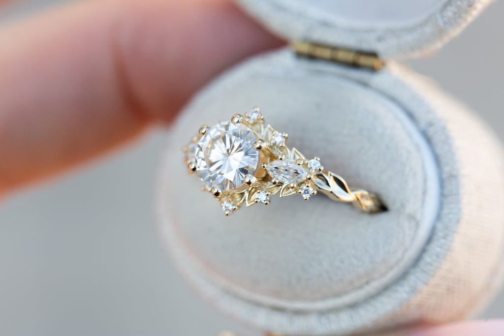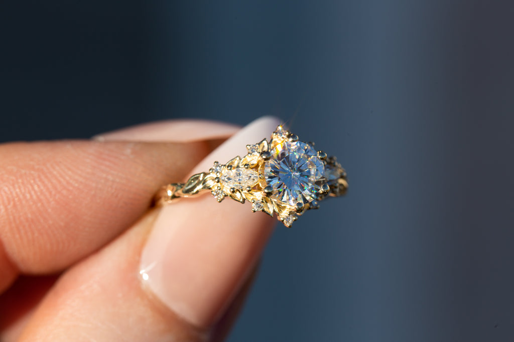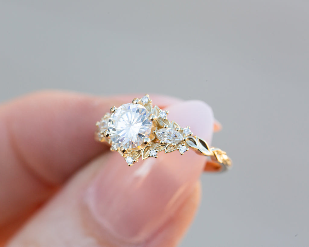 Briar Rose Three Stone with 6.5mm round moissanite and marquise side stones