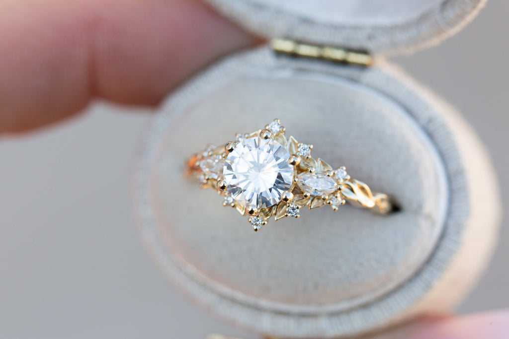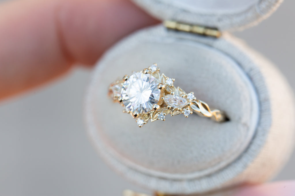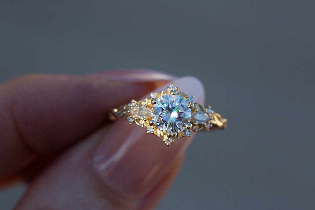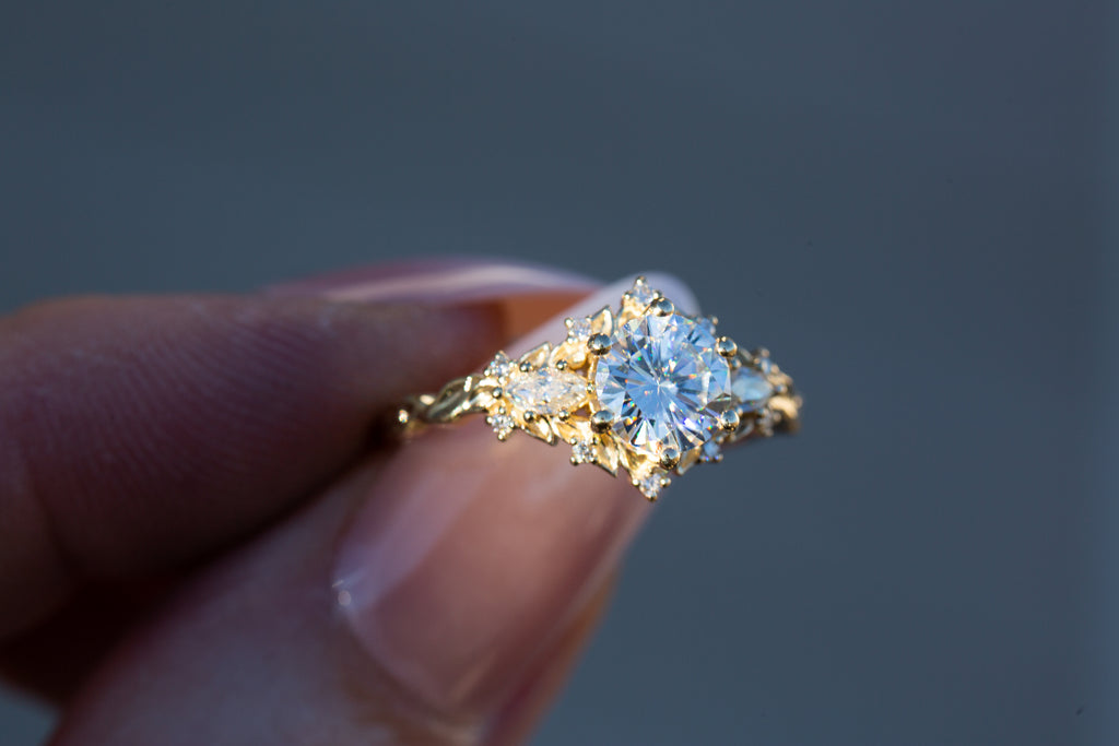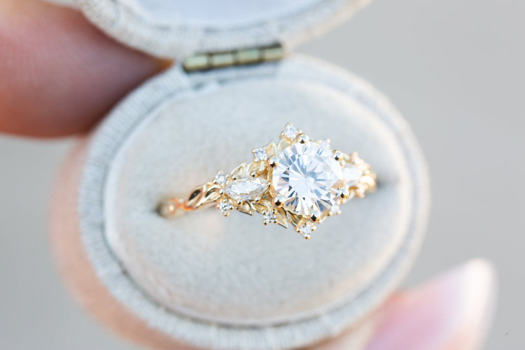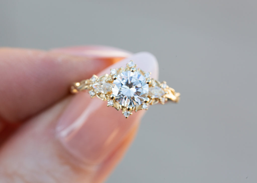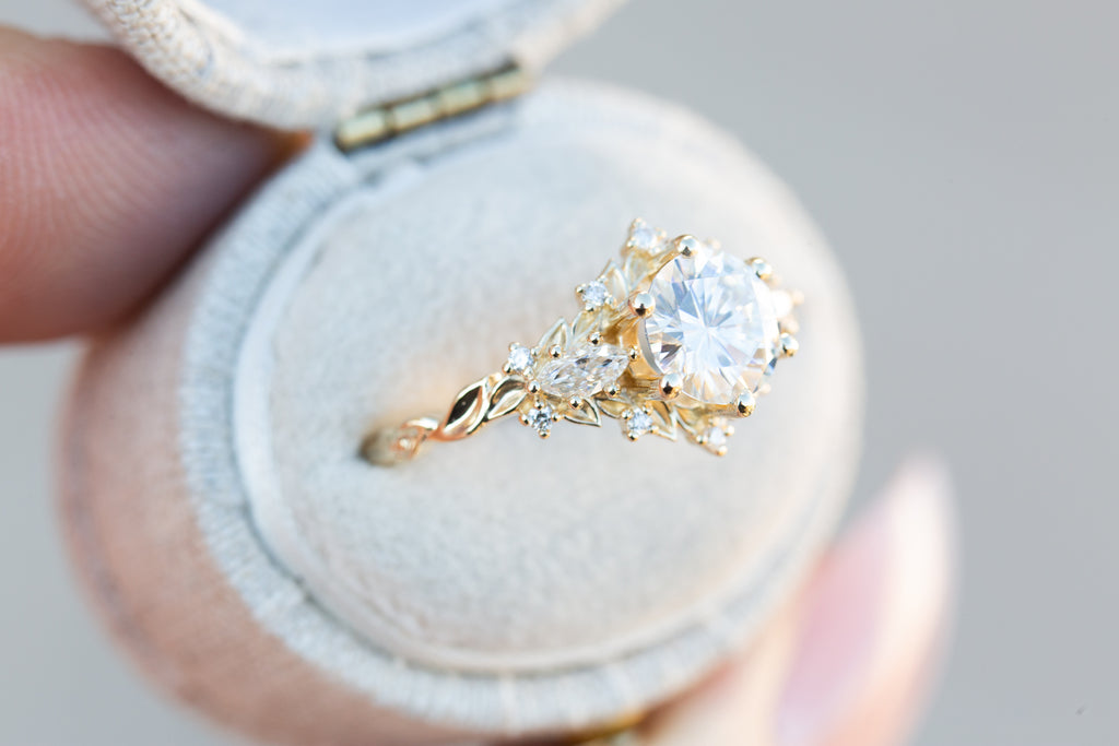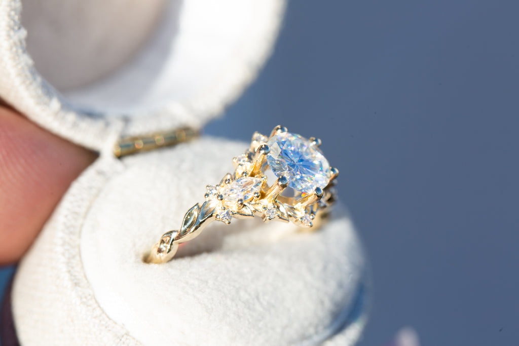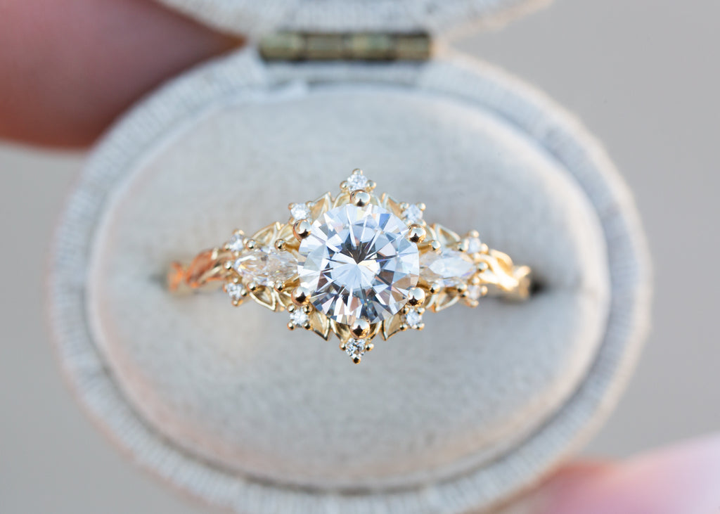 Briar Rose Three Stone with 6.5mm round moissanite and marquise side stones