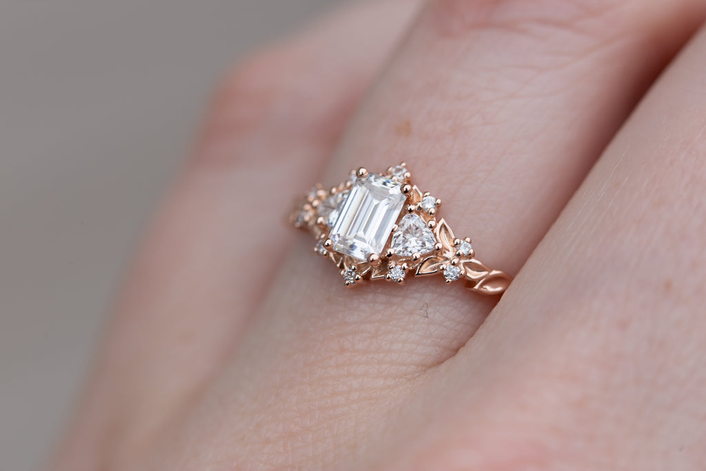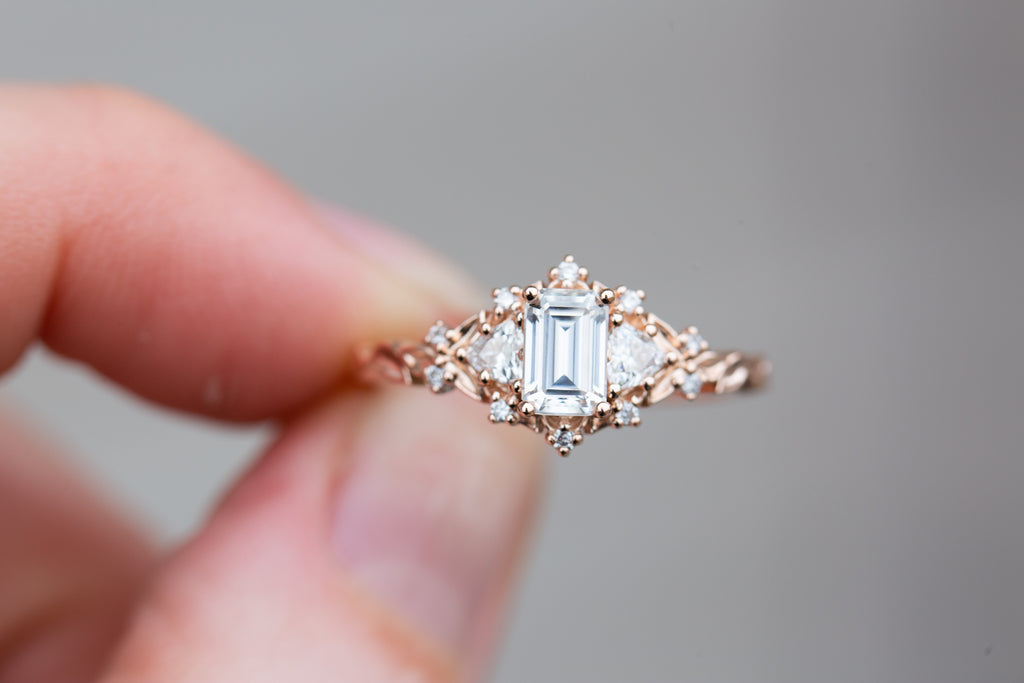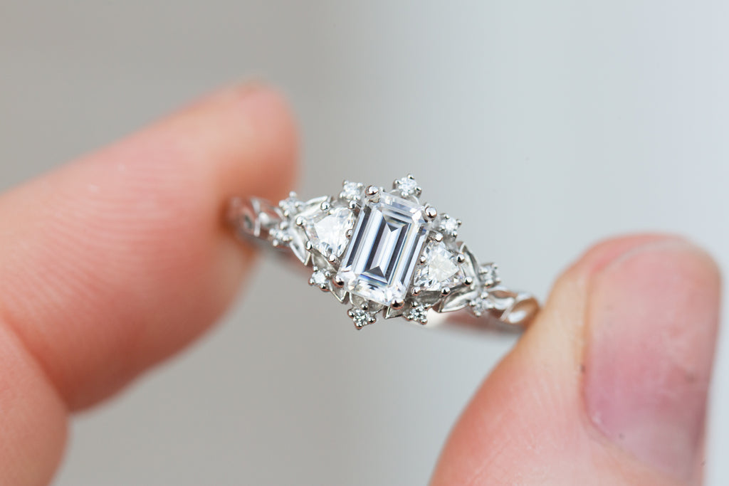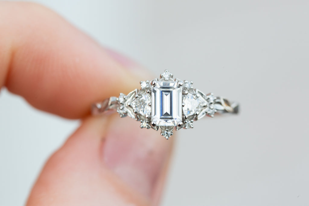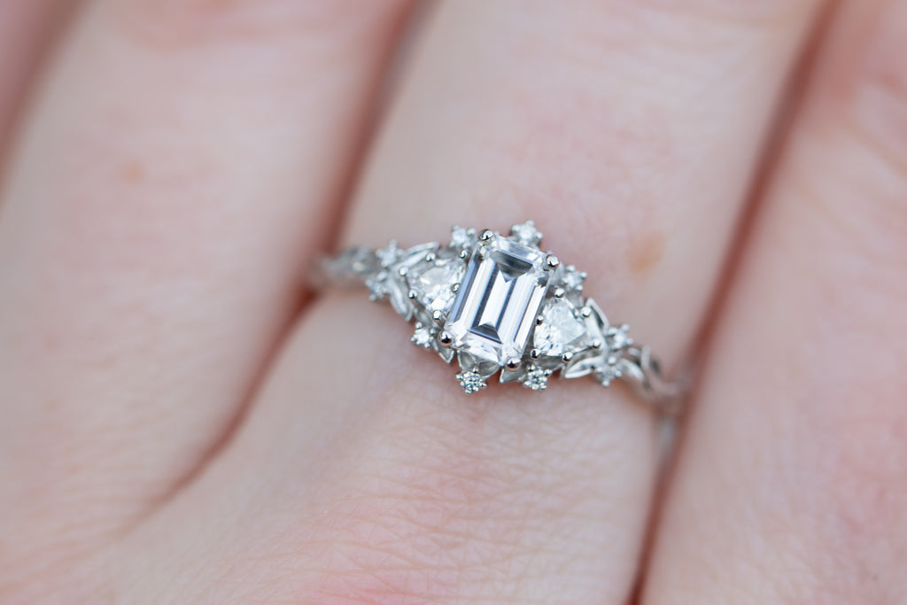 Briar Rose Three Stone with 6x4mm emerald cut moissanite