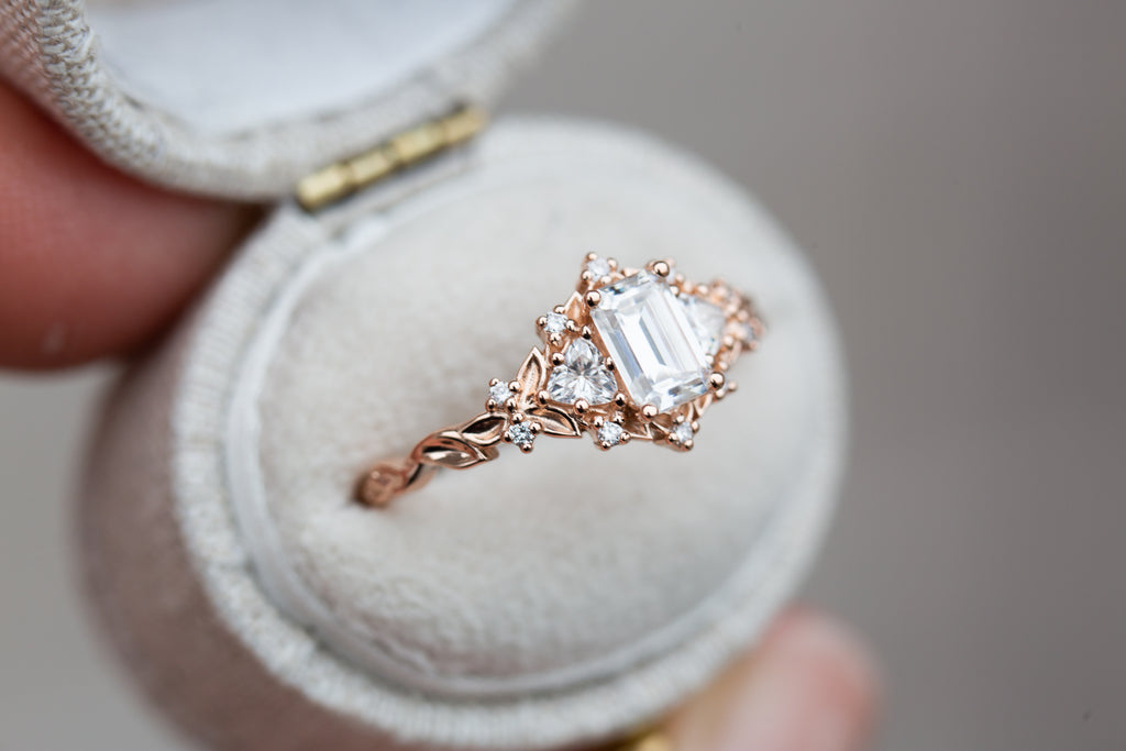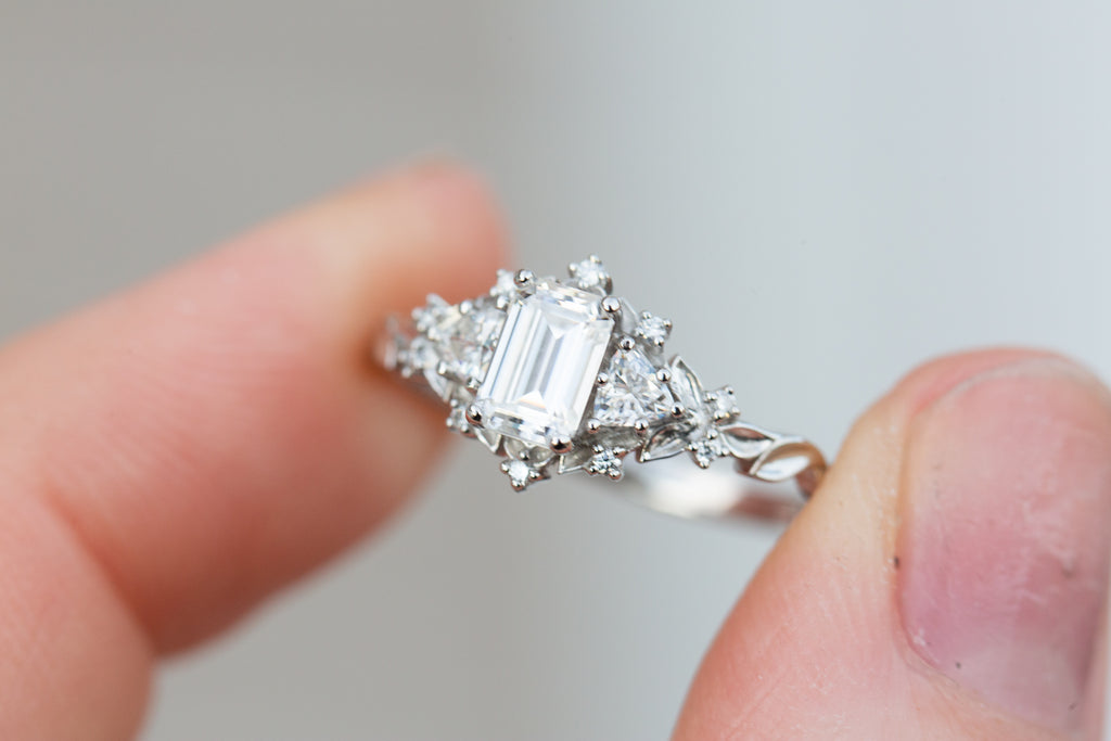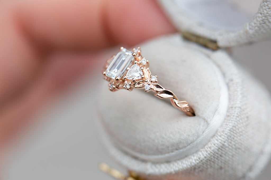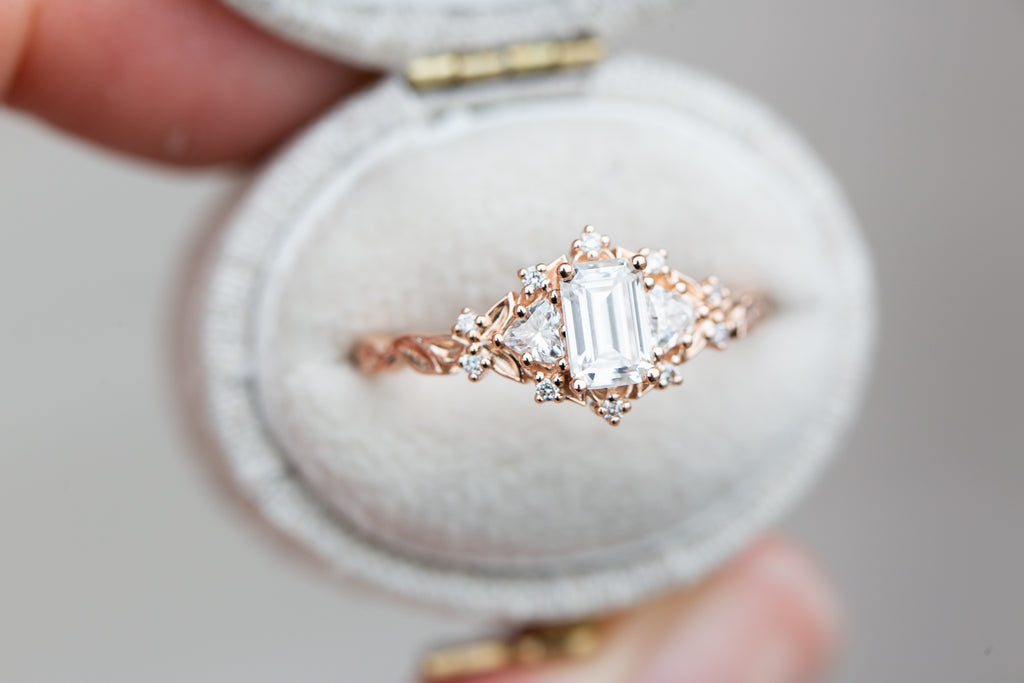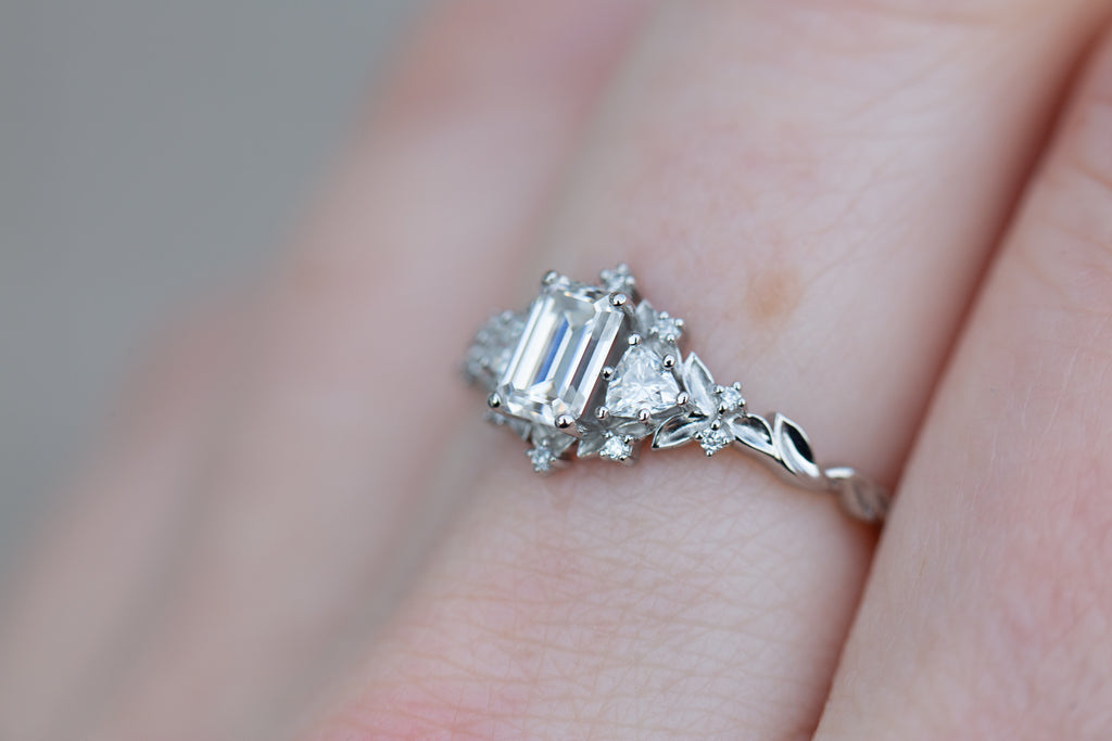 Briar Rose Three Stone with 6x4mm emerald cut moissanite