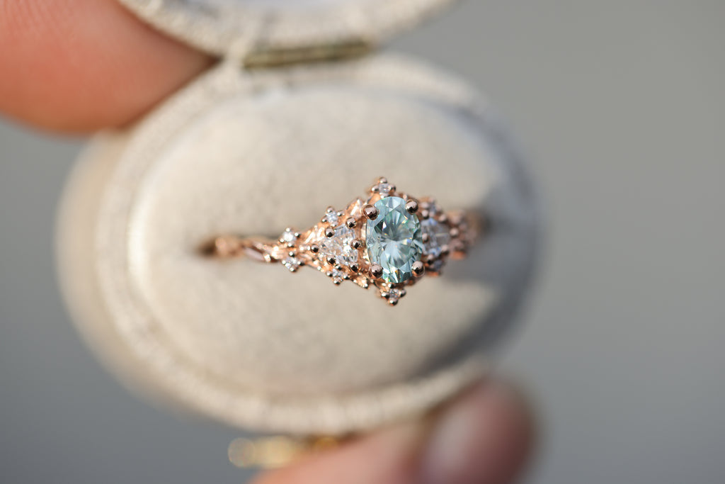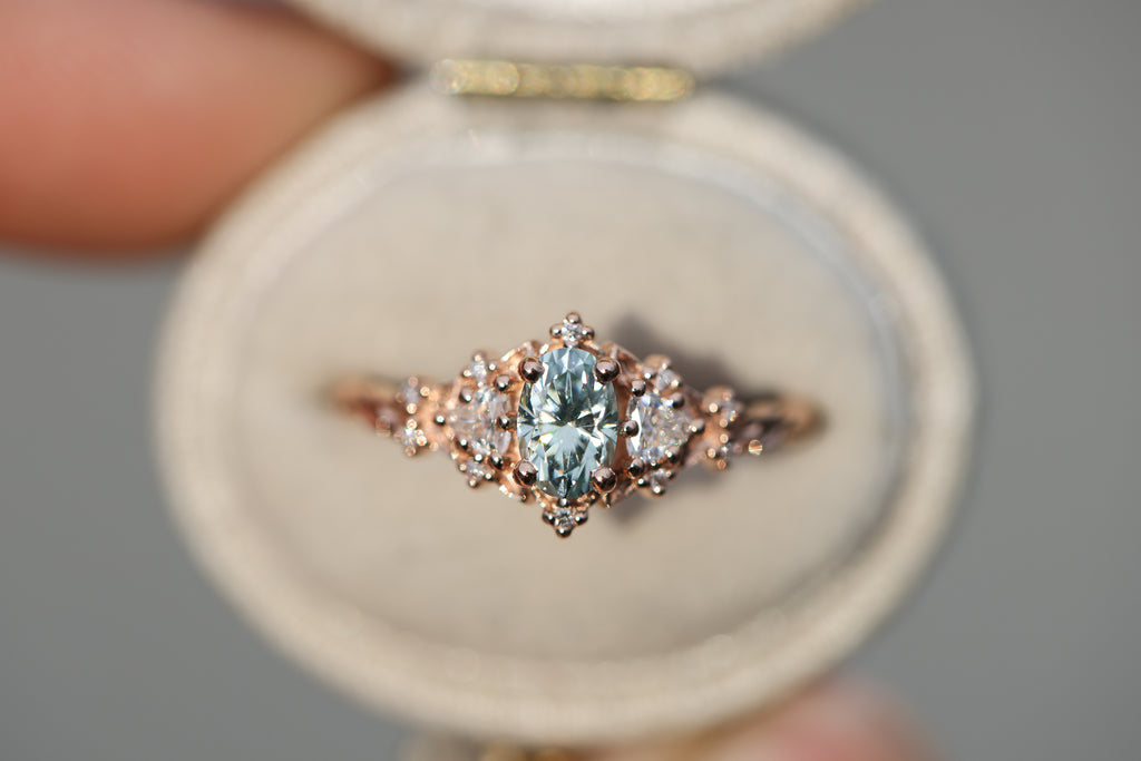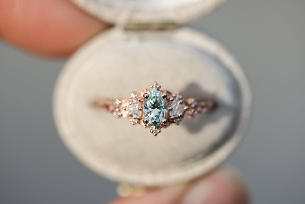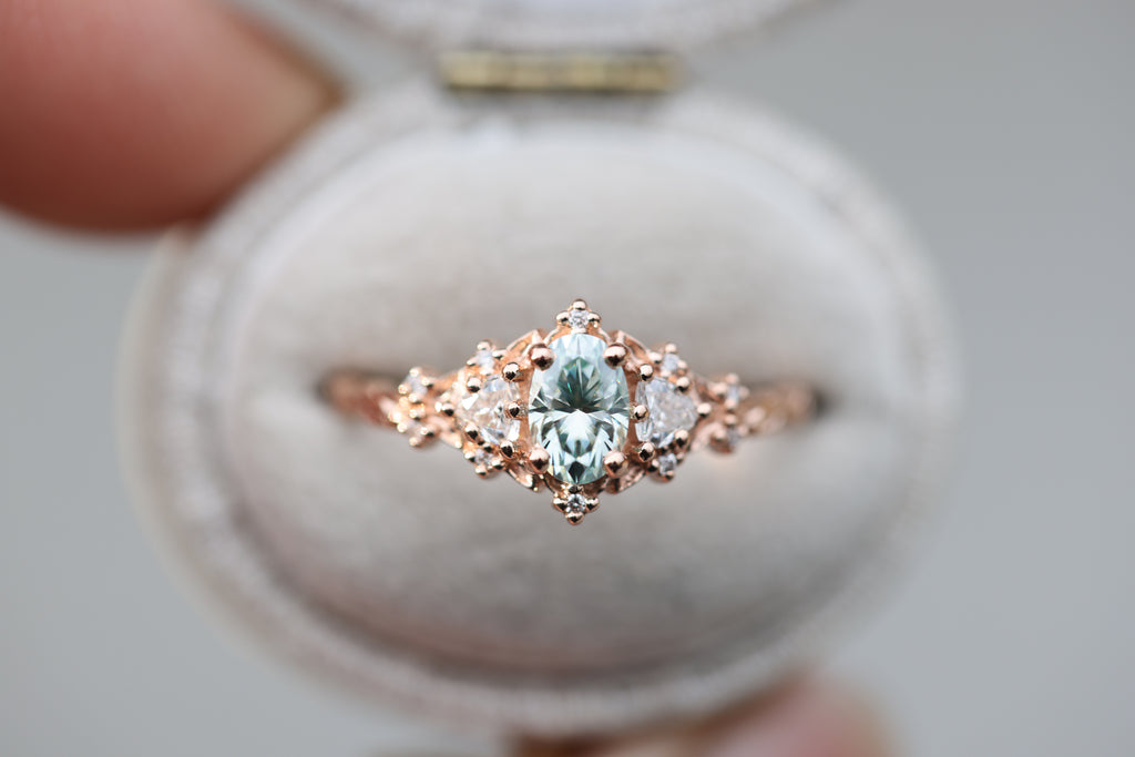 Briar Rose Three Stone with 6x4mm oval teal moissanite