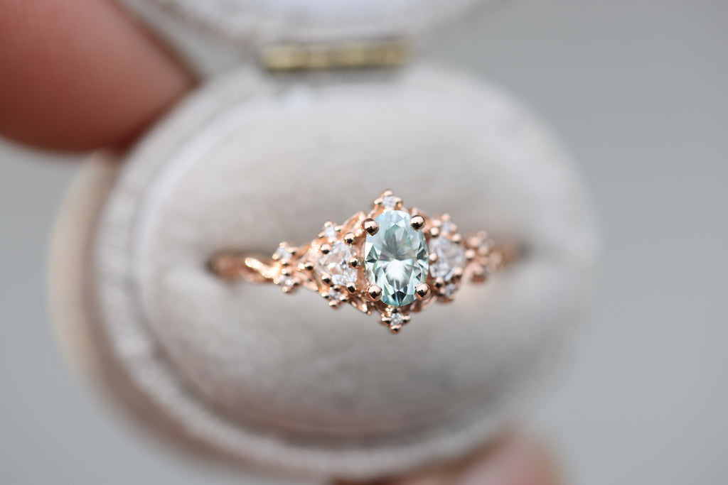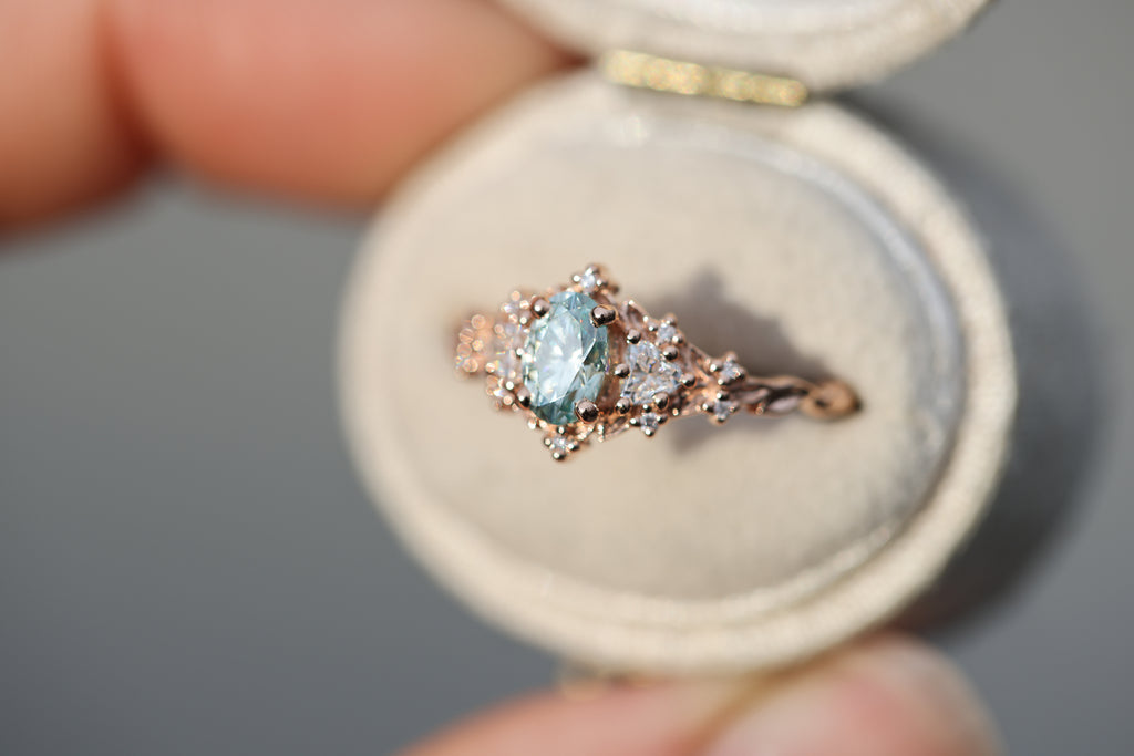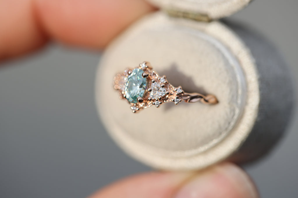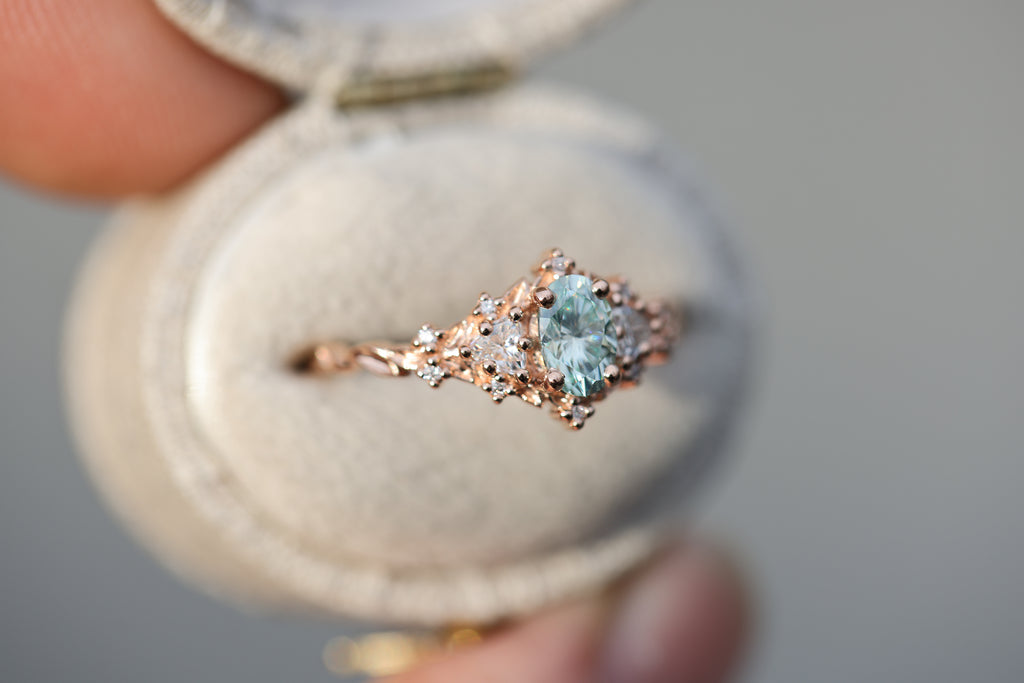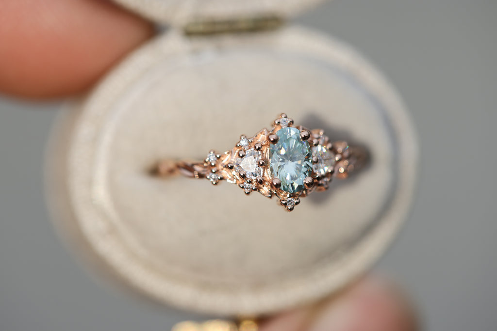 Briar Rose Three Stone with 6x4mm oval teal moissanite