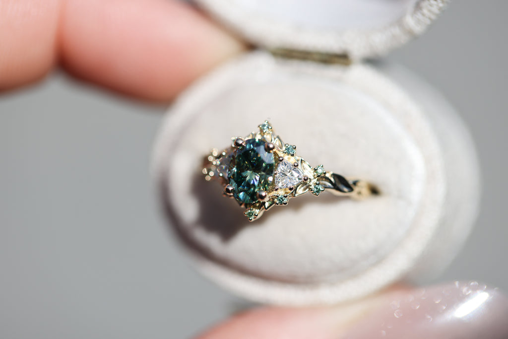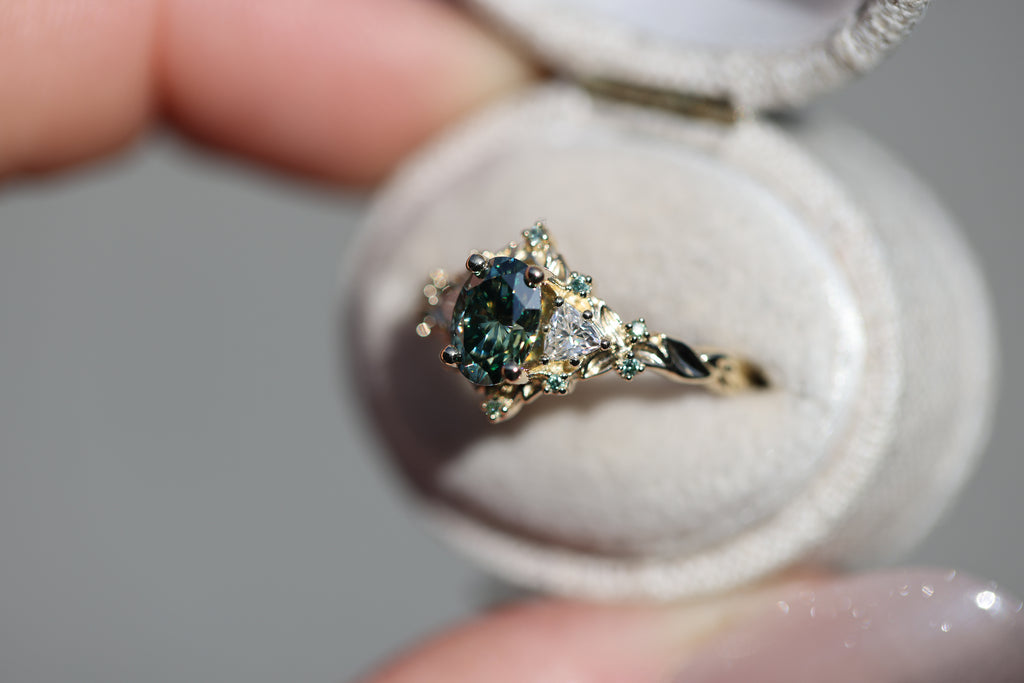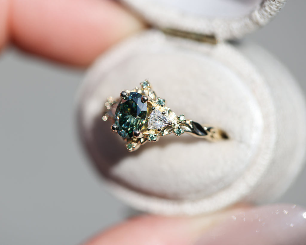 Briar Rose Three Stone with 7x5mm oval teal moissanite center