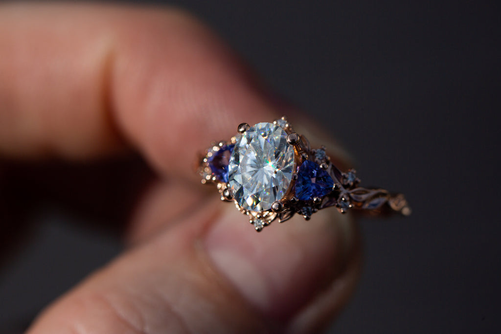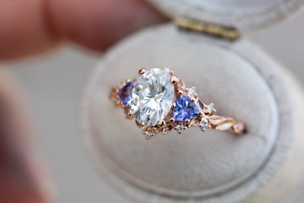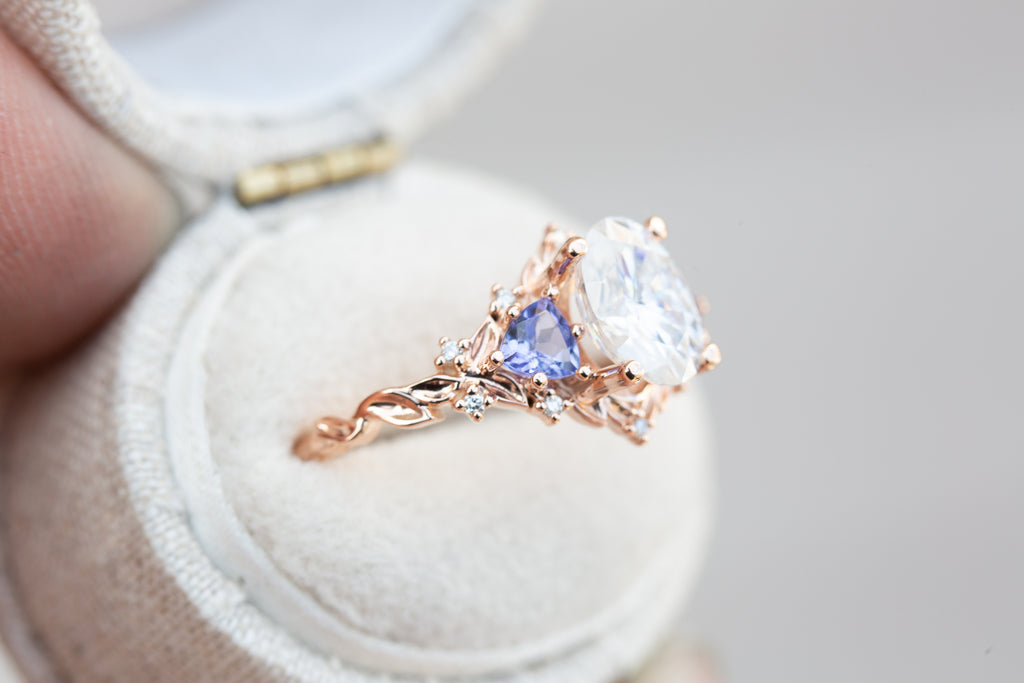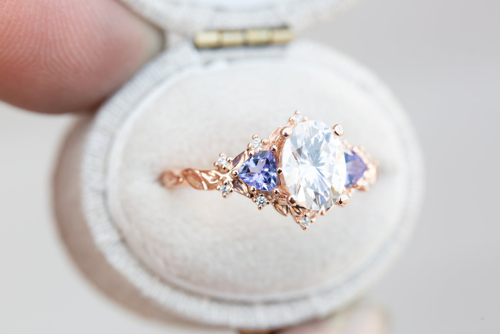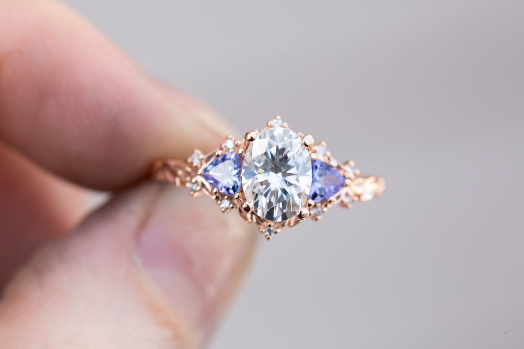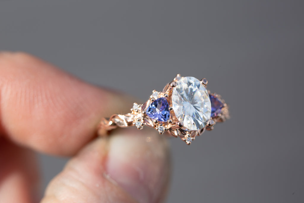 Briar Rose Three Stone with 8x6mm oval moissanite and tanzanite