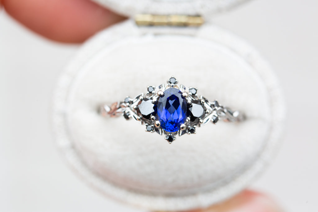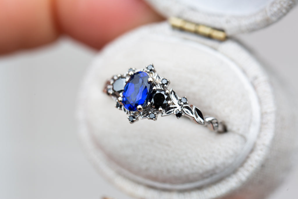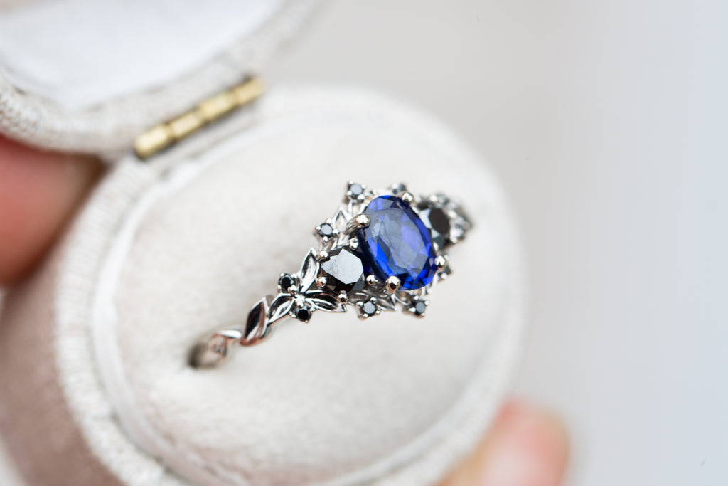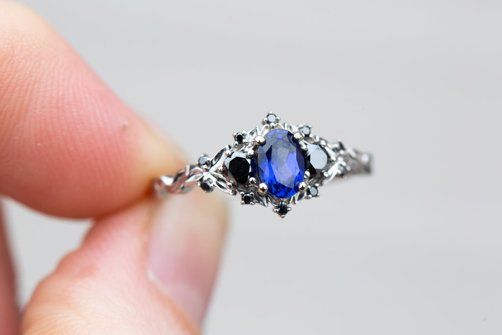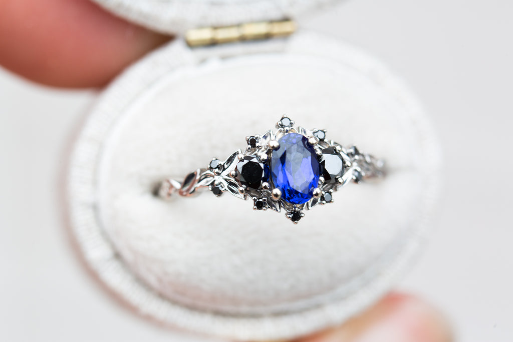 Briar Rose Three Stone with blue sapphire and black diamonds