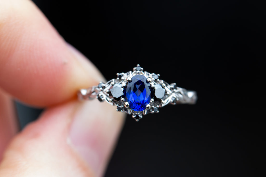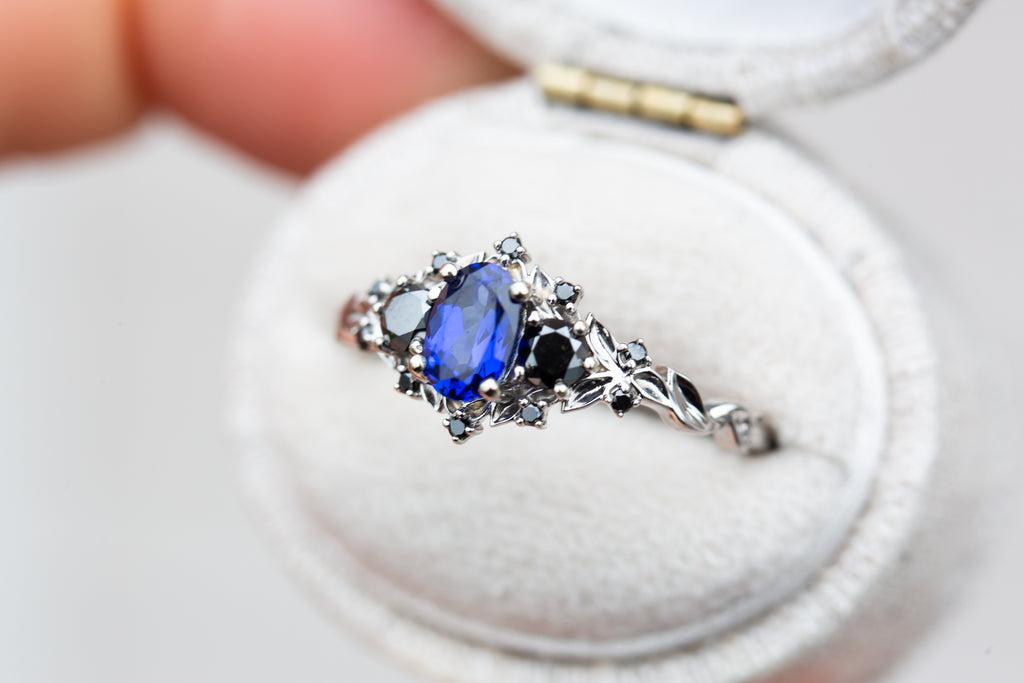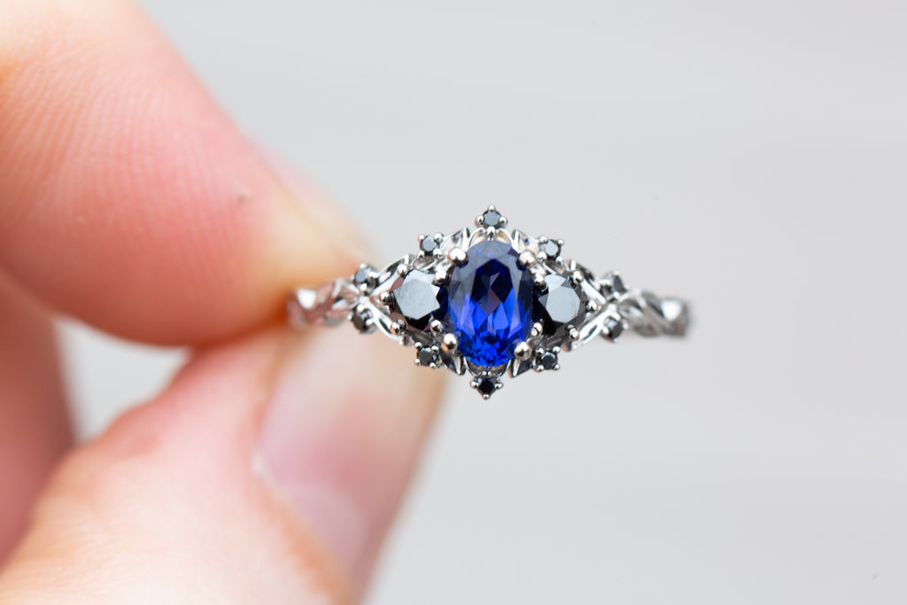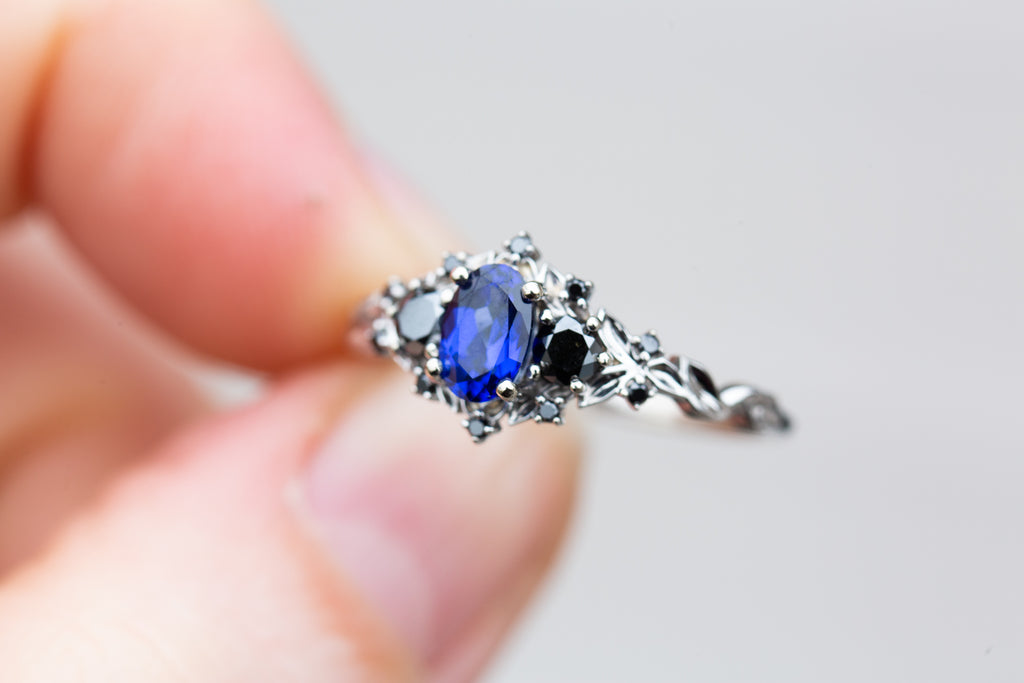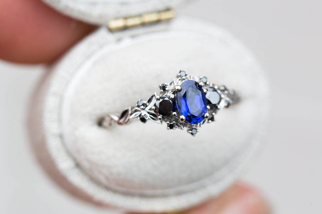 Briar Rose Three Stone with blue sapphire and black diamonds