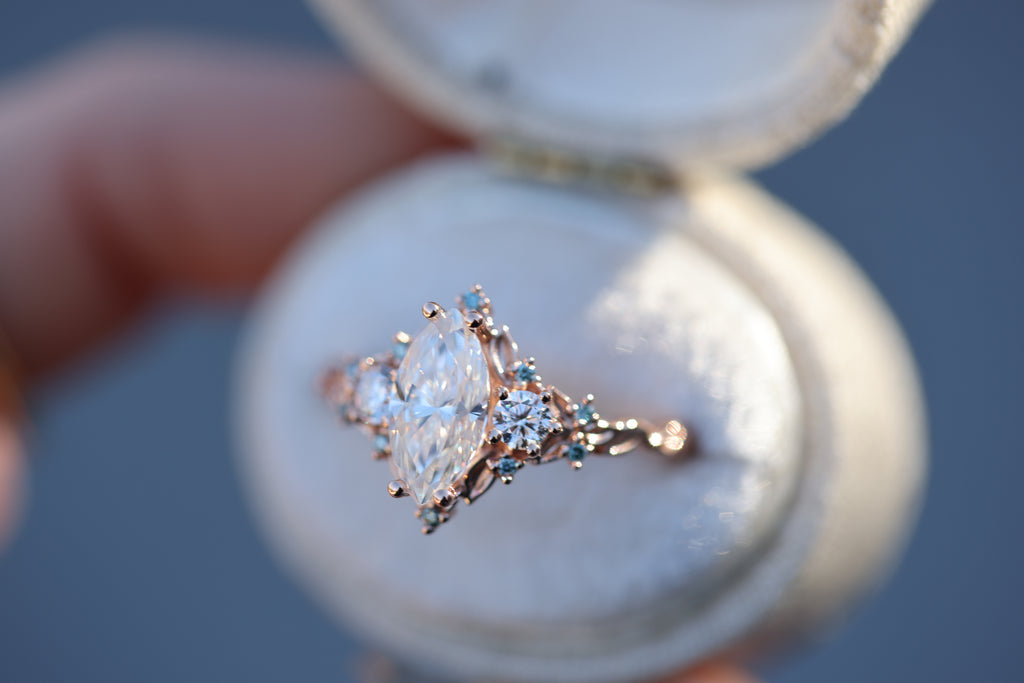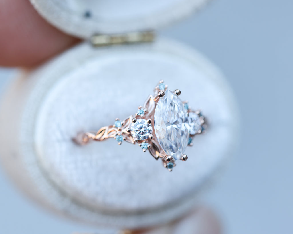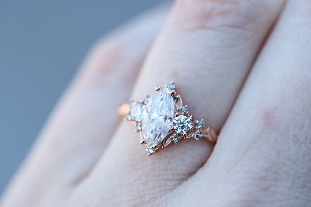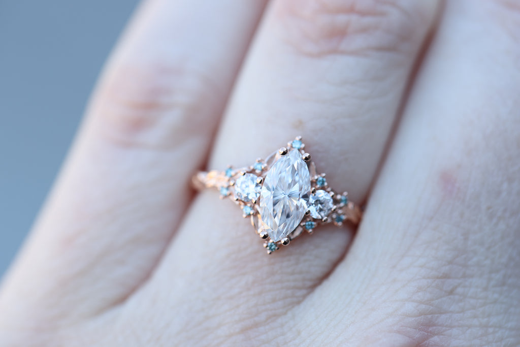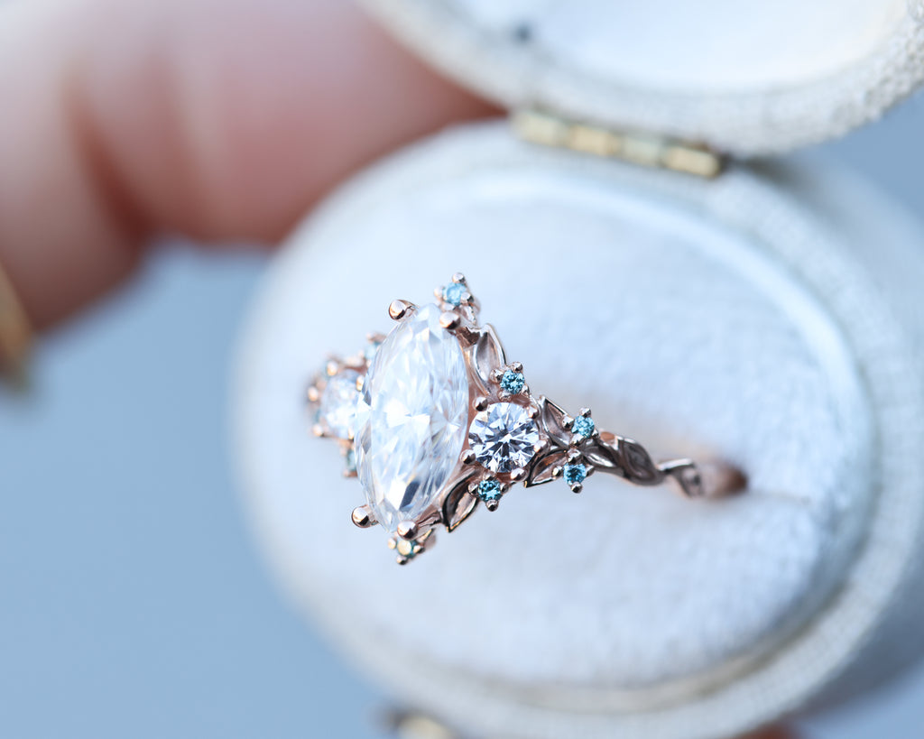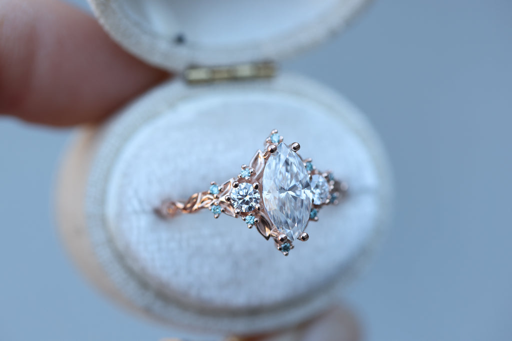 Briar Rose Three Stone with marquise 10x5mm moissanite and aqua diamonds