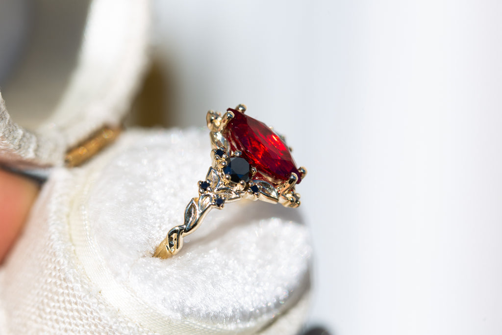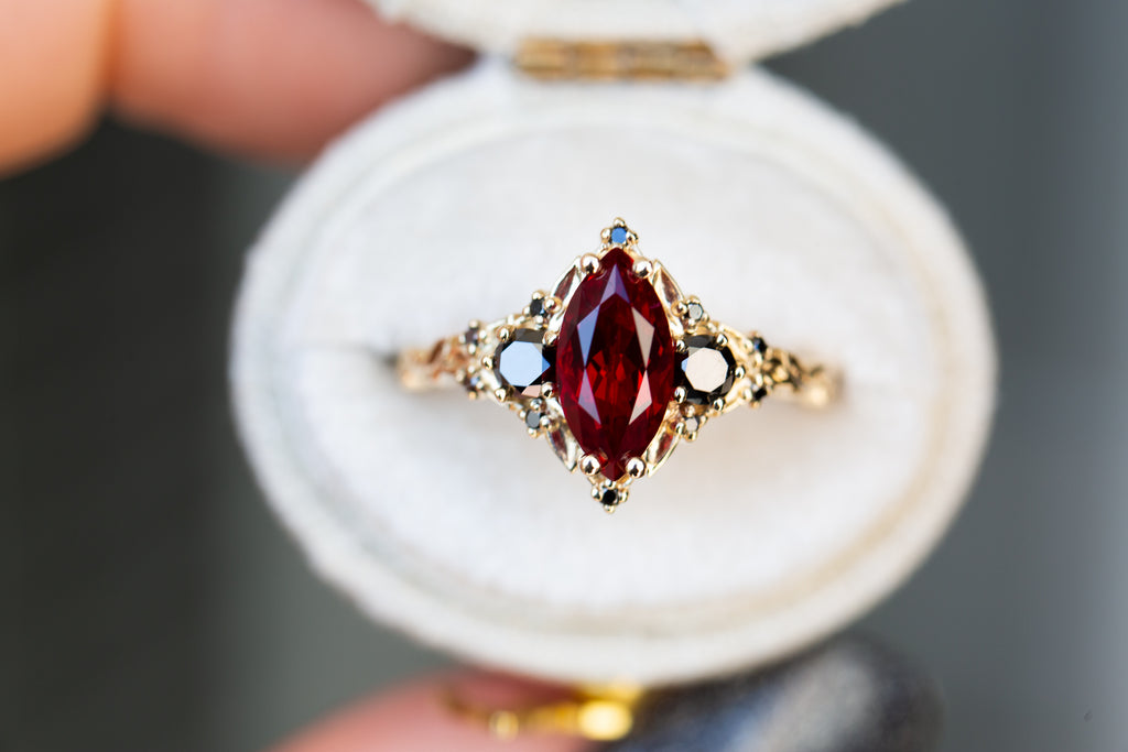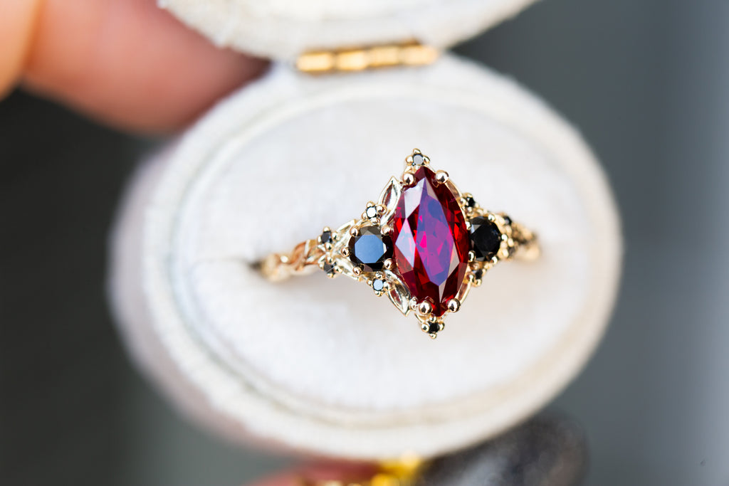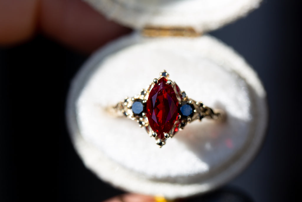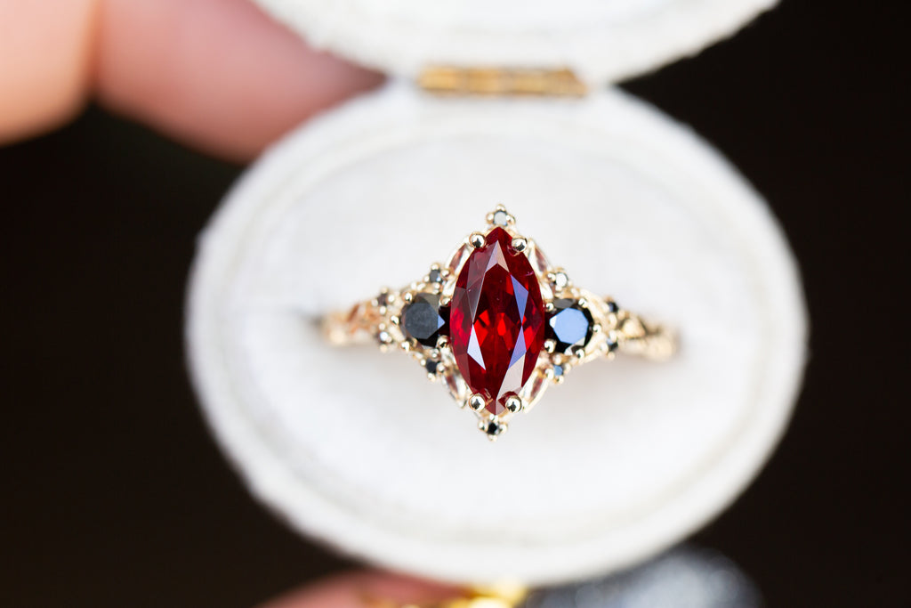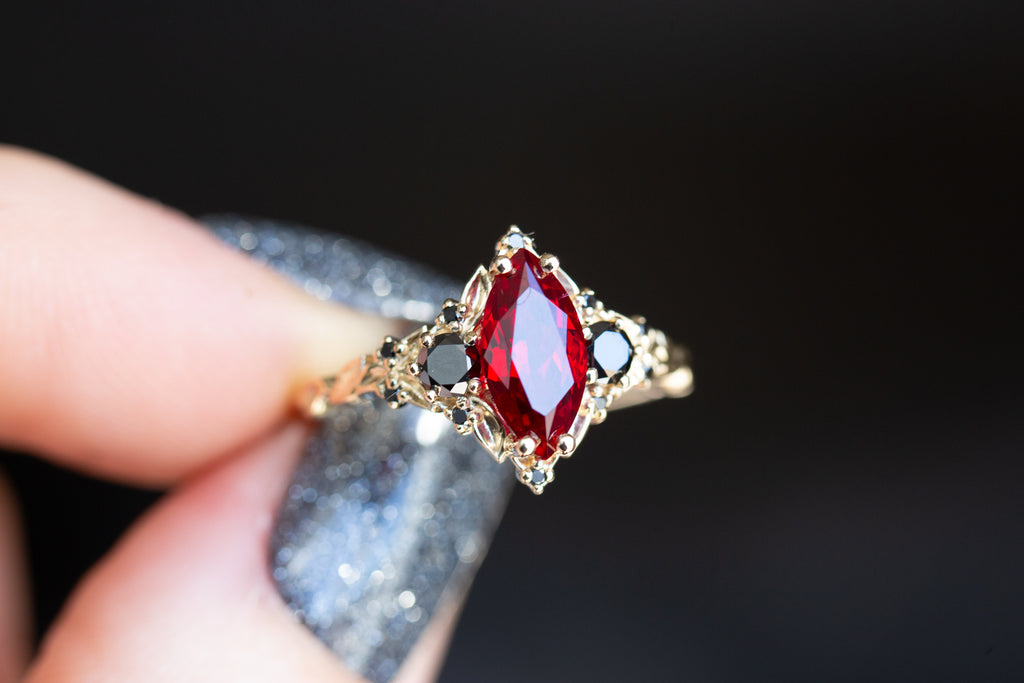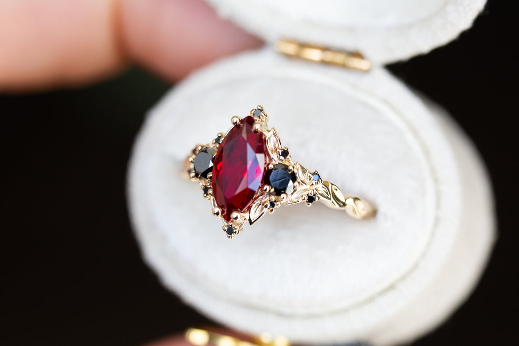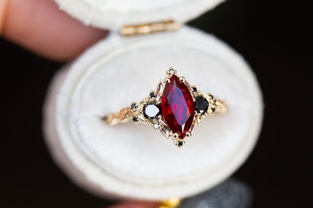 Briar Rose Three Stone with marquise lab ruby and black diamonds