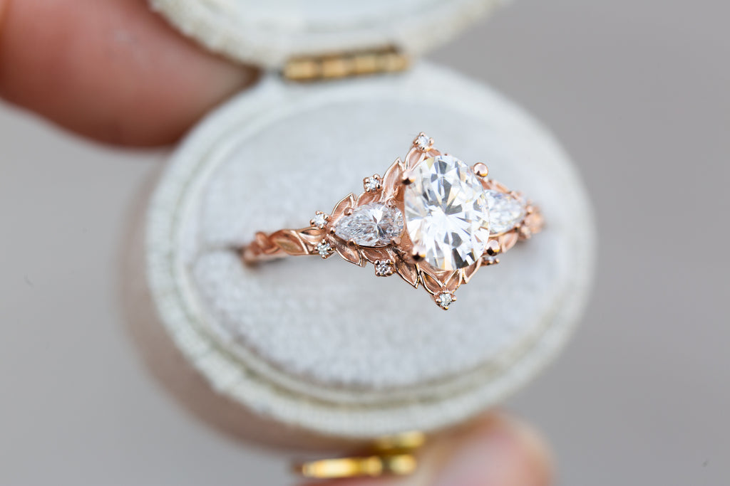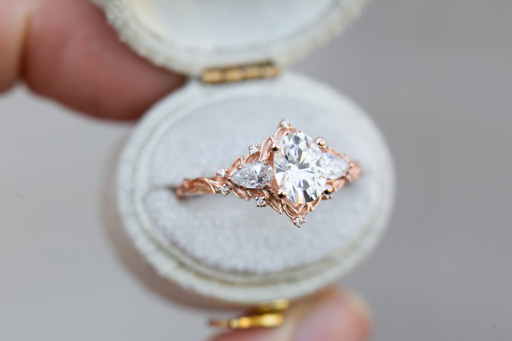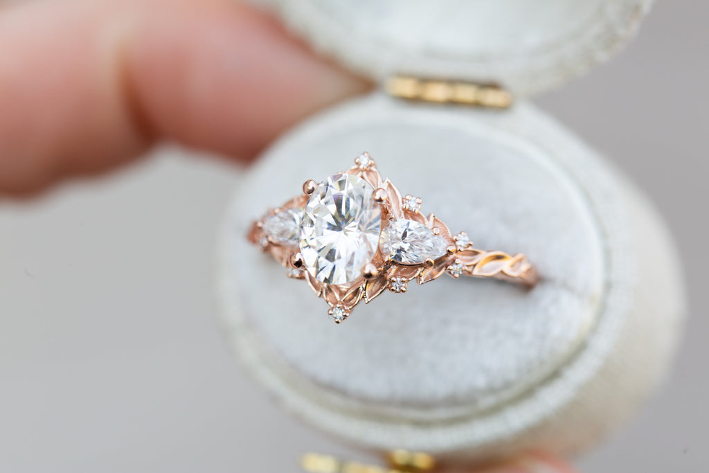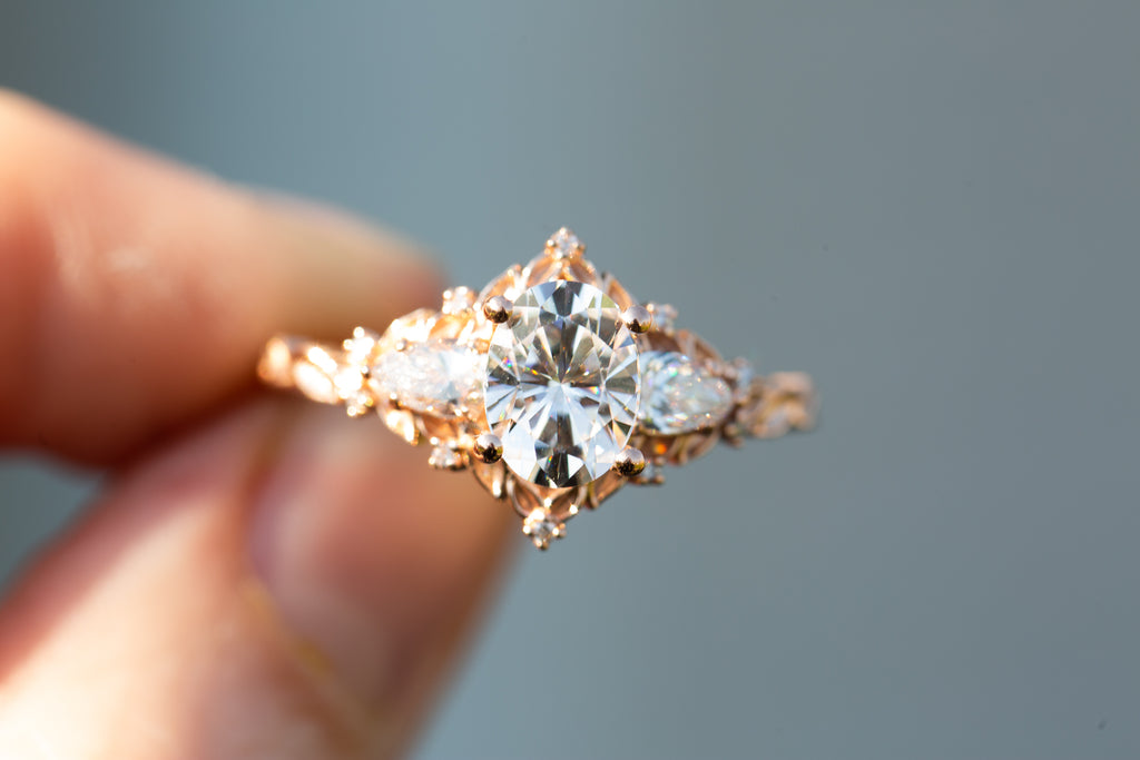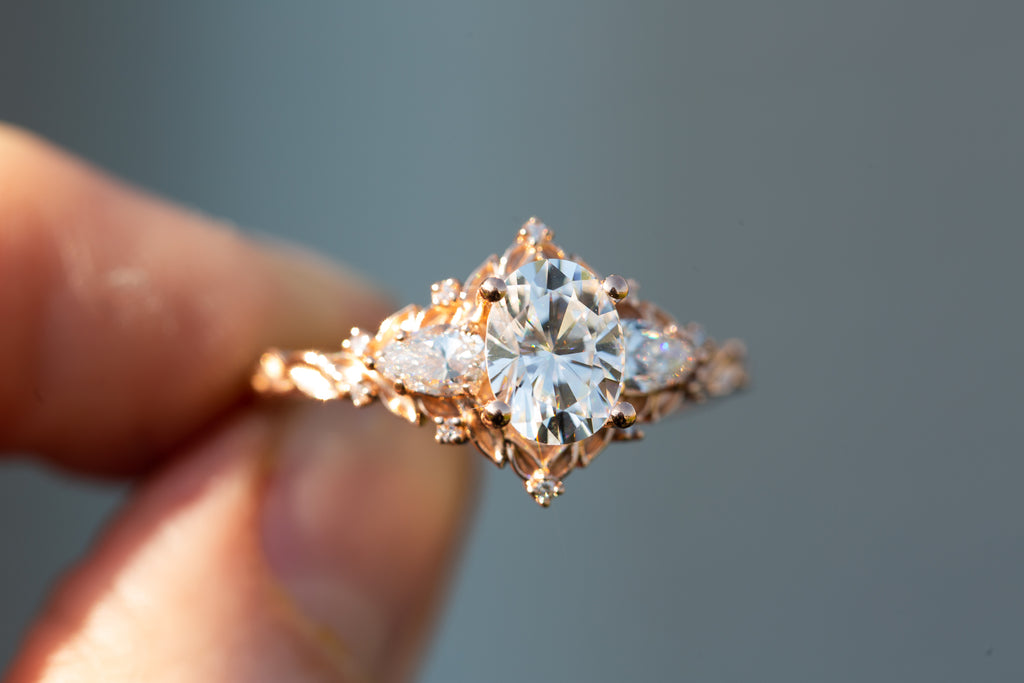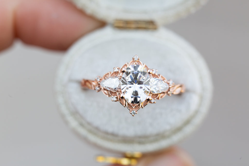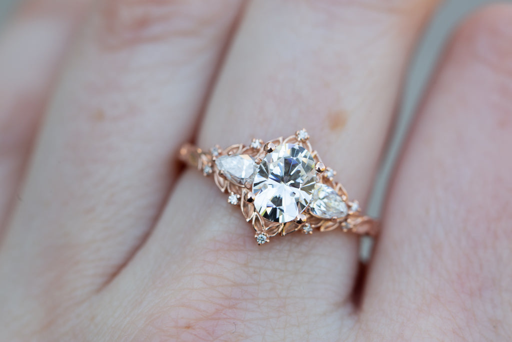 Briar Rose Three Stone with oval moissanite and pear side stones
