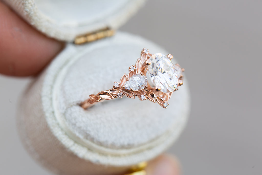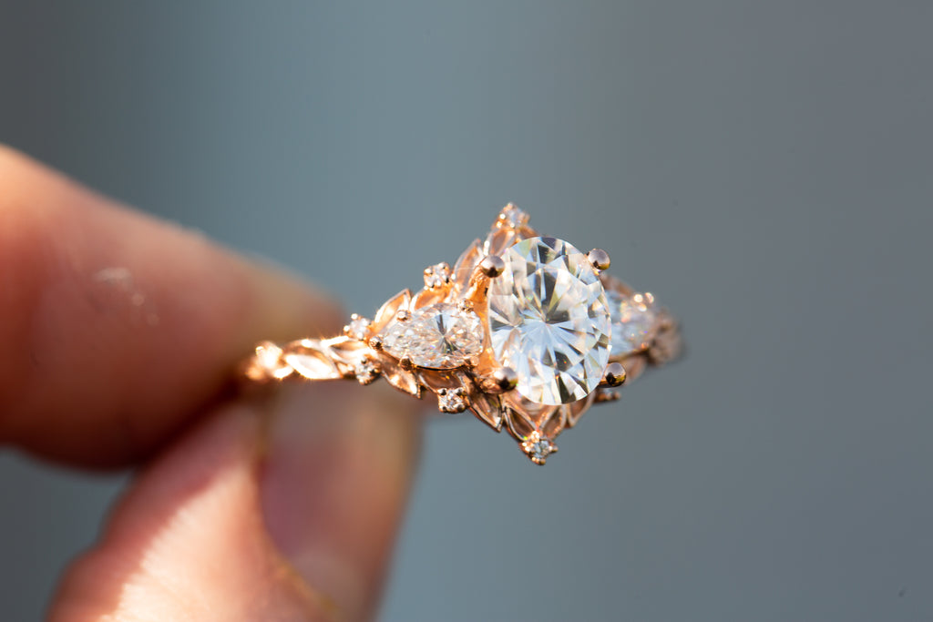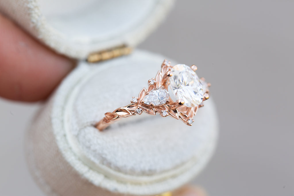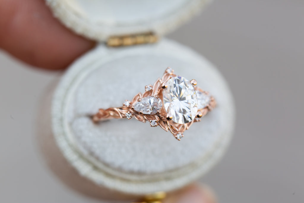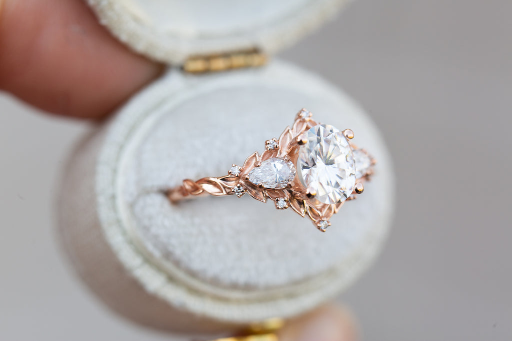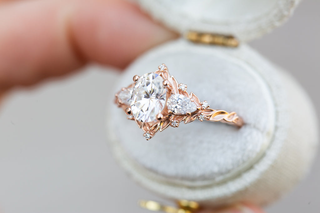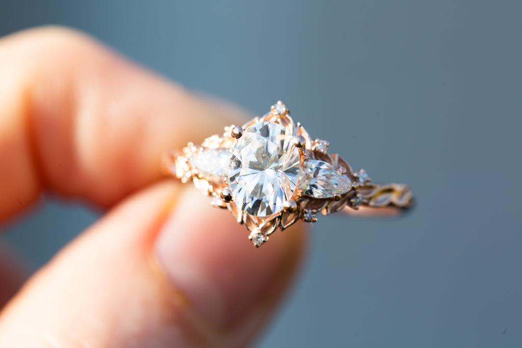 Briar Rose Three Stone with oval moissanite and pear side stones