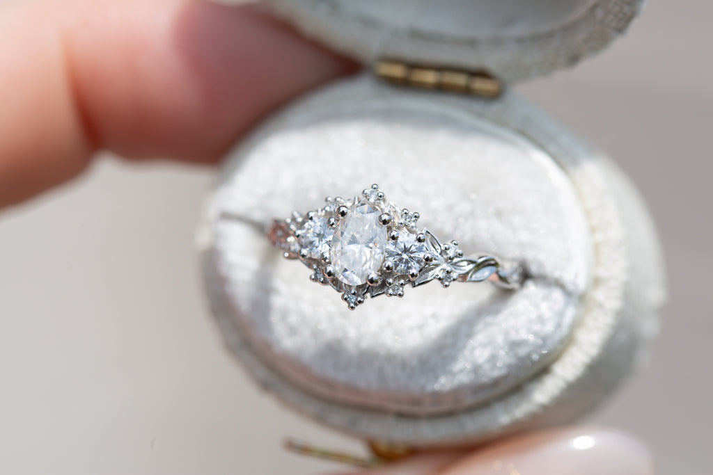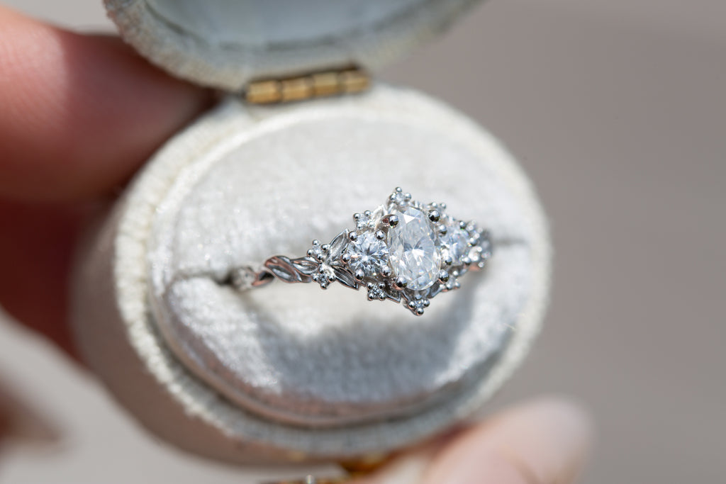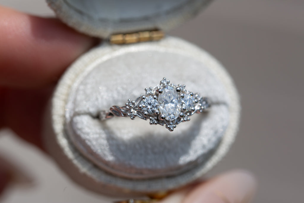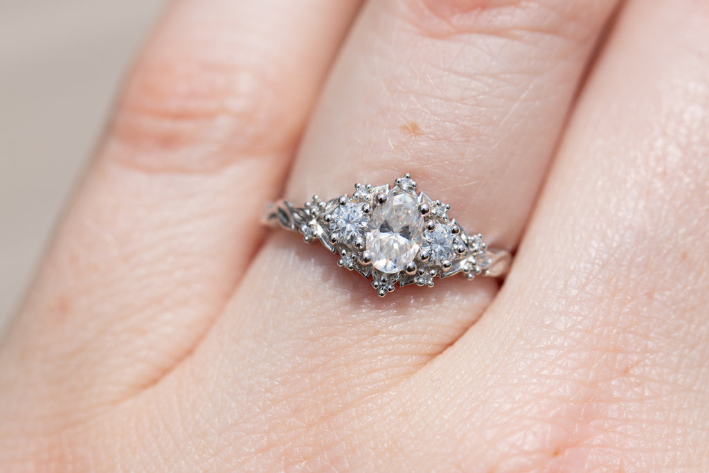 Briar Rose Three Stone with oval moissanite center and round moissanite sides