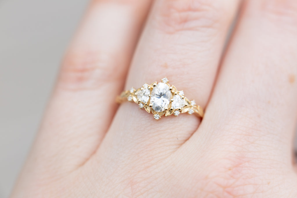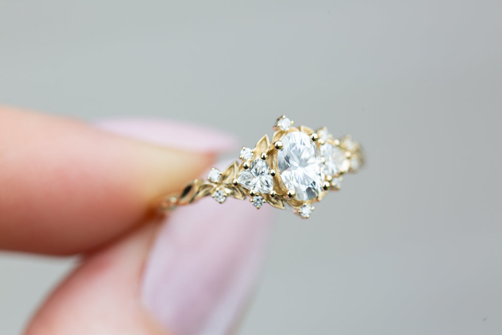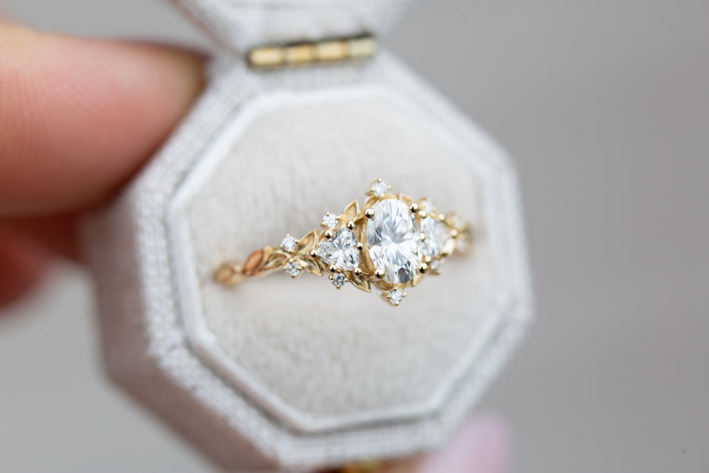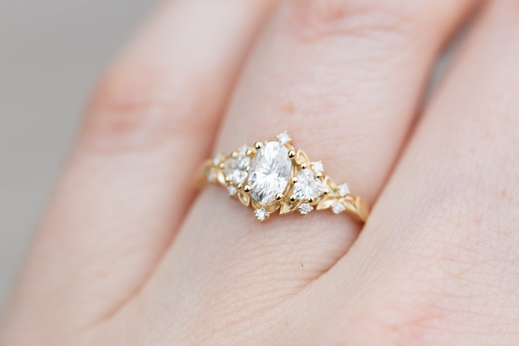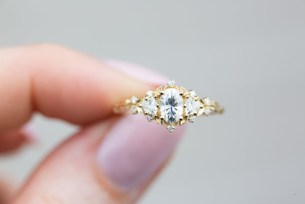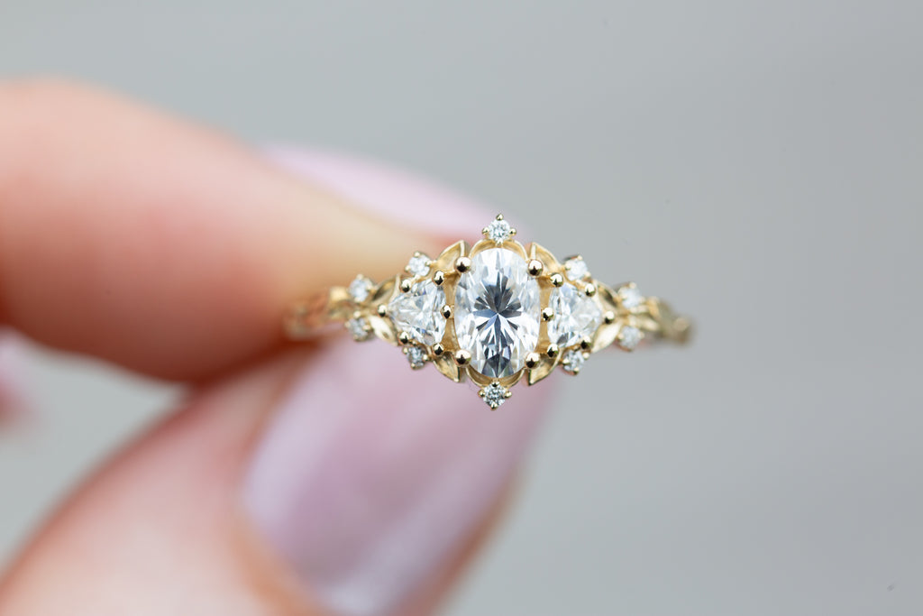 Briar Rose Three Stone with oval moissanite (fairy queen ring)