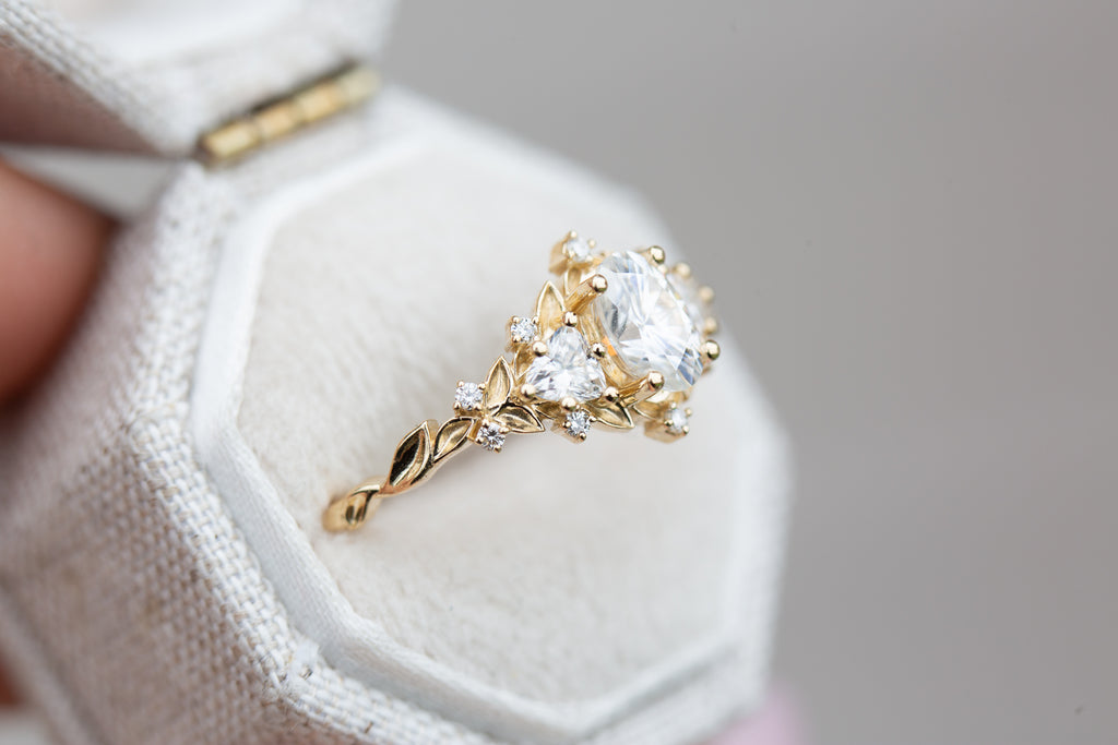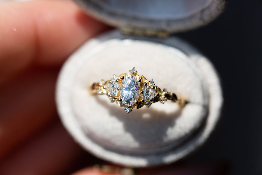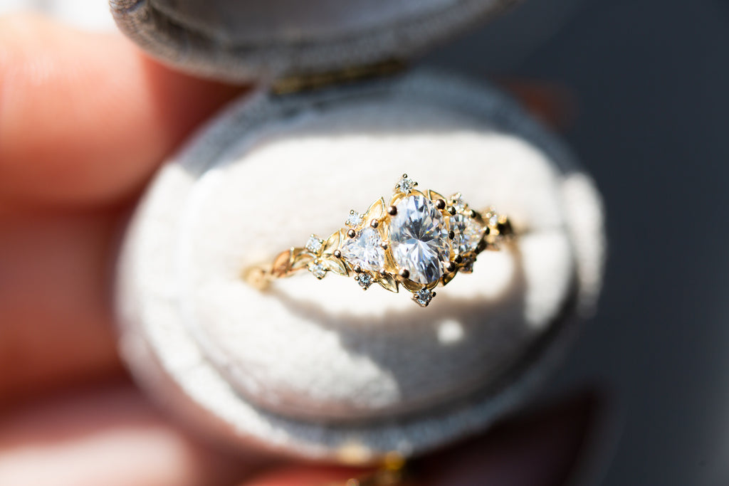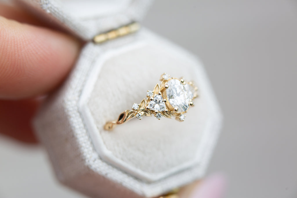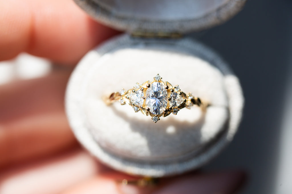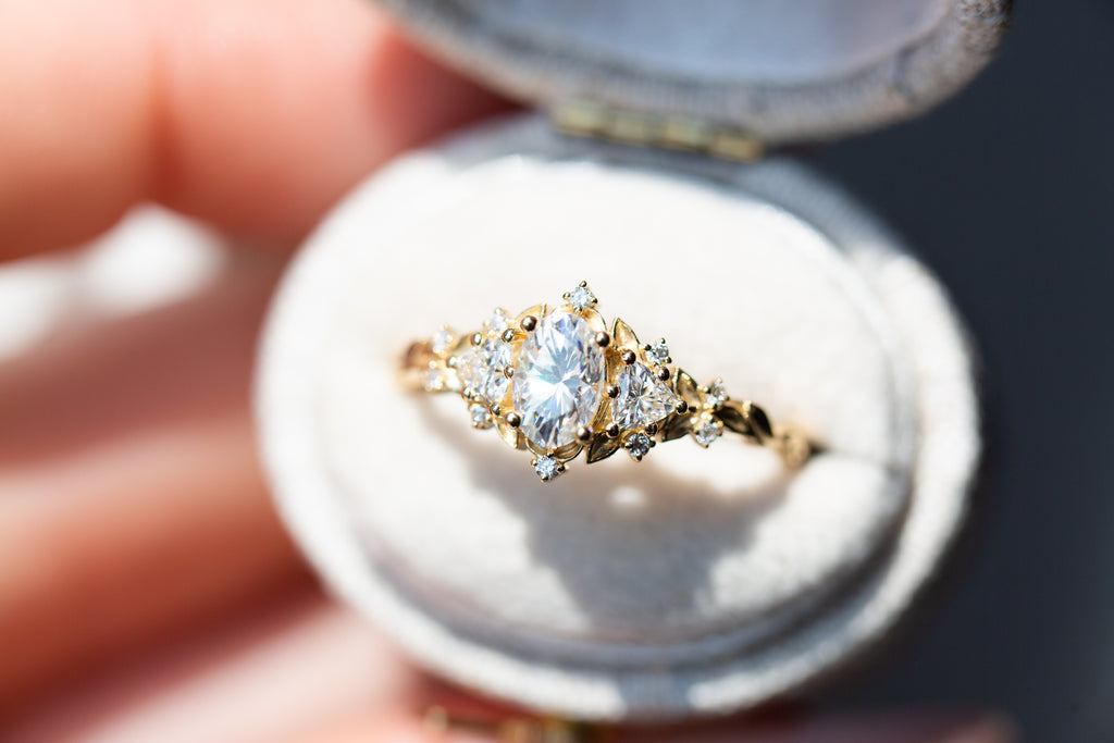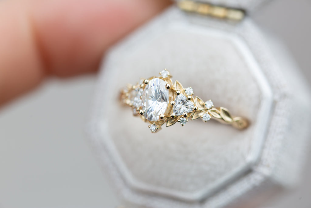 Briar Rose Three Stone with oval moissanite (fairy queen ring)
