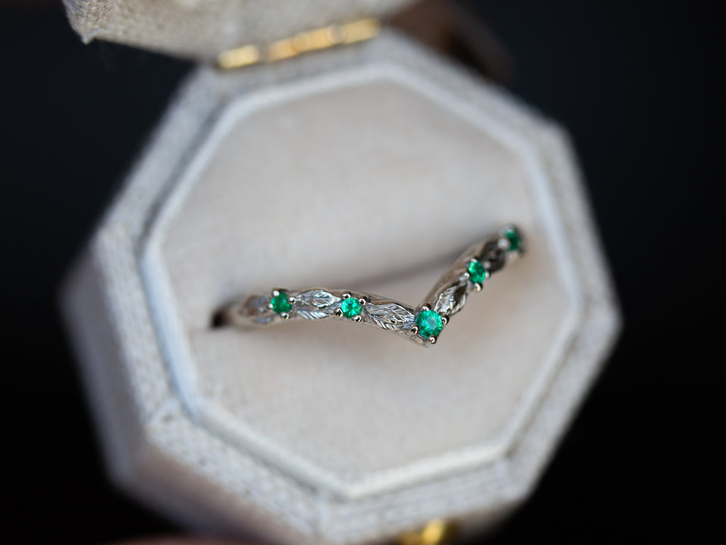 - Four, 1.3mm round natural emerald accents placed along the leaves