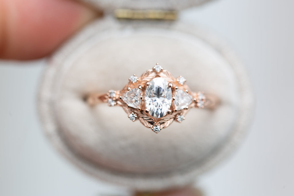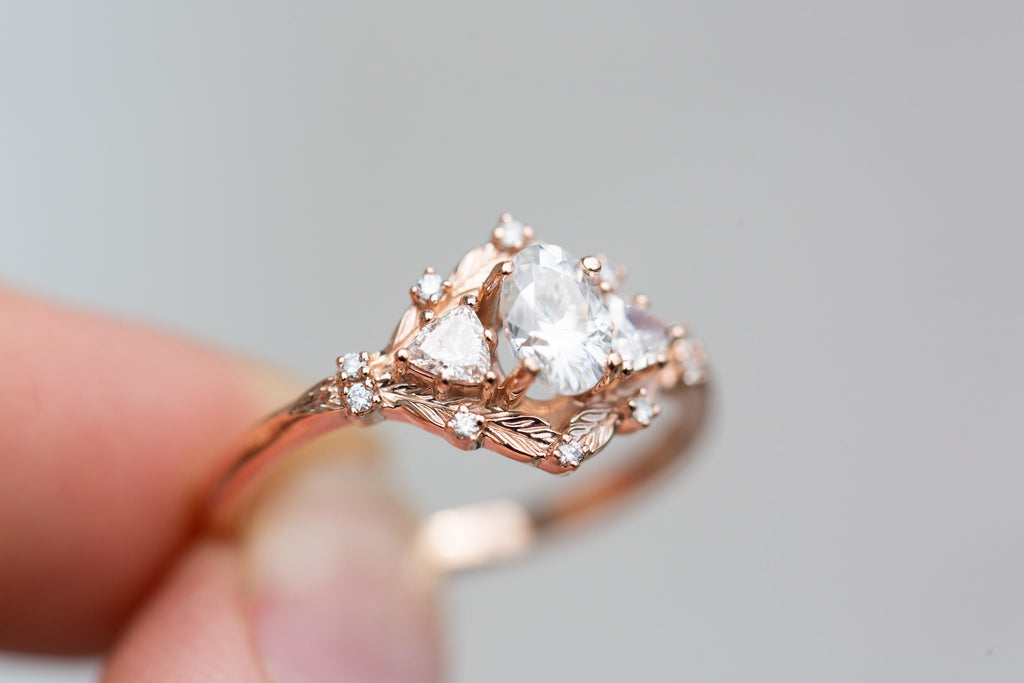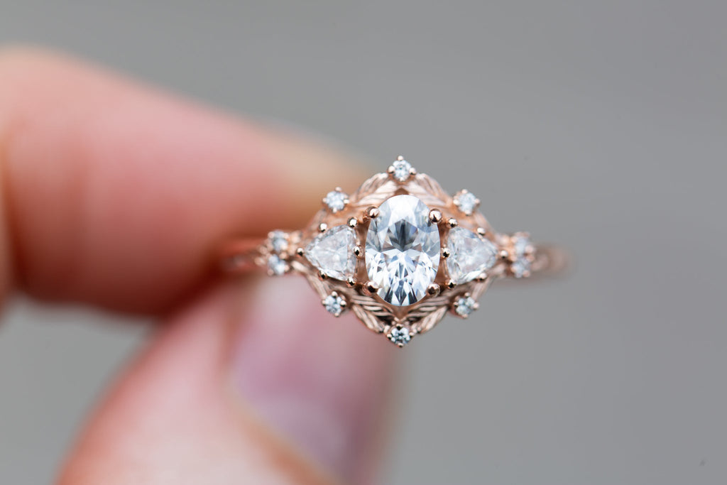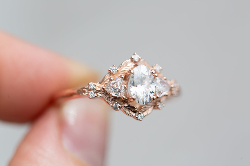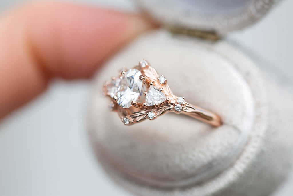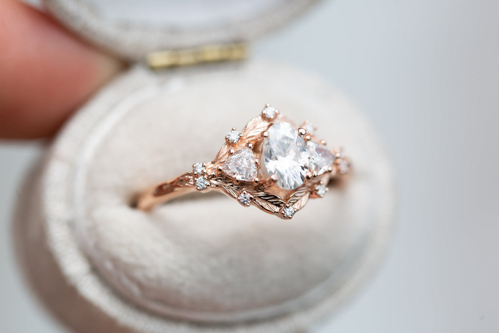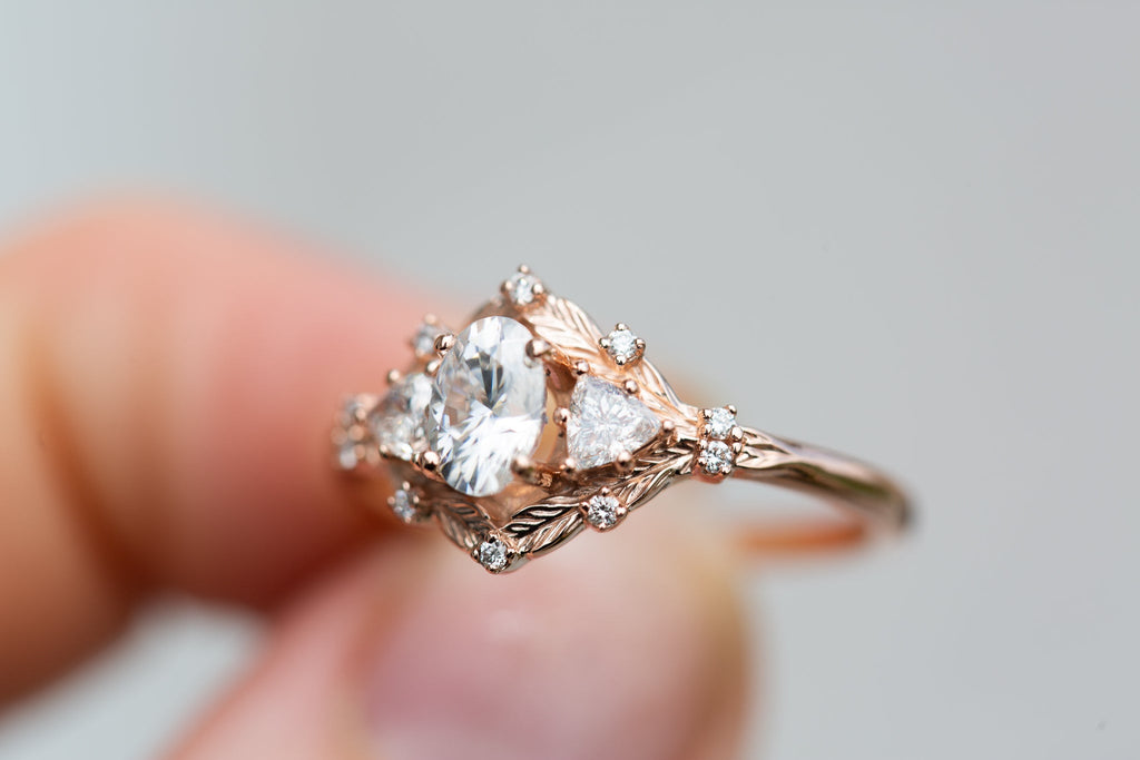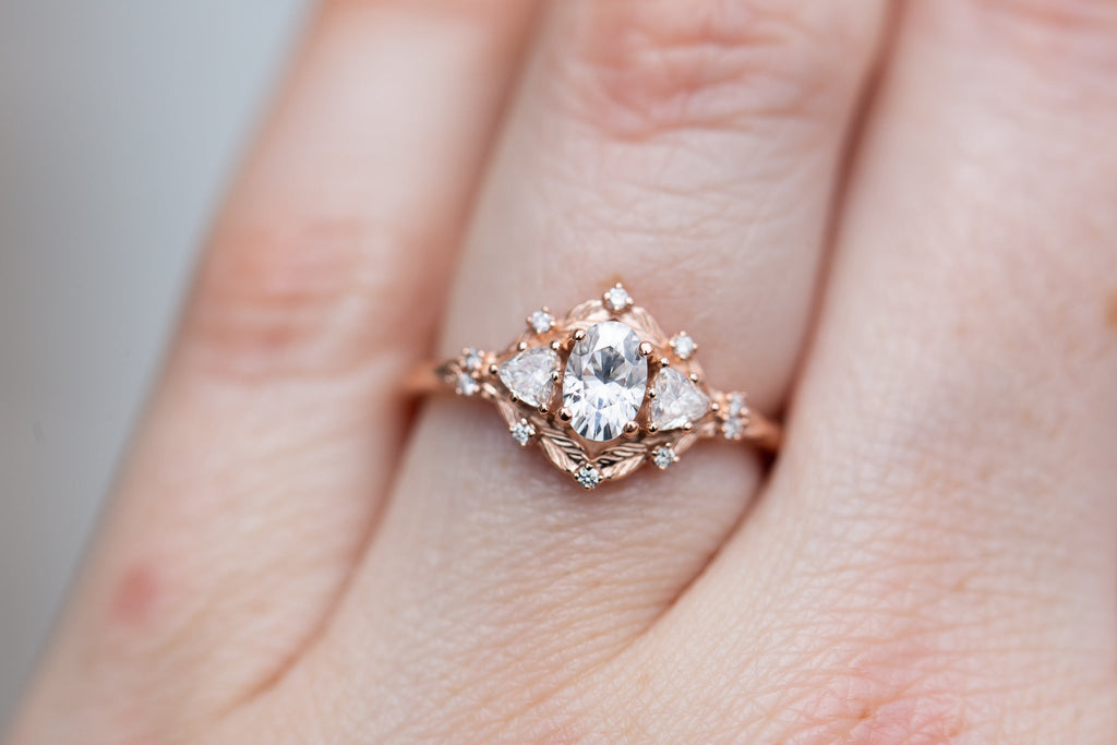 Customize your own Woodland Three Stone with 6x4mm oval center
