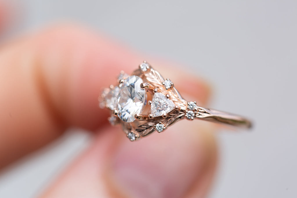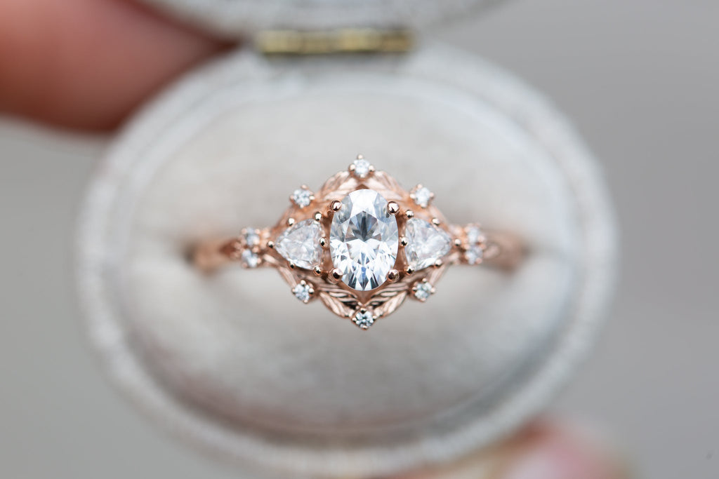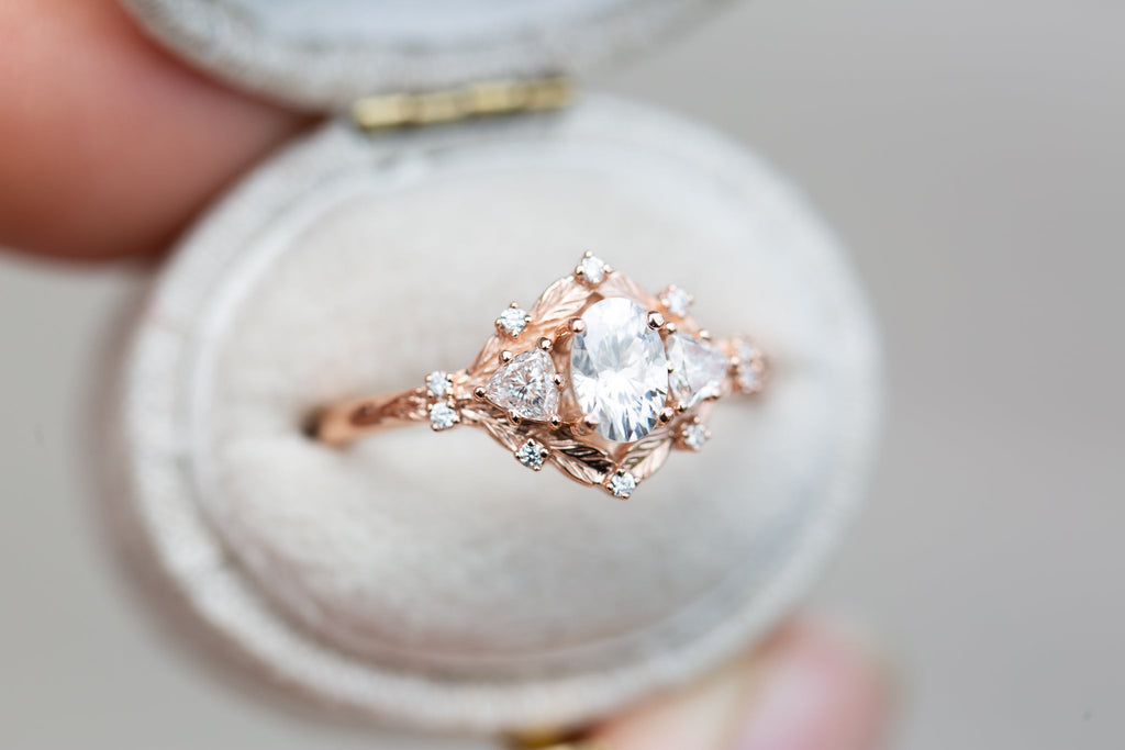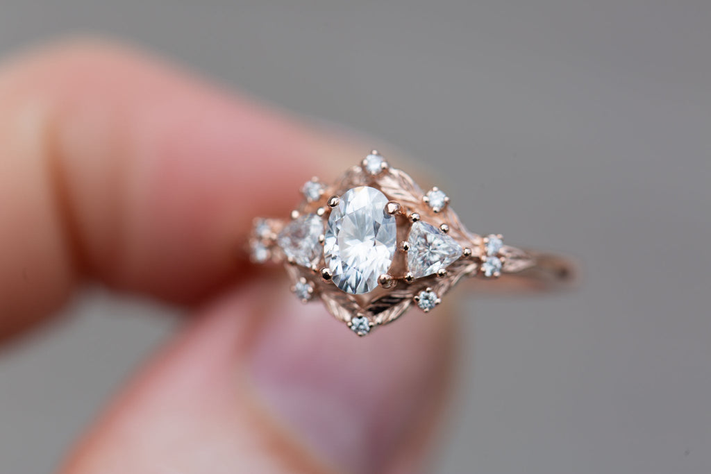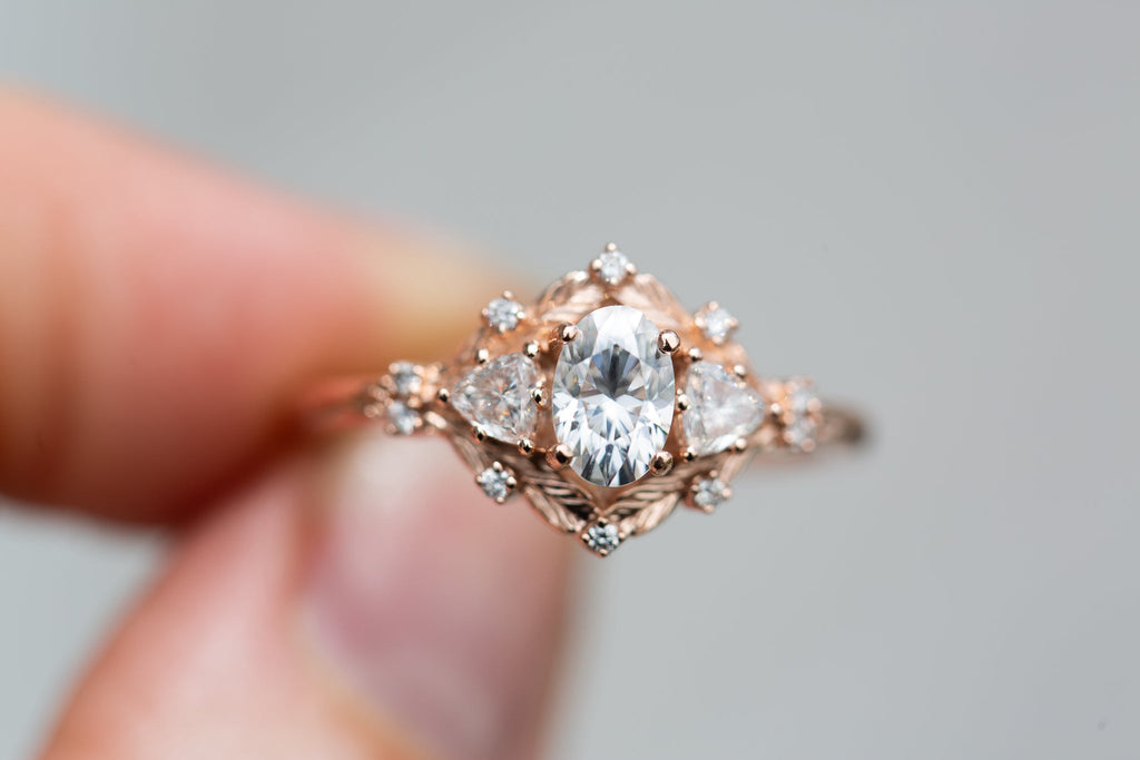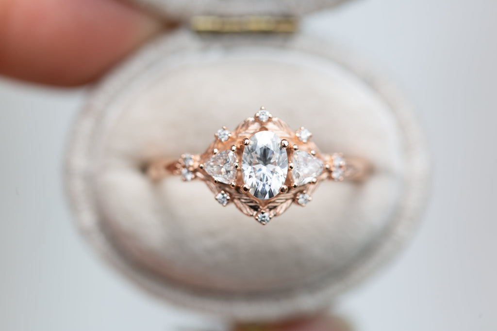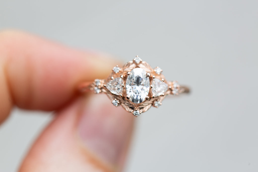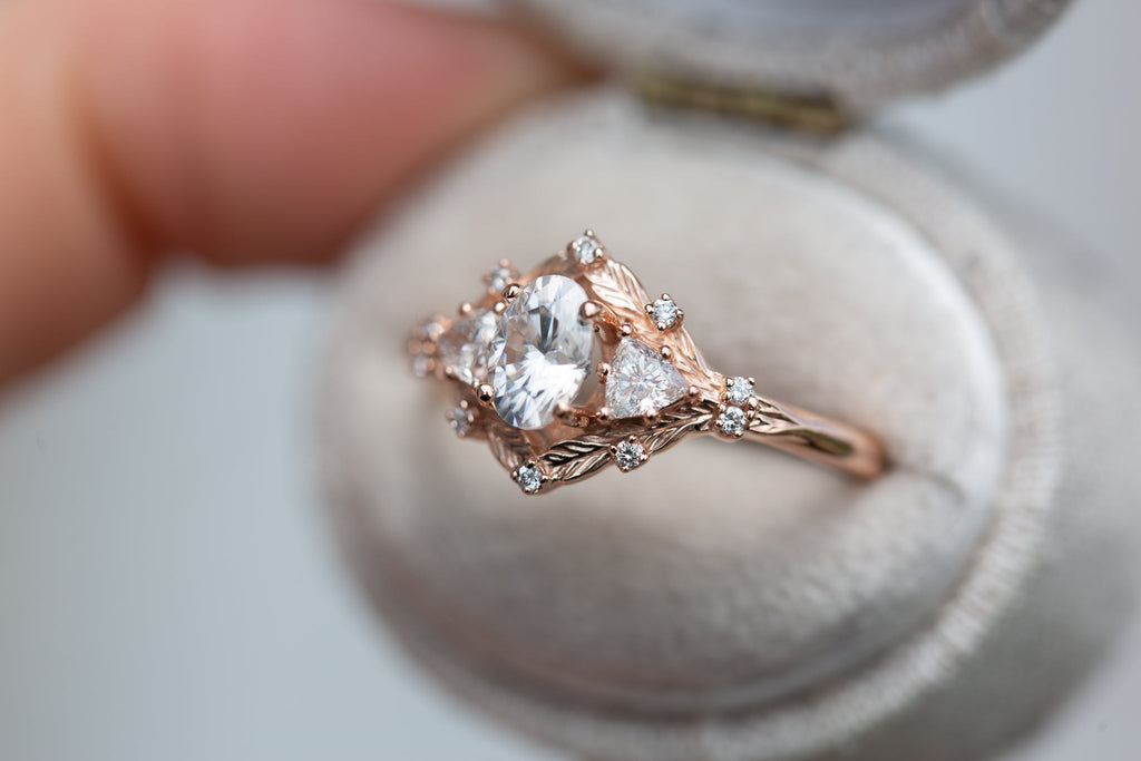 Customize your own Woodland Three Stone with 6x4mm oval center