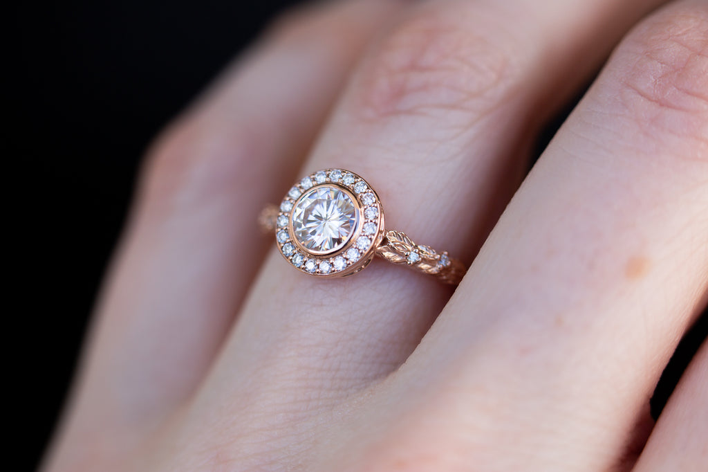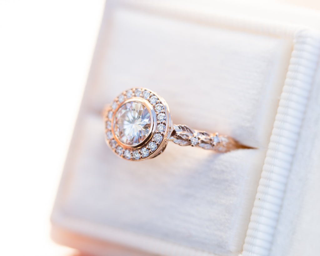 - Small leaves are woven together on each side of the ring, with small bramble type of thorns wrapping around the center stone and slightly down the sides after the leaves.