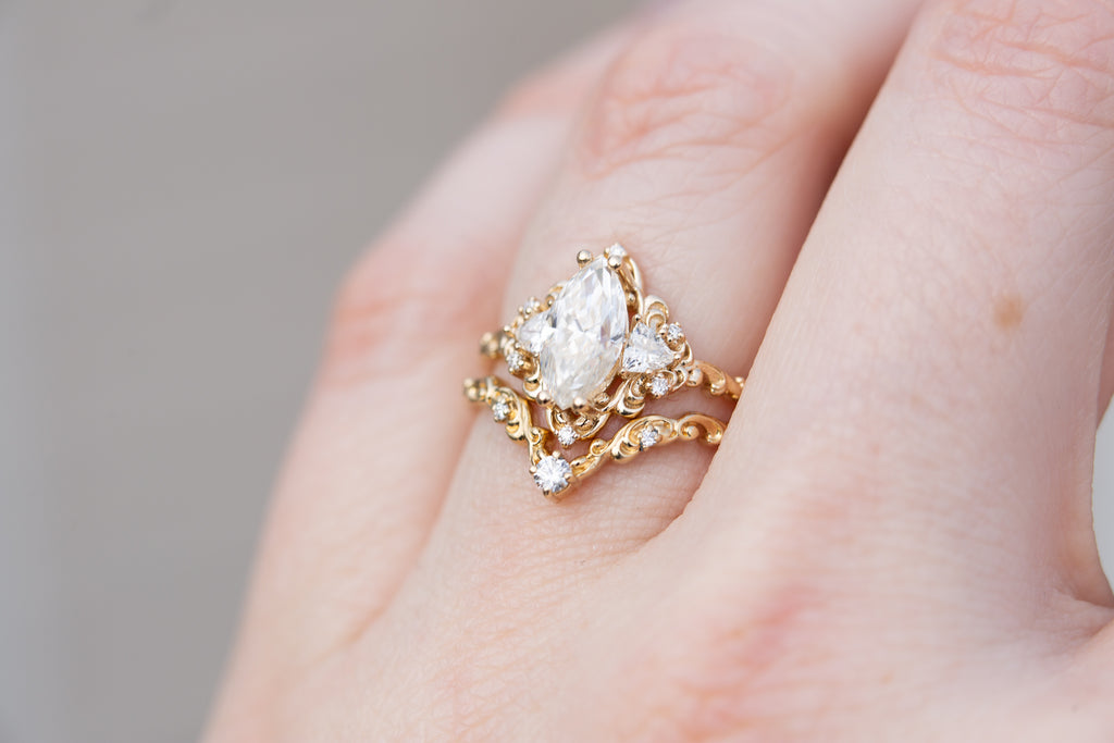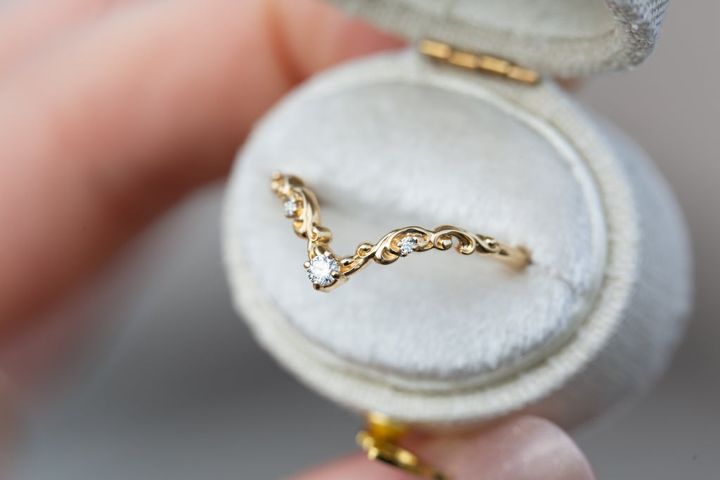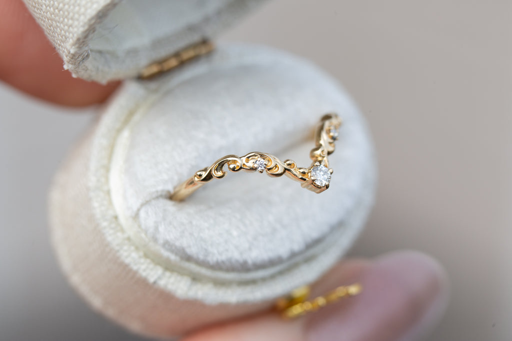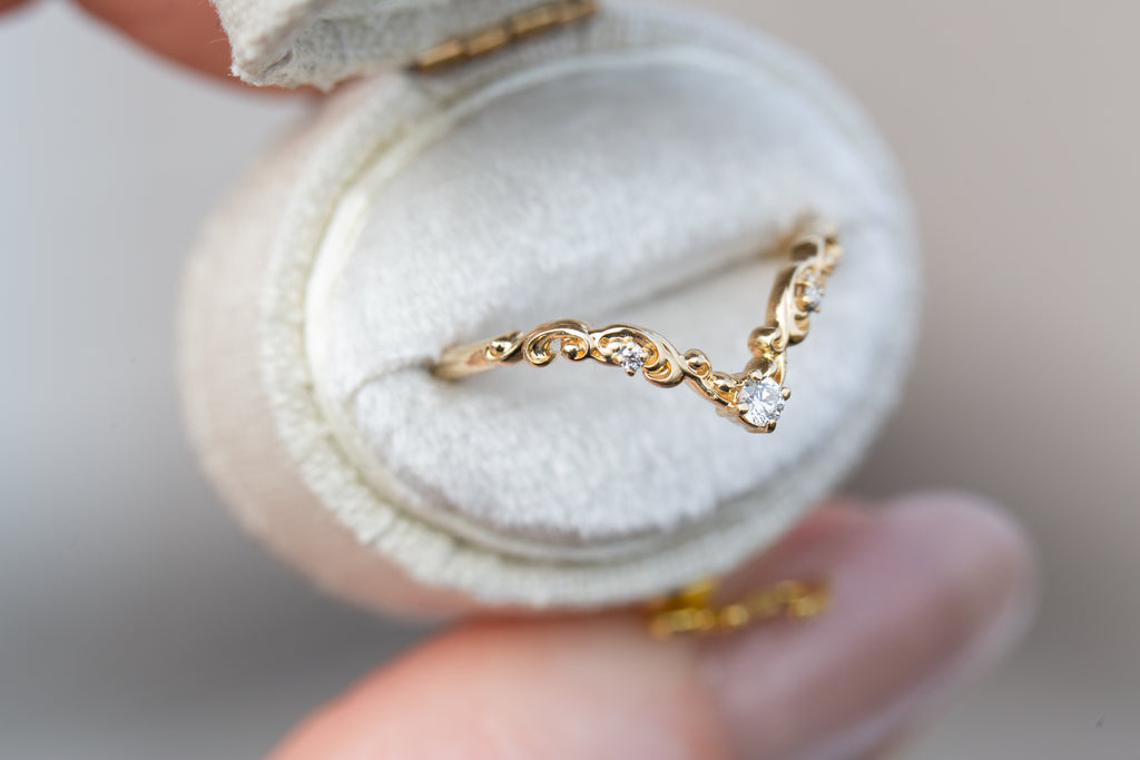 - Deep curved filigree. This is a very deep curve so looks best with my Aurora three stone or another ring that needs a deep curve